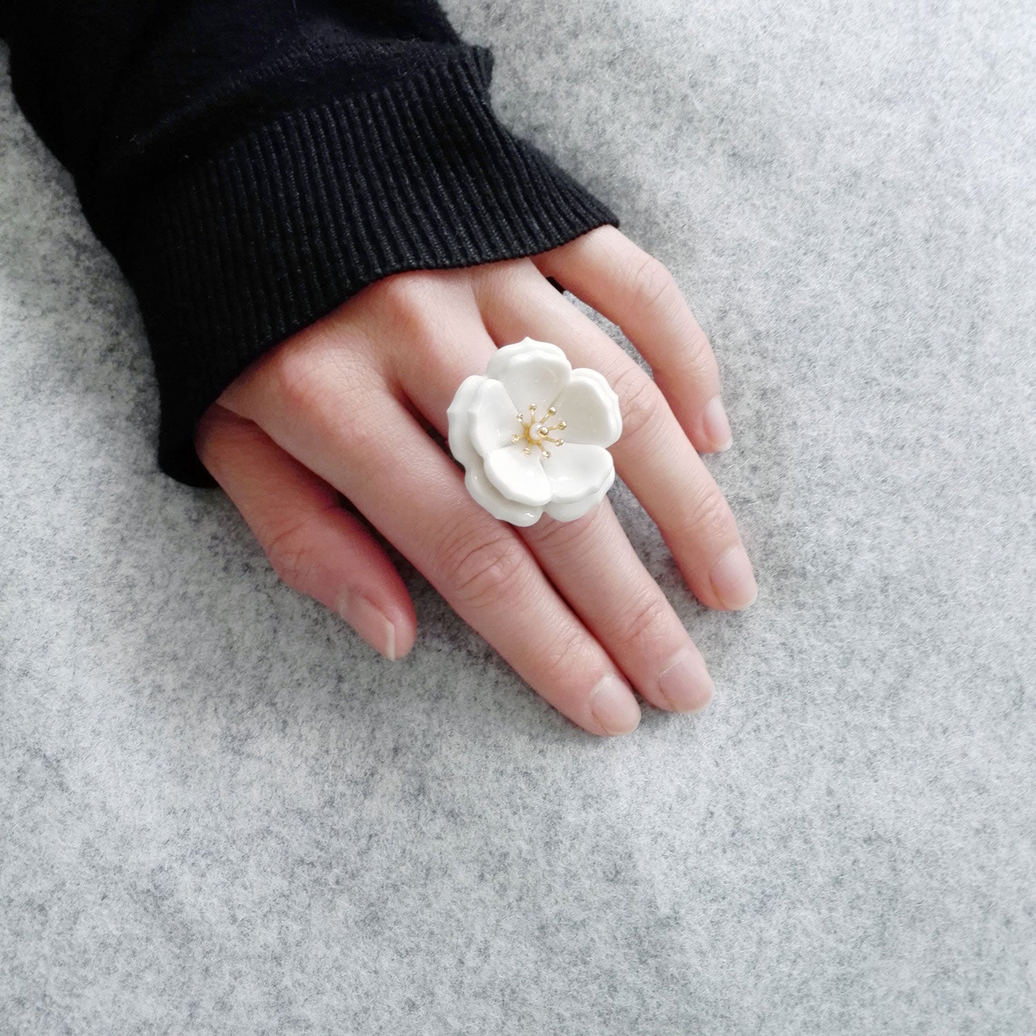 Introducing the Award-winning and sustainably made Porcelain Plum Blossom Statement Ring, a true testament to the beauty and resilience of nature. Inspired by the exquisite petals of the plum blossom, this ring is the perfect symbol of everlasting love and commitment.