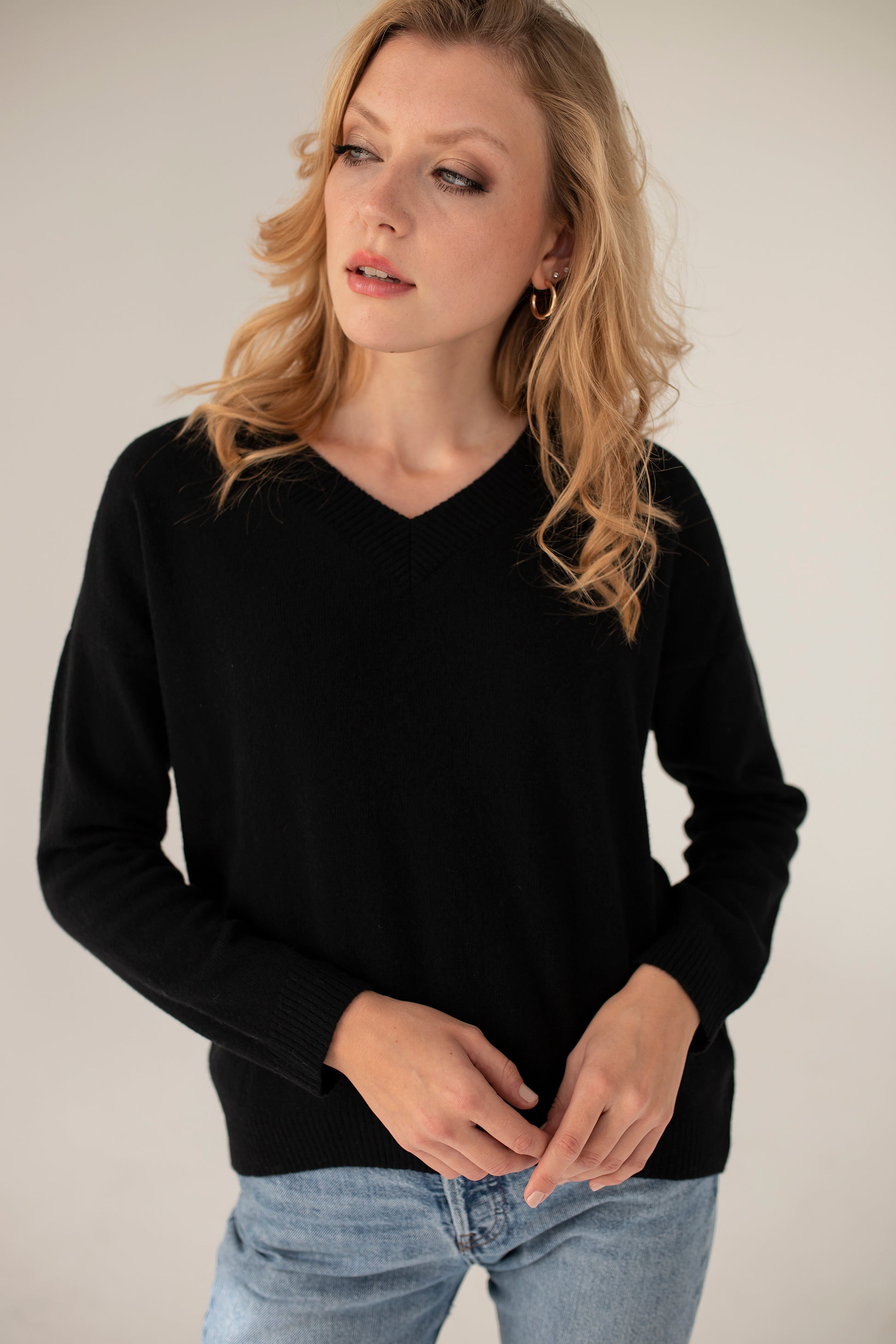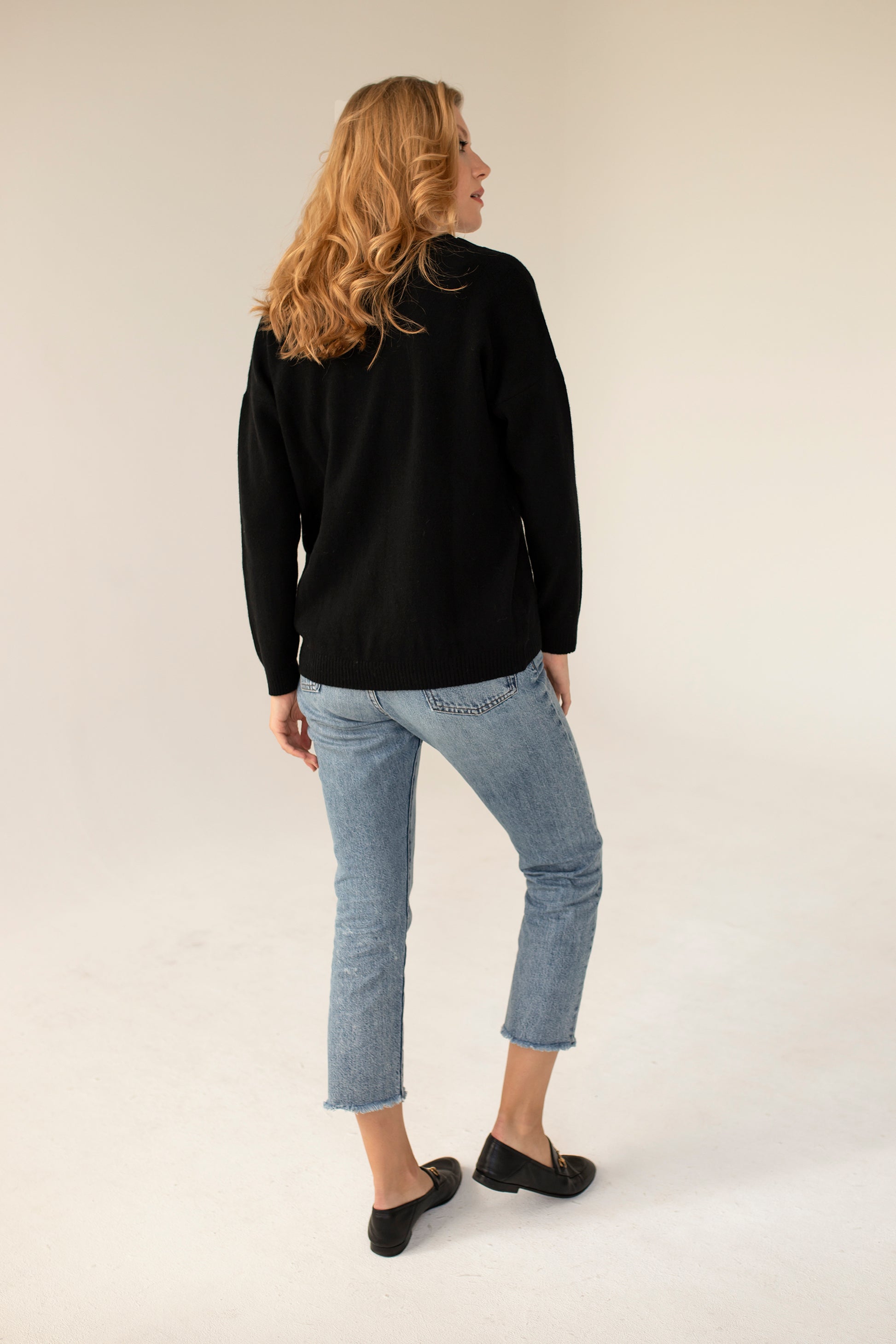 SOMEFANCYNAME.COM brings you a Cashmere Wool Sweater - Black. This lightweight sweater is locally made of extremely soft Cashmere yarn and Merino Wool. It features a classic timeless cut, loose fit, and kimono sleeves, a slightly dropped shoulder for freedom of movement.