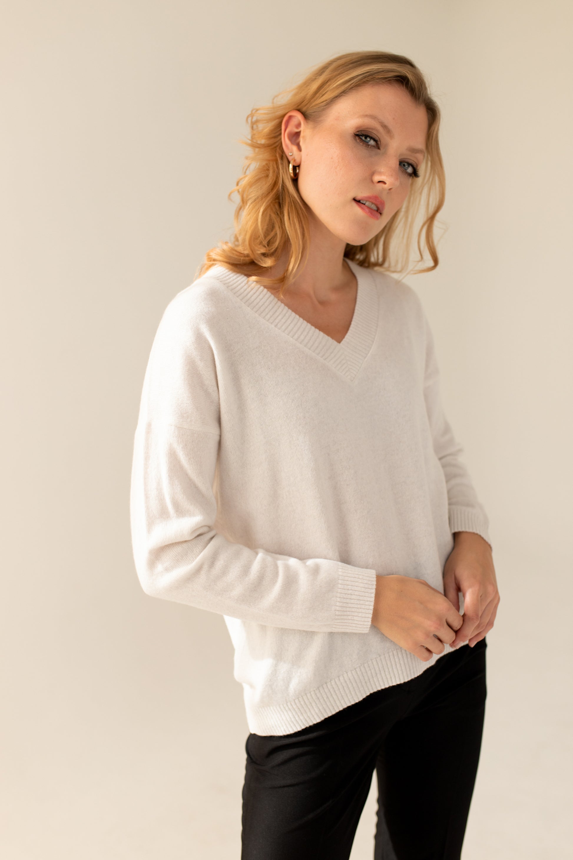 SOMEFANCYNAME.COM brings you a Cashmere Wool Sweater - Ecru. This lightweight sweater is locally made of extremely soft Cashmere yarn and Merino Wool. It features a classic timeless cut, loose fit, and kimono sleeves, a slightly dropped shoulder for freedom of movement.