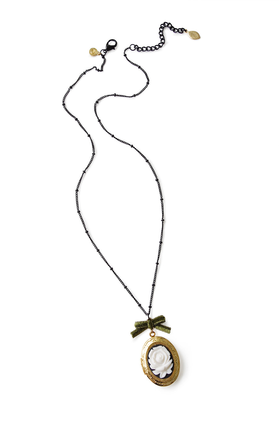 Featuring a dark romantic look with a black and gold tone finish, this necklace is truly a showstopper. The highlighted olive green velvet ribbon bow adds a touch of elegance, completing the overall design.