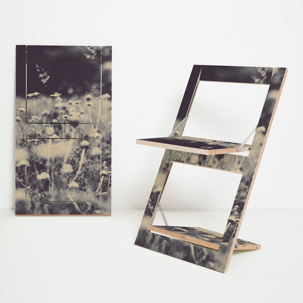 FLÄPPS is a mere 20 mm flat and is available in black, white, and art-printed versions. The beautiful art prints make it a fashionable decorative object even when folded. Easy to open and easy to close with a single snap. A chair to stow, print, and adore.