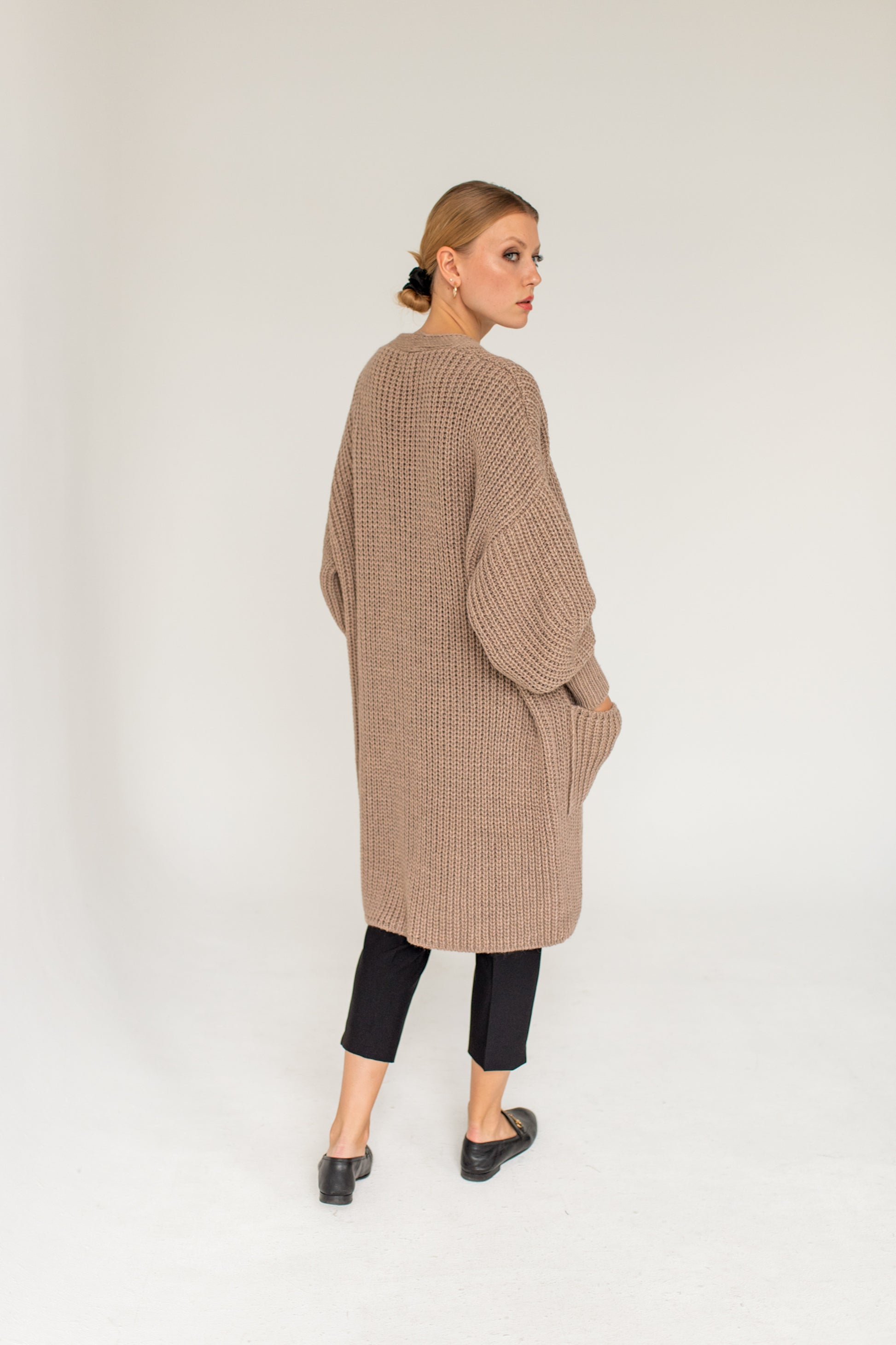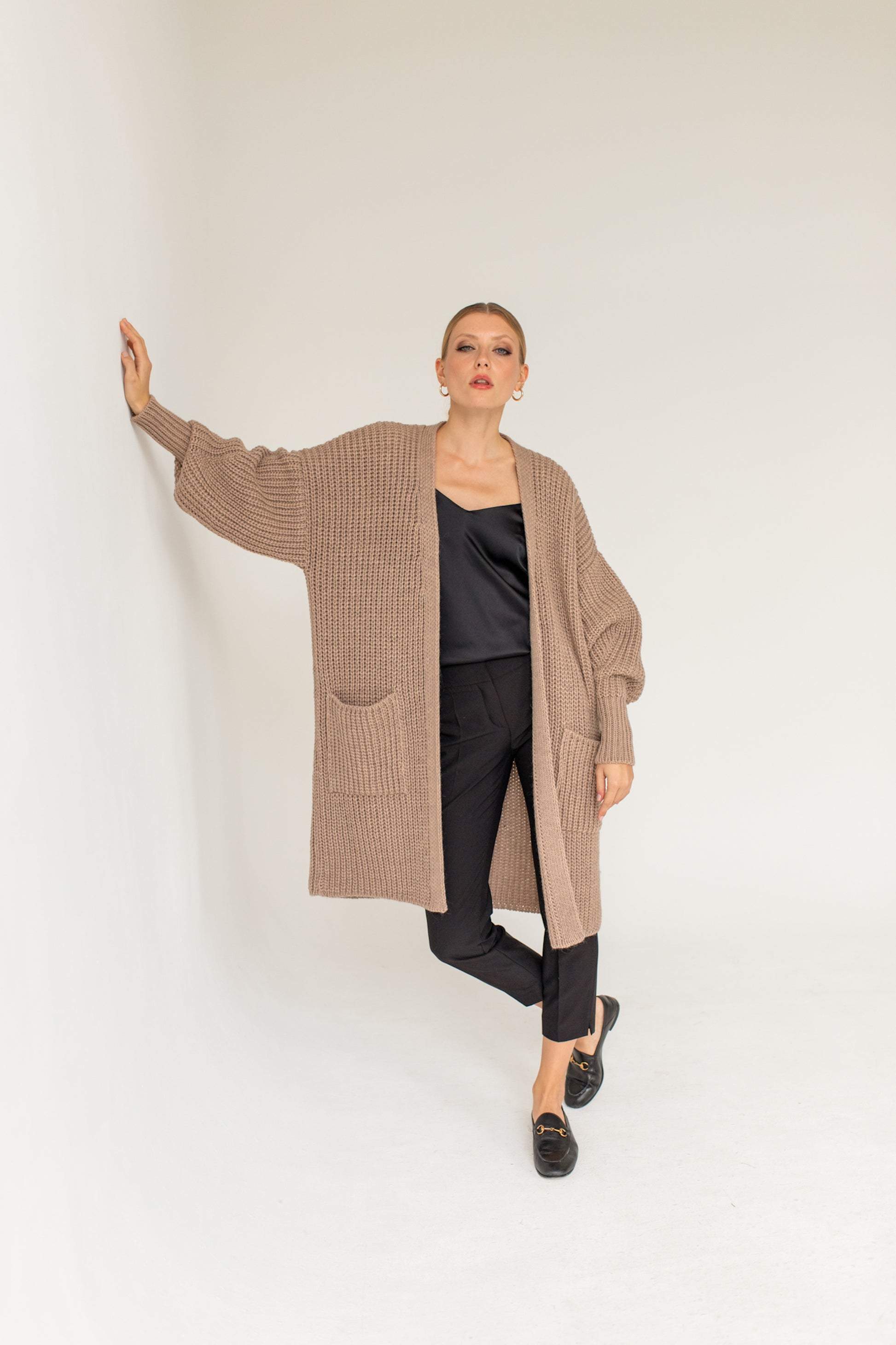 SOMEFANCYNAME.COM brings you a Merino Wool Cardigan - Black. It is a long sweater locally made of premium Merino wool yarn for optimal softness. It features a loose fit with slightly kimono sleeves and dropped shoulders for increased mobility. An elegant design detail is a puff-sleeve welt at the cuff.