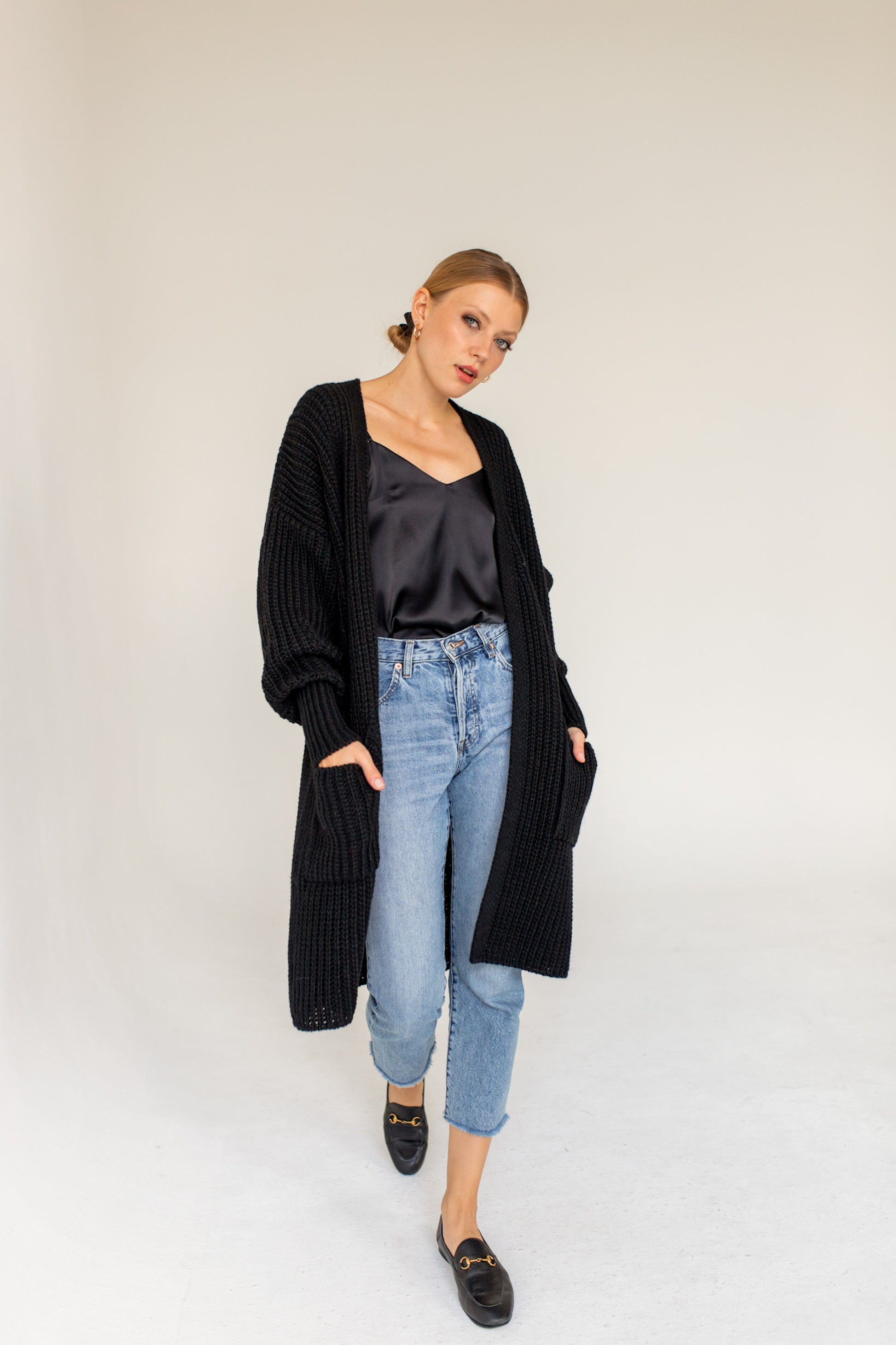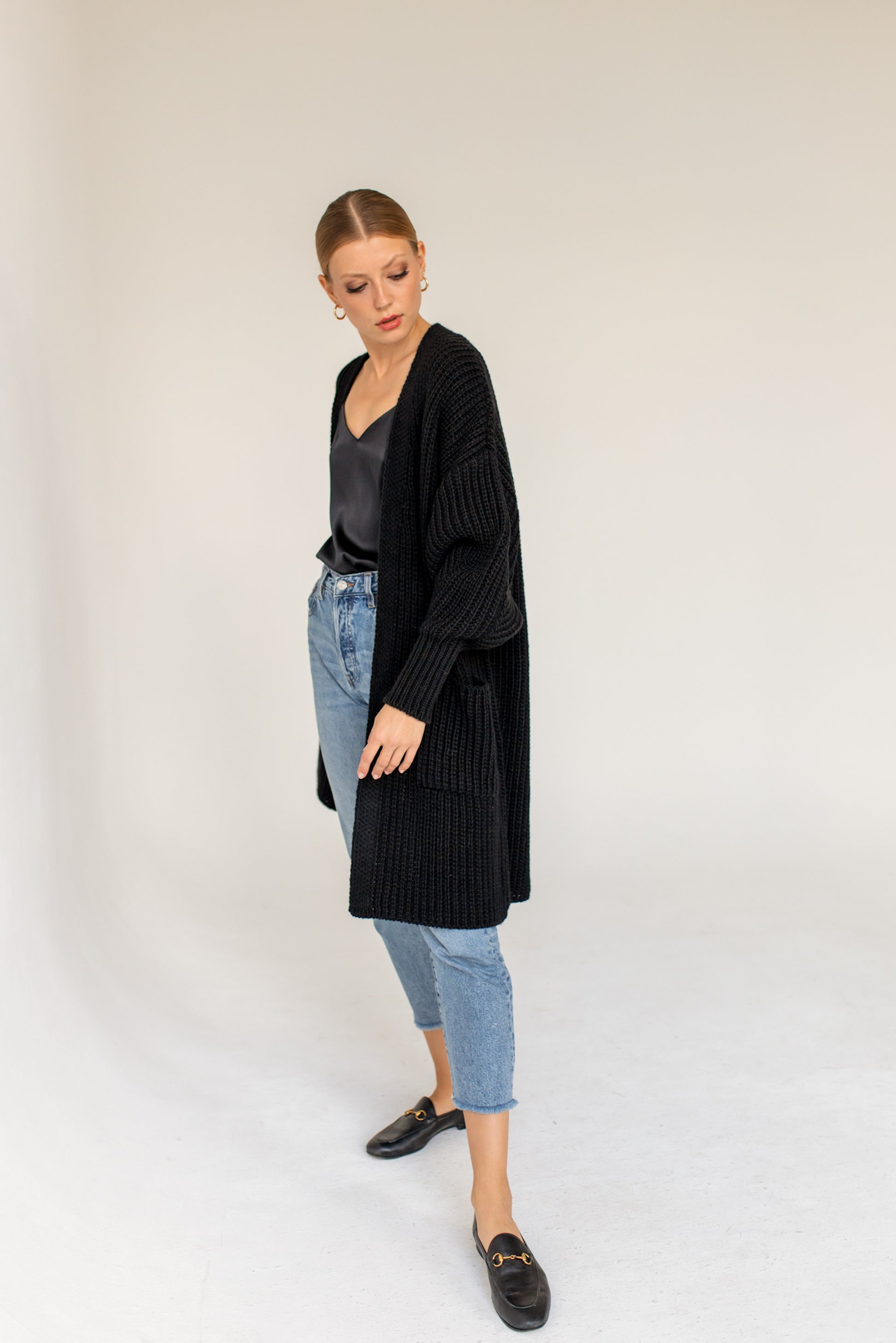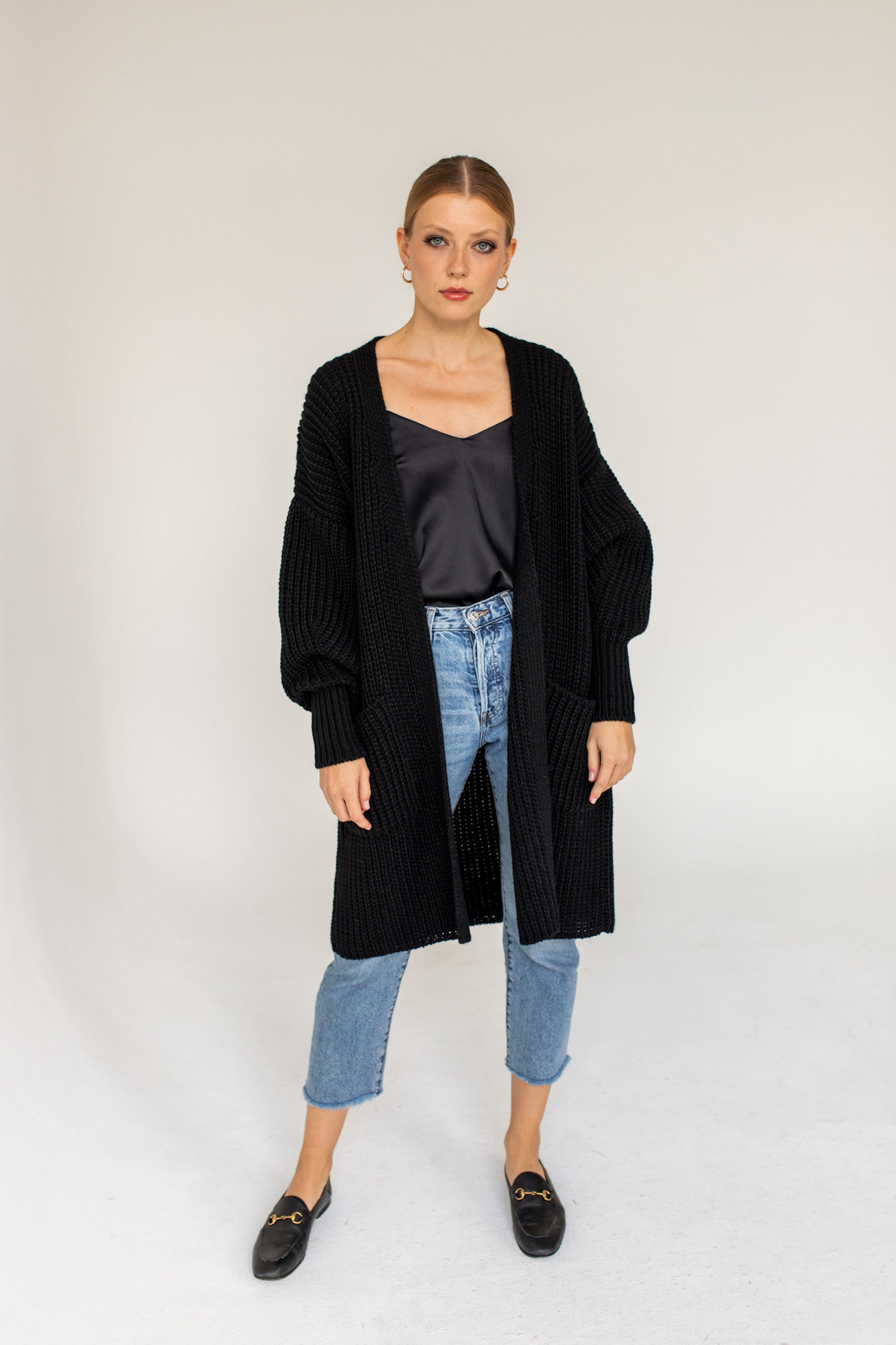 SOMEFANCYNAME.COM brings you a Merino Wool Cardigan - Black. It is a long sweater locally made of premium Merino wool yarn for optimal softness. It features a loose fit with slightly kimono sleeves and dropped shoulders for increased mobility. An elegant design detail is a puff-sleeve welt at the cuff.