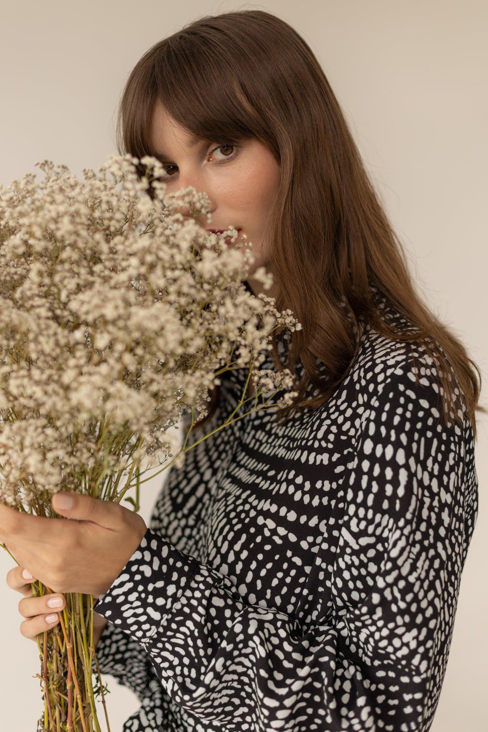 This midi-length shirt dress is the perfect everyday dress! Crafted from soft and lightweight viscose fabric, the dress features a loose, oversized cut, a small shirt collar, loose sleeves with cuffs fastened by two grey pearl buttons, and tucked-in side pockets. It has a rounded bottom with small slits on the sides and a matching belt.