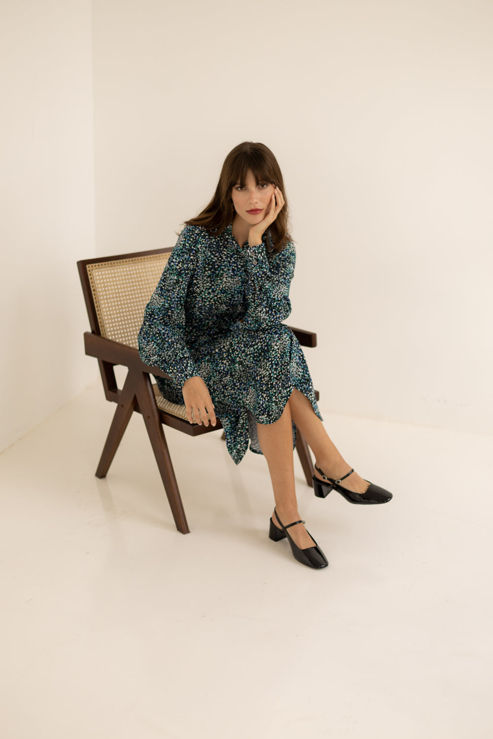 With a small print of green, violet, and white dots on a black background, the dress can also be styled with a matching belt. It has a rounded bottom with small slits on the sides.