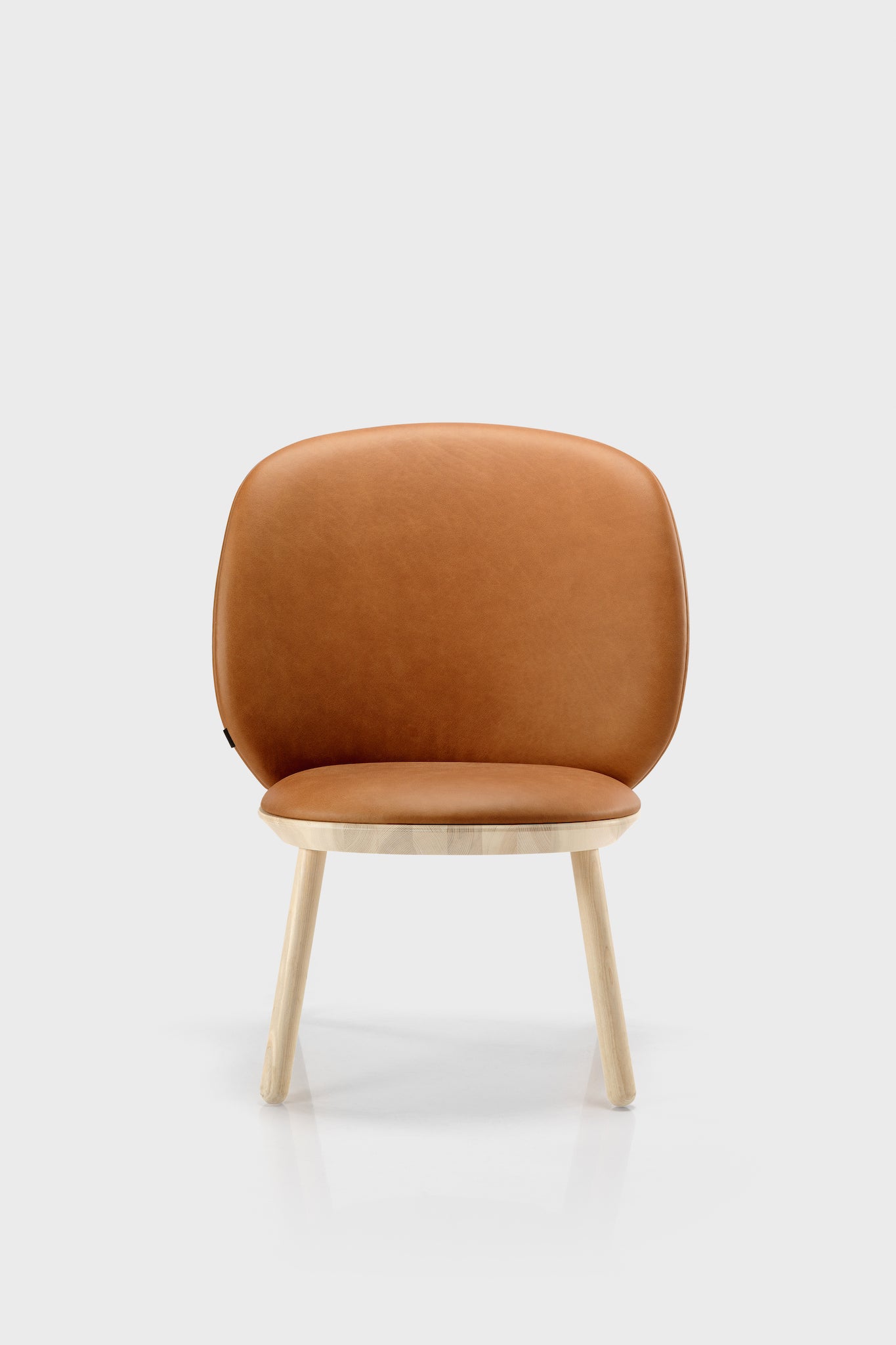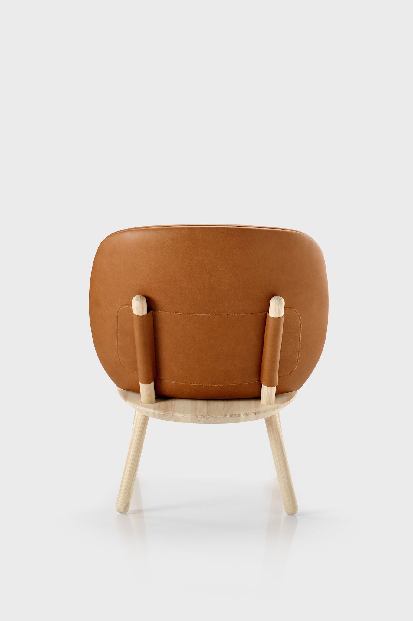 Being the youngest member of the Naïve family, Naïve Low Chair introduces itself with a bright, yet mature and subtle look. This made-to-order accent chair features a large leather strap that holds the backrest attached to the body. A firm connection between wood and leather serves its function and makes it visually distinctive.