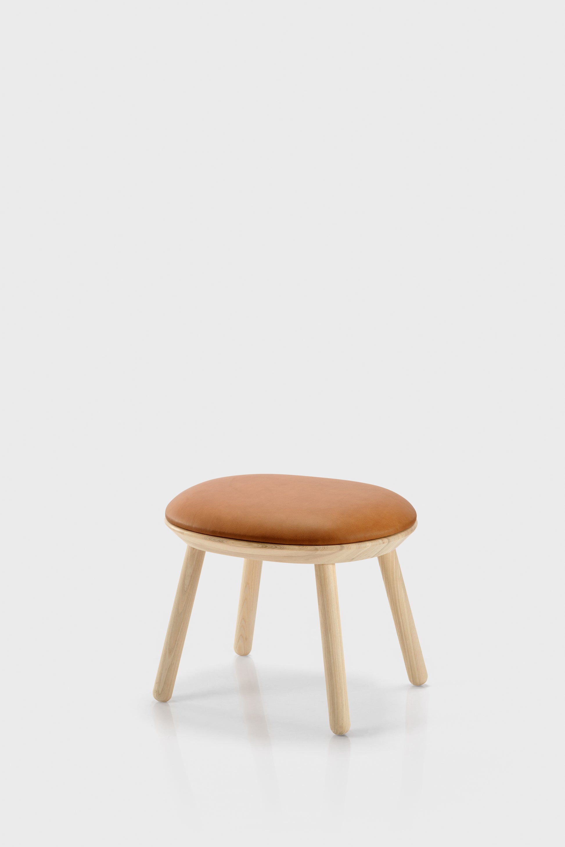Just like the made-to-order Naïve Low Chair, the Naïve Ottoman comes in different colors, with the frame being either black or oiled ash wood. The padding is made to aesthetically accommodate the frame, whereas all the solid links between the different materials result in a highly reliable piece of furniture.