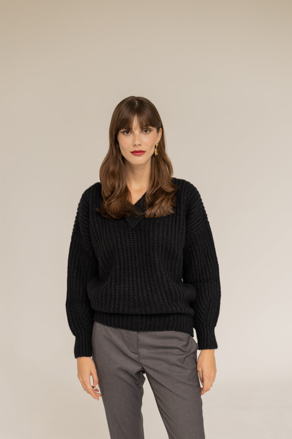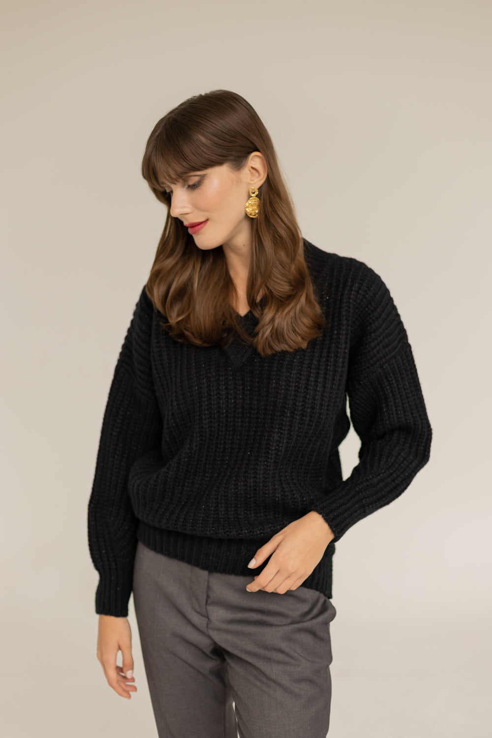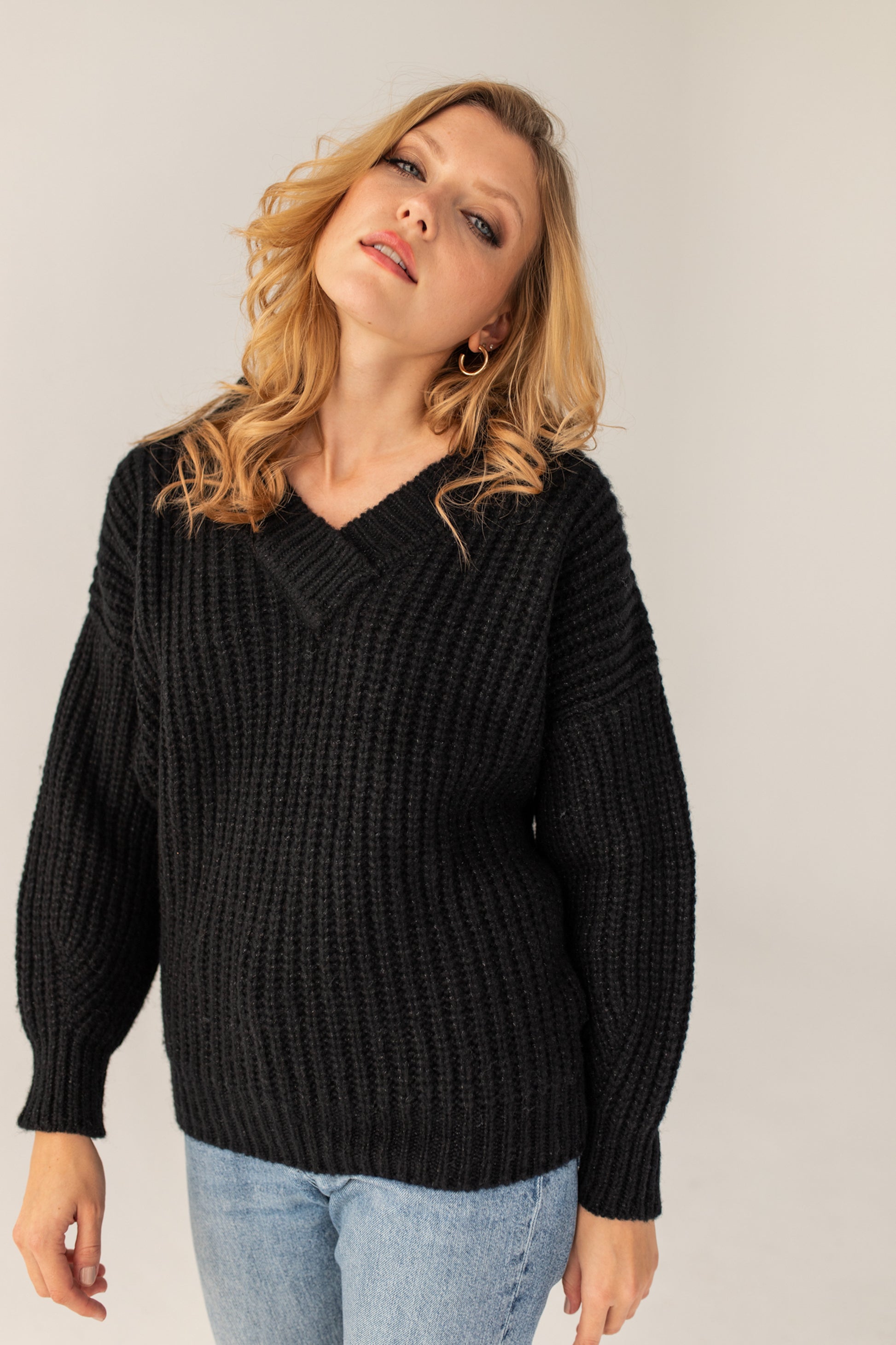 SOMEFANCYNAME.COM brings you a Victoria Merino Wool Sweater - Black. It is locally made of extremely soft Merino yarn with a loose and thick weave. The sweater features a loose oversized cut, V-neck, wide and comfortable sleeves, and a slightly dropped shoulder for freedom of movement.