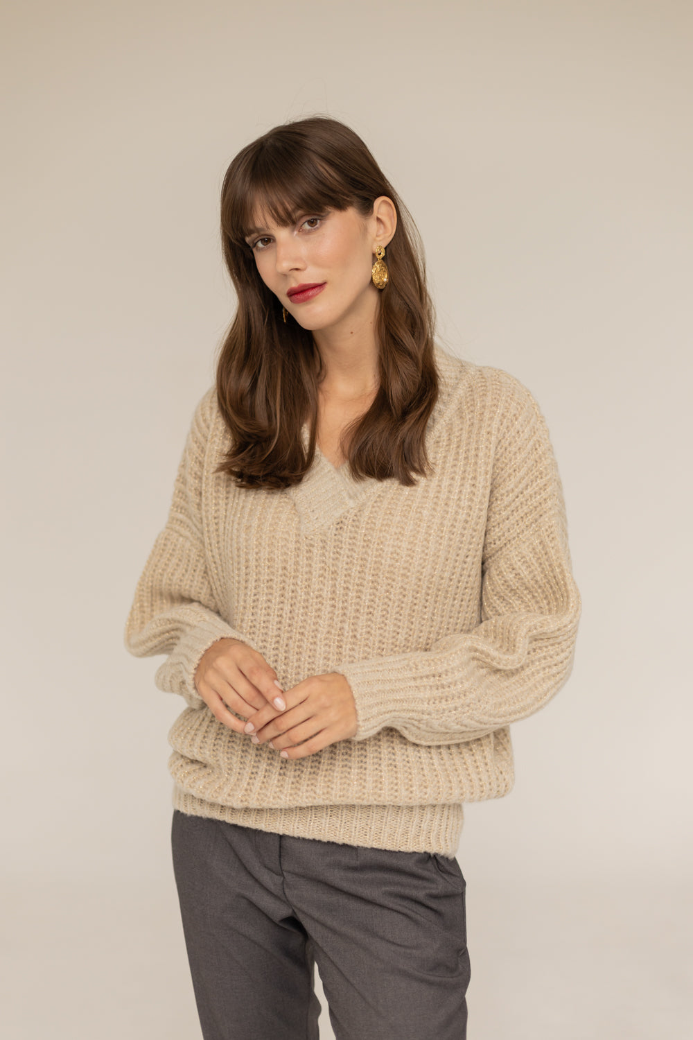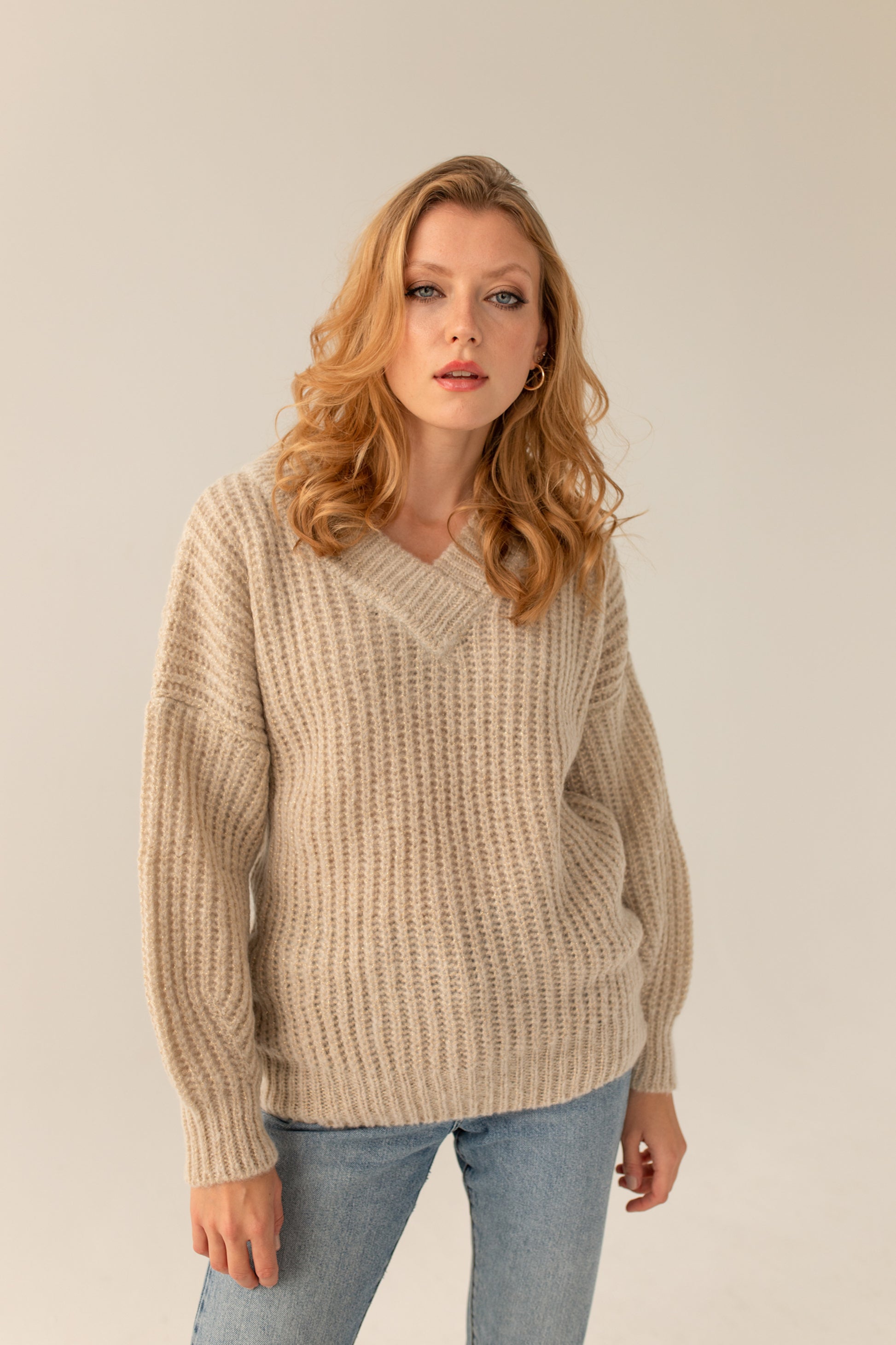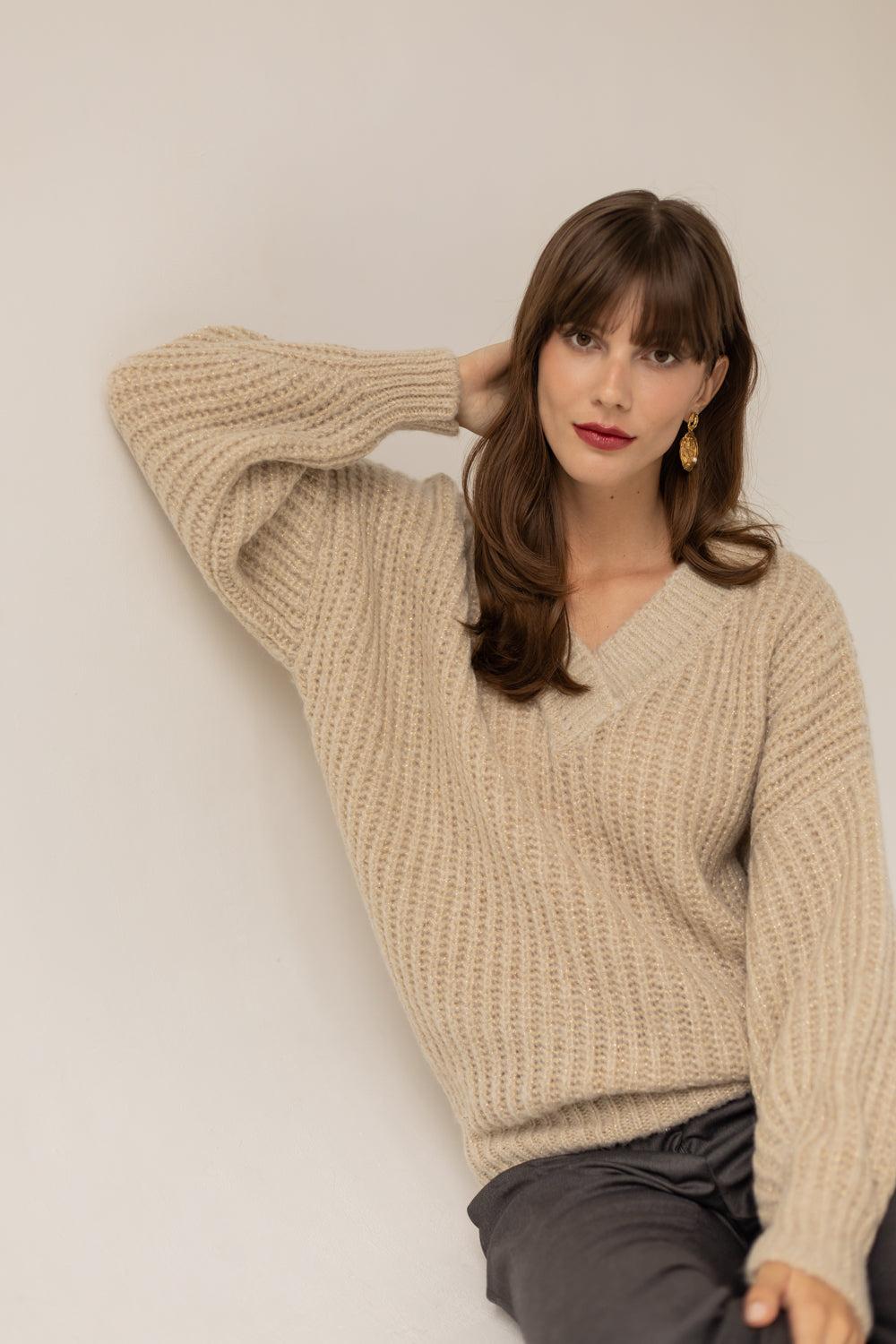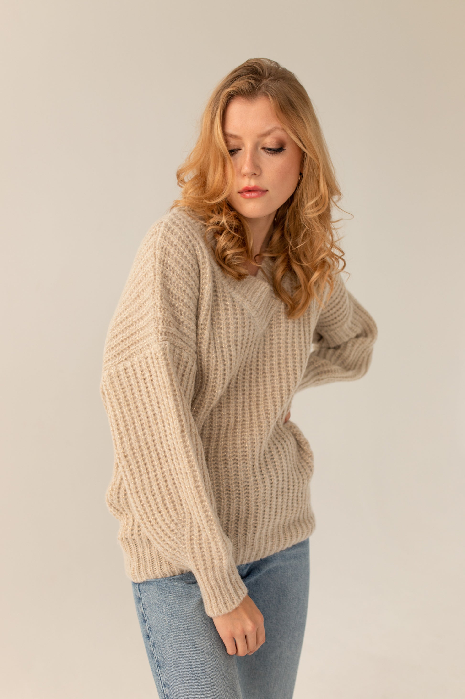 SOMEFANCYNAME.COM brings you a Victoria Merino Wool Sweater - Golden Beige. It is locally made of extremely soft Merino yarn with a loose and thick weave. The sweater features a loose oversized cut, V-neck, wide and comfortable sleeves, and a slightly dropped shoulder for freedom of movement.