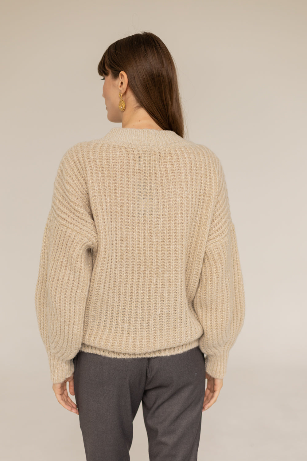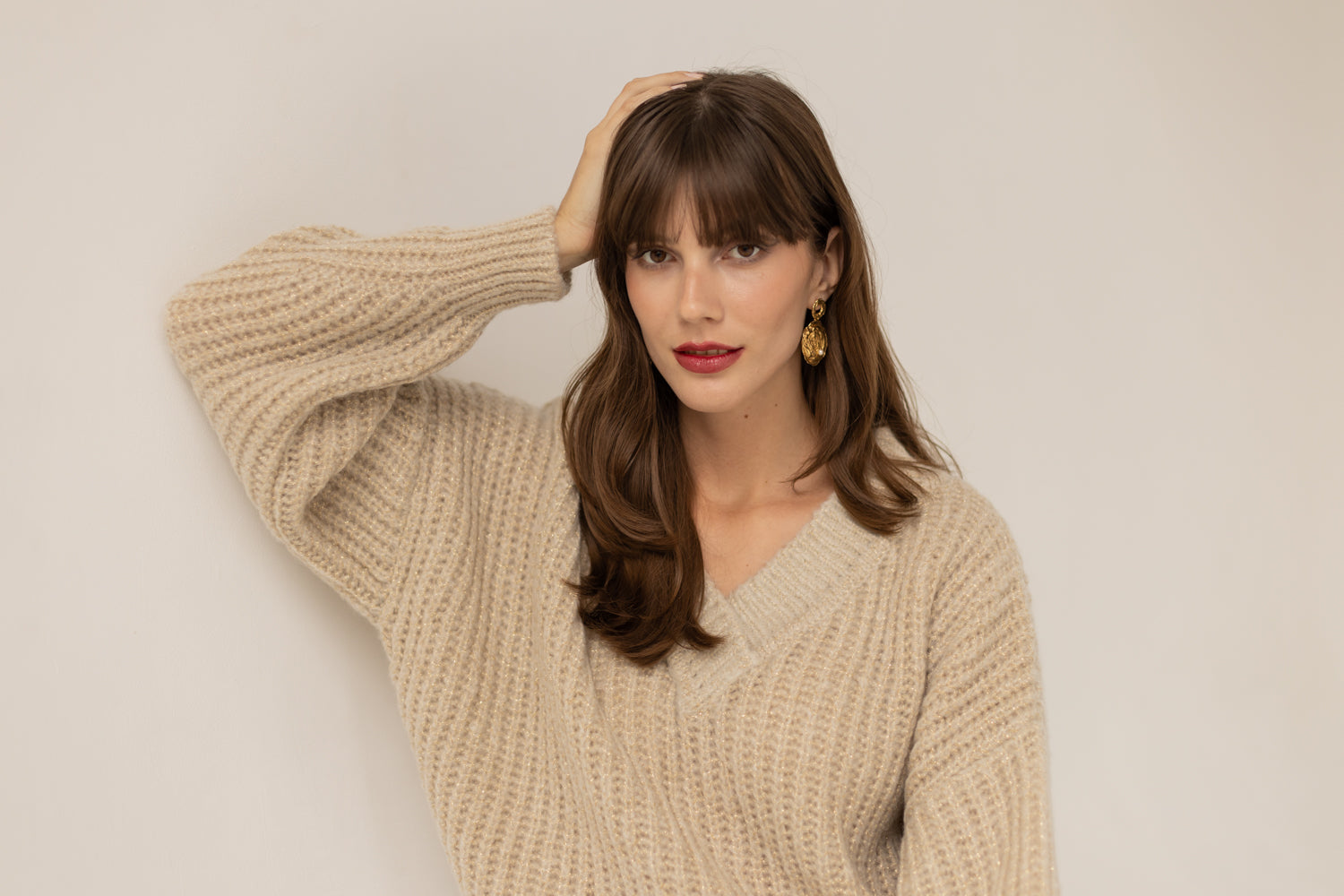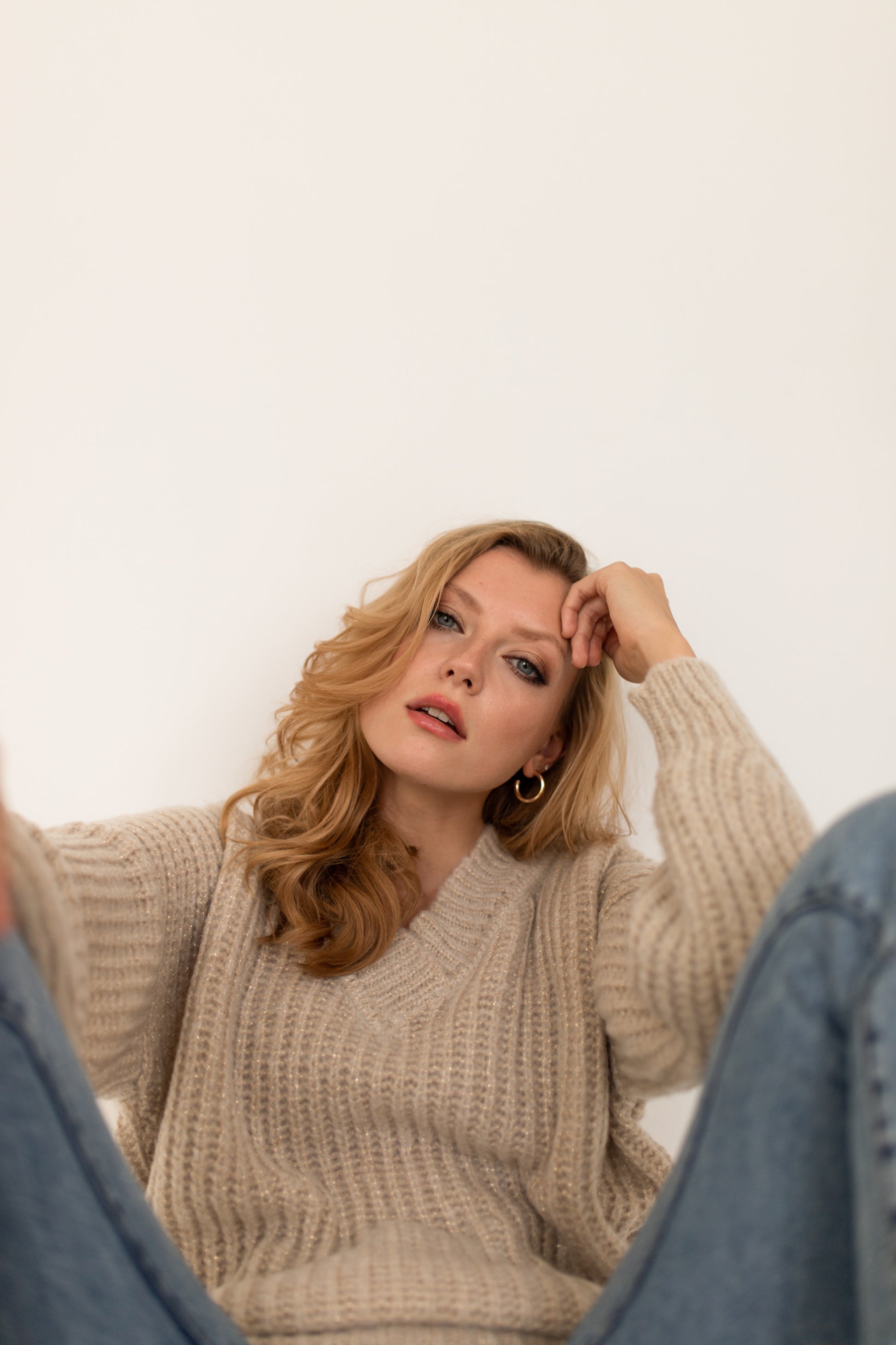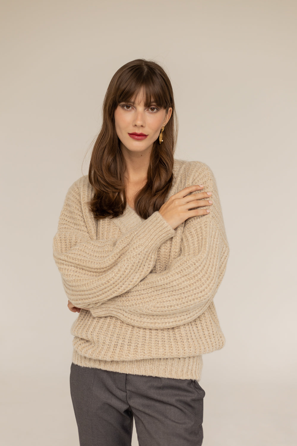 SOMEFANCYNAME.COM brings you a Victoria Merino Wool Sweater - Golden Beige. It is locally made of extremely soft Merino yarn with a loose and thick weave. The sweater features a loose oversized cut, V-neck, wide and comfortable sleeves, and a slightly dropped shoulder for freedom of movement.