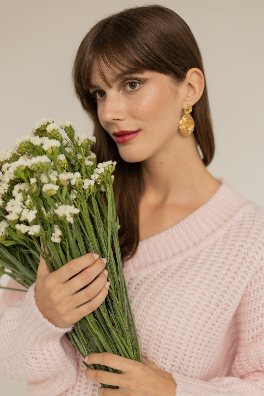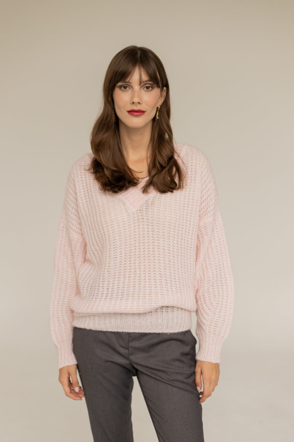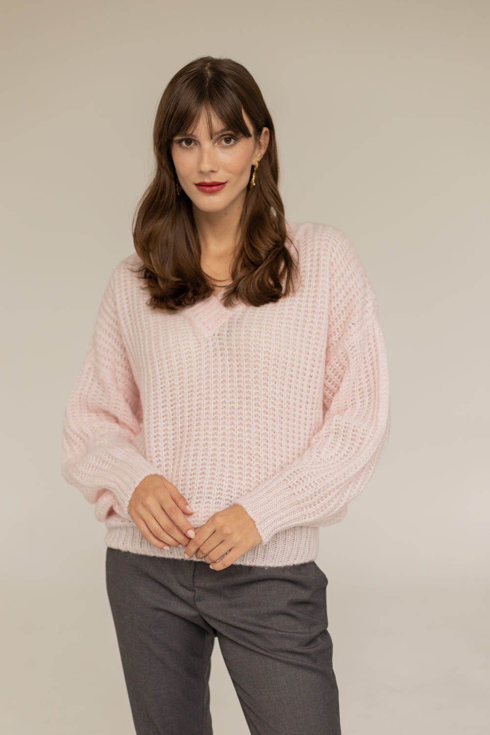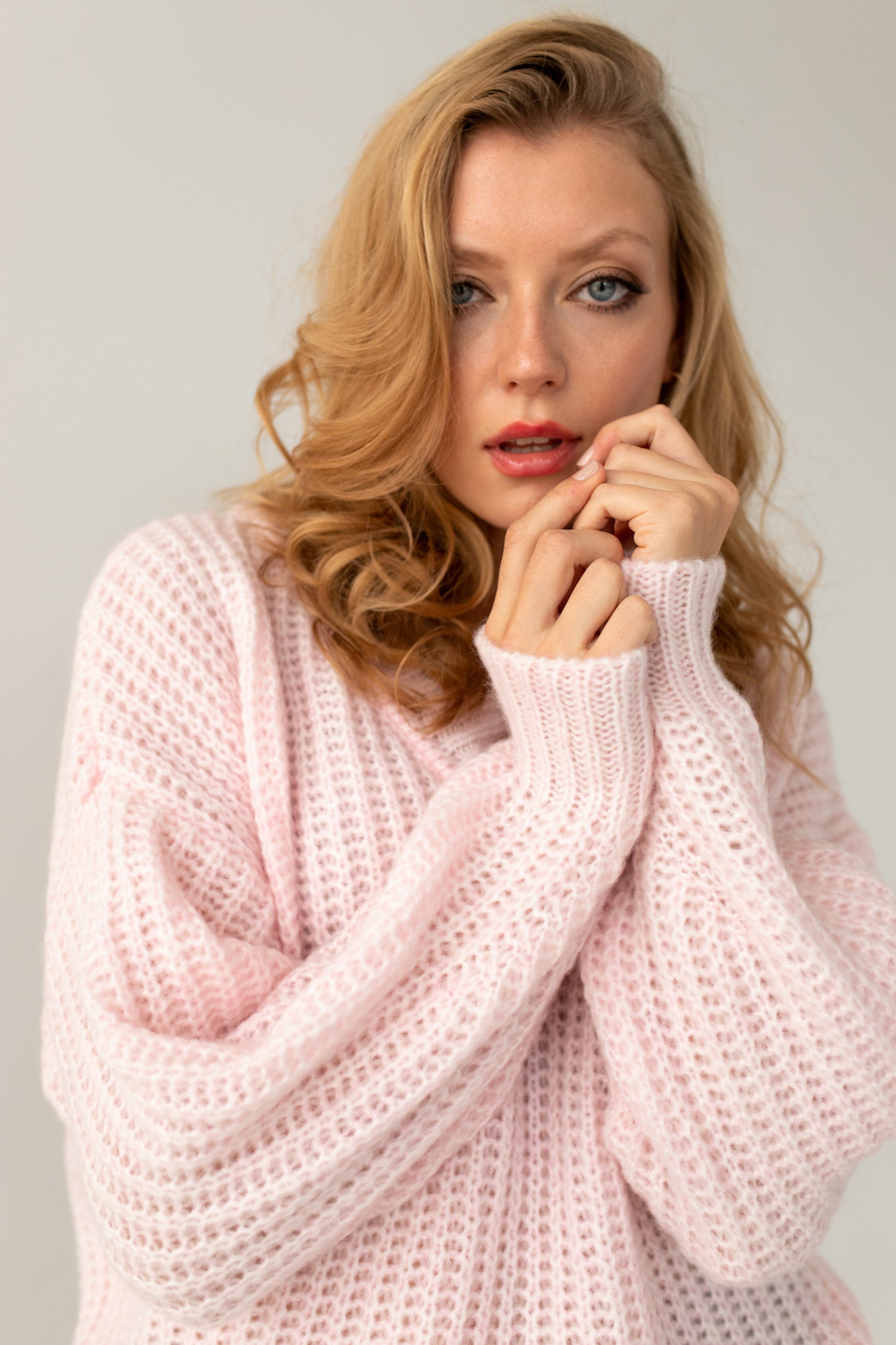 SOMEFANCYNAME.COM brings you a Victoria Merino Wool Sweater - Powder Pink. It is locally made of extremely soft Merino yarn with a loose and thick weave. The sweater features a loose oversized cut, V-neck, wide and comfortable sleeves, and a slightly dropped shoulder for freedom of movement.