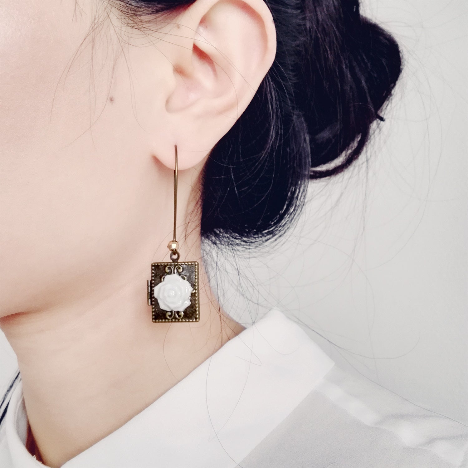Classic Porcelain Rose On Vintage Book Locket Earrings