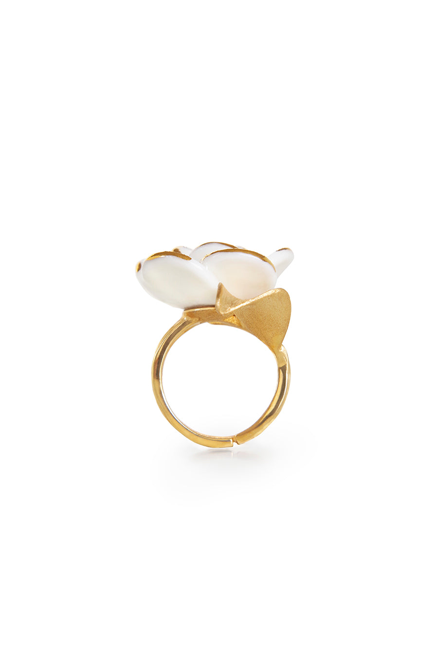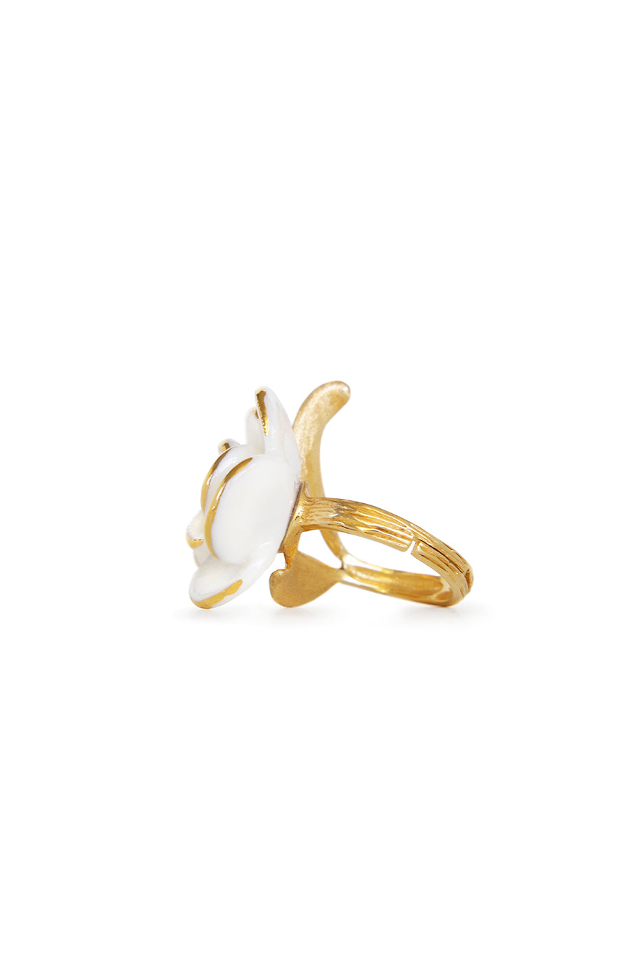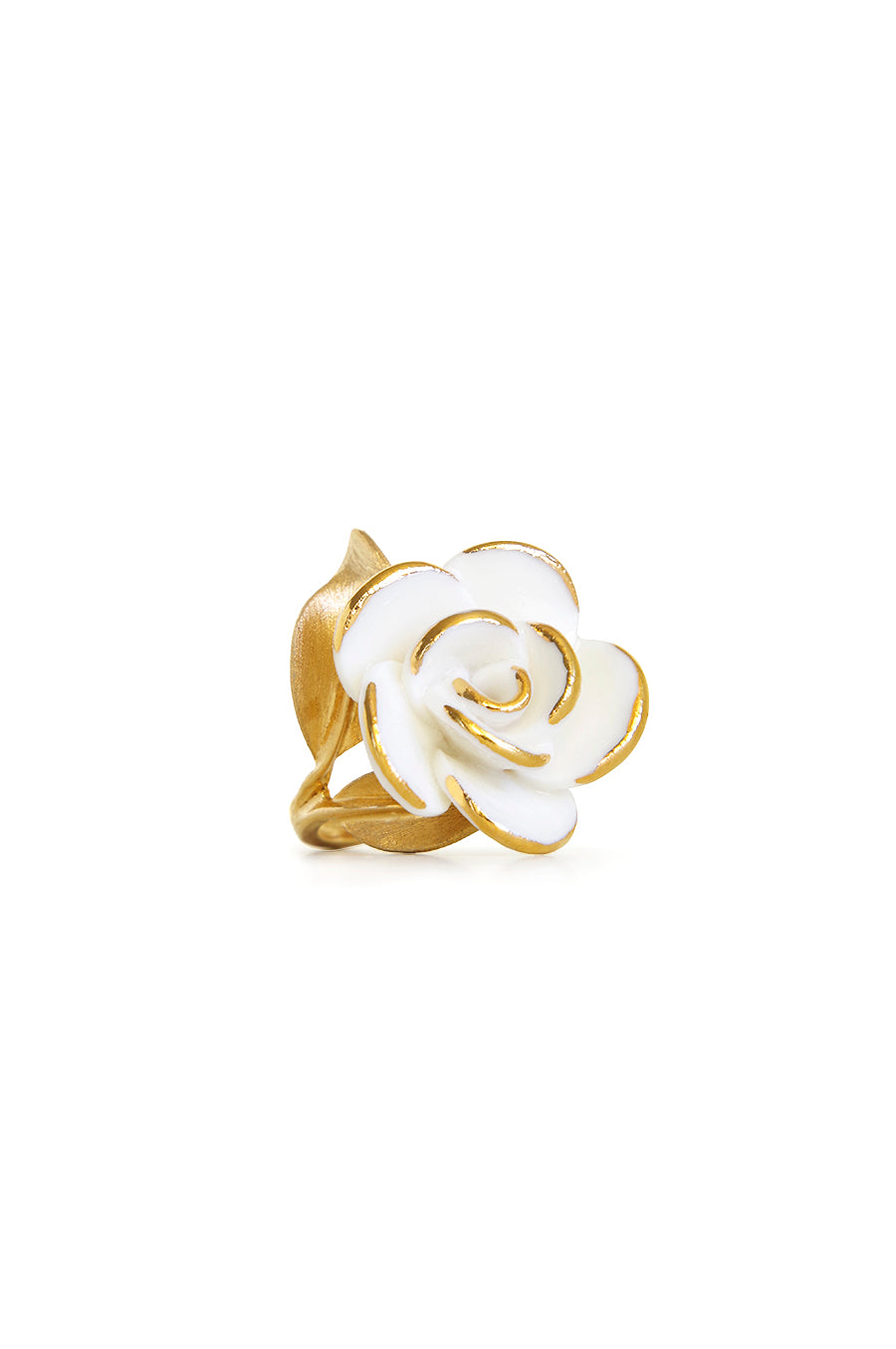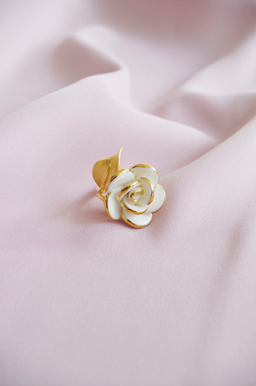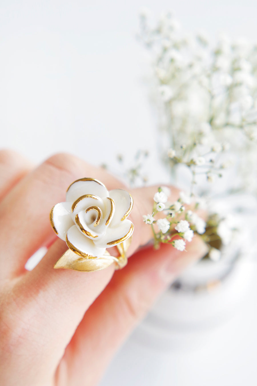 Crafted with sustainability in mind, our Golden White Cloud Rose Cocktail Ring is made using only the highest quality, eco-friendly materials. The porcelain rose and gold lustre are both eco-friendly and the 18K gold vermeil sterling silver ring and leaves are sourced from responsible suppliers.