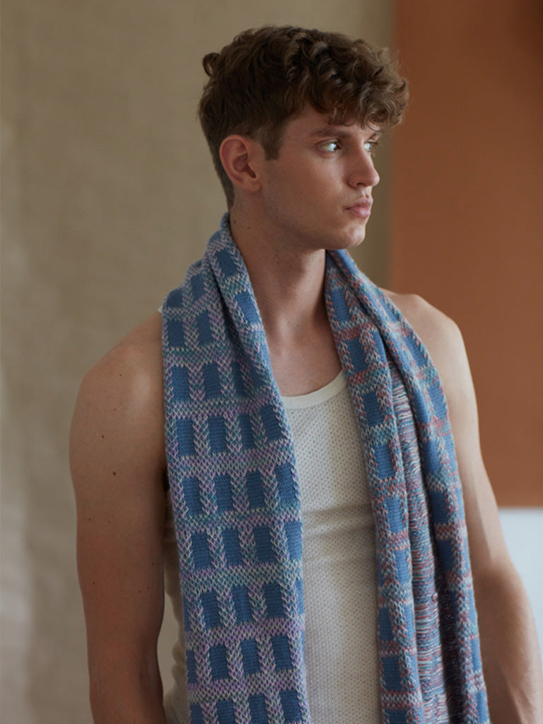This Napkini Sky Wool Scarf from Anna Maria Angelika is made of Alpaca wool yarn, which was discovered at a small spinning mill in Peru.