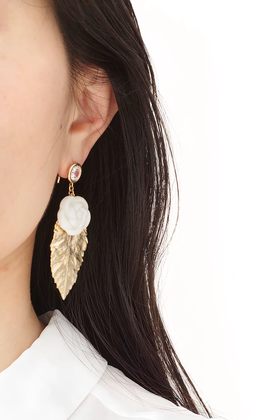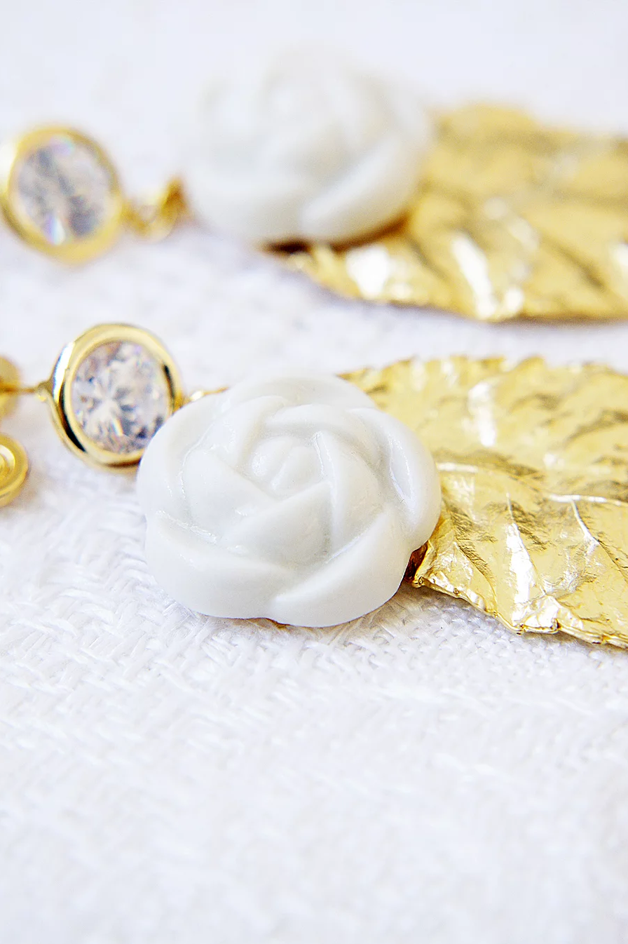 Celebrate the beauty of nature with our Porcelain Camellias And Golden Leaves Earrings - a unique and sustainable addition to your jewelry collection. These earrings are carefully crafted by hand, featuring delicate porcelain camellia charms paired with intricate gold-plated brass leaves for a timeless and elegant look.