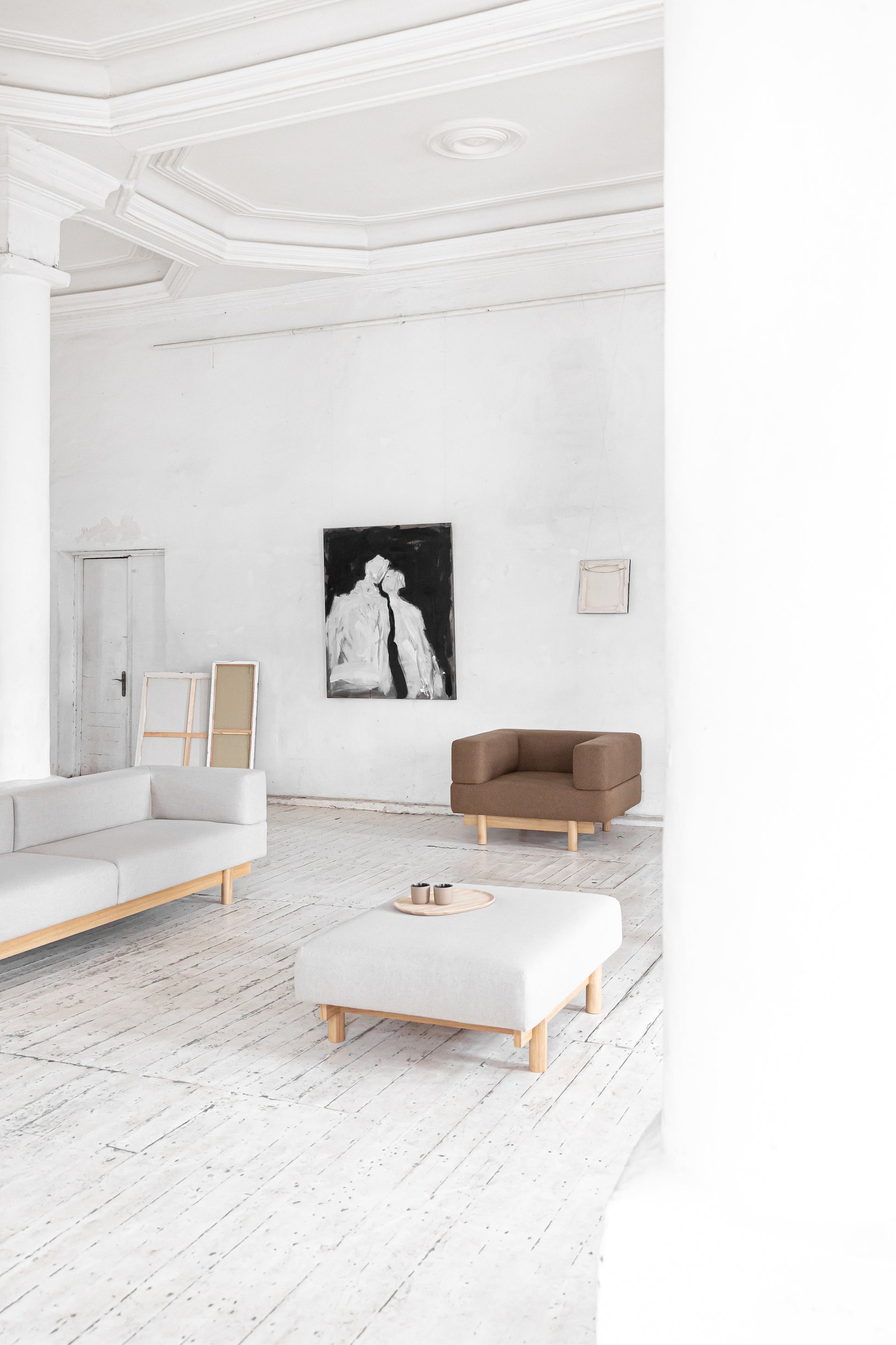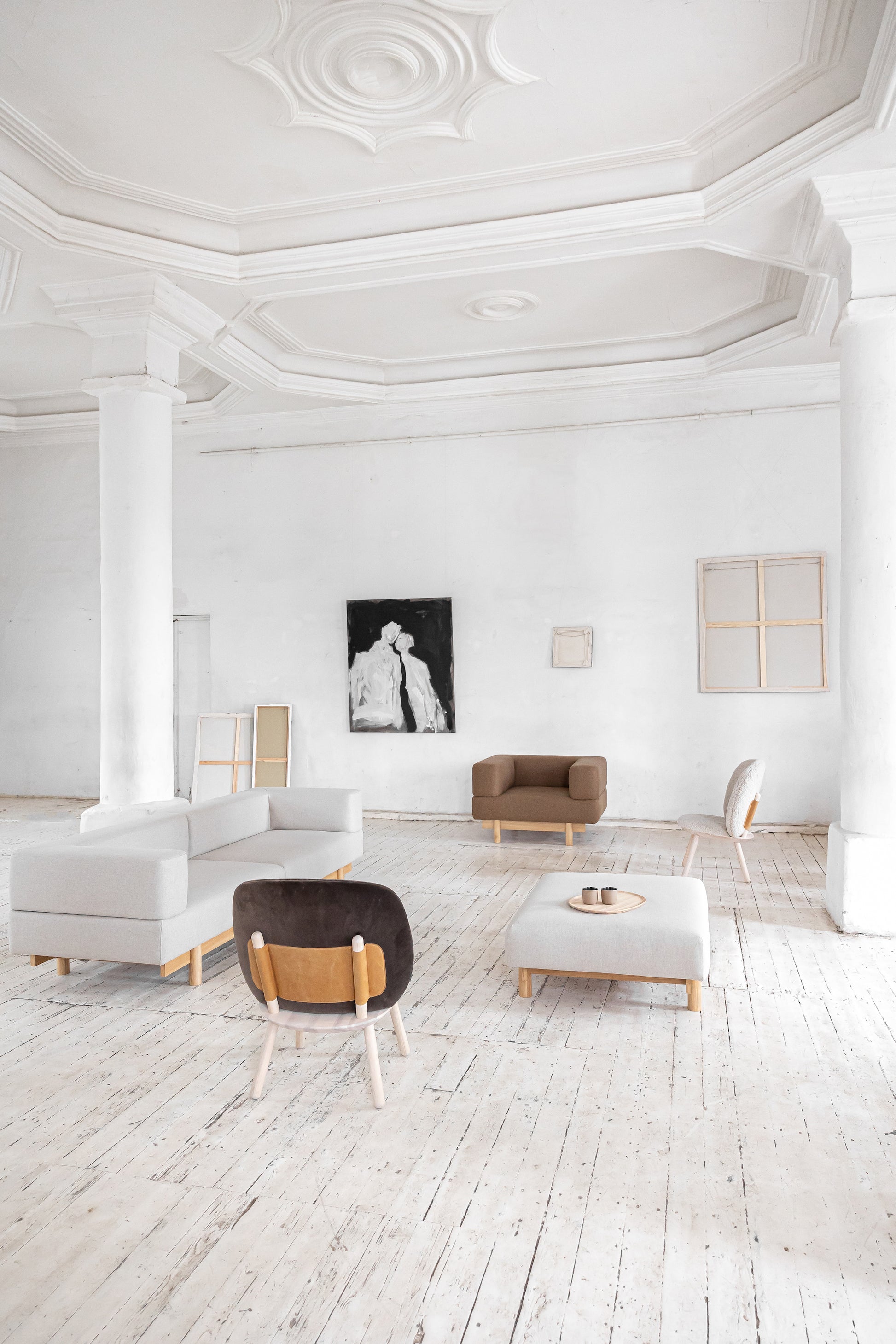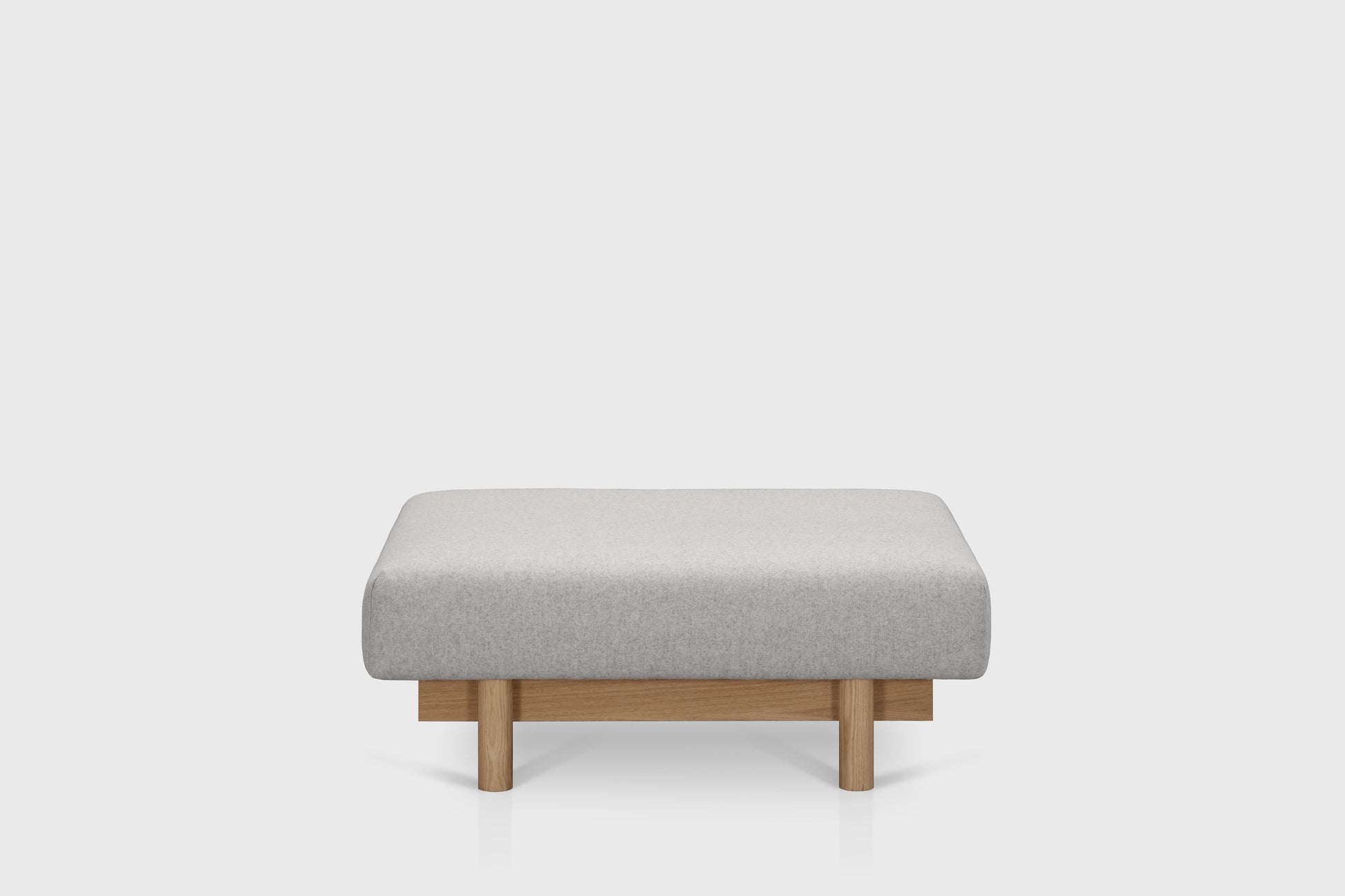 Introducing the Alchemist Pouf made of Recycled Wool - Audejas Floris. Meticulously crafted and designed with clean lines, this eye-catching piece is composed of an oak-veneered frame and soft, sculpted pillows.