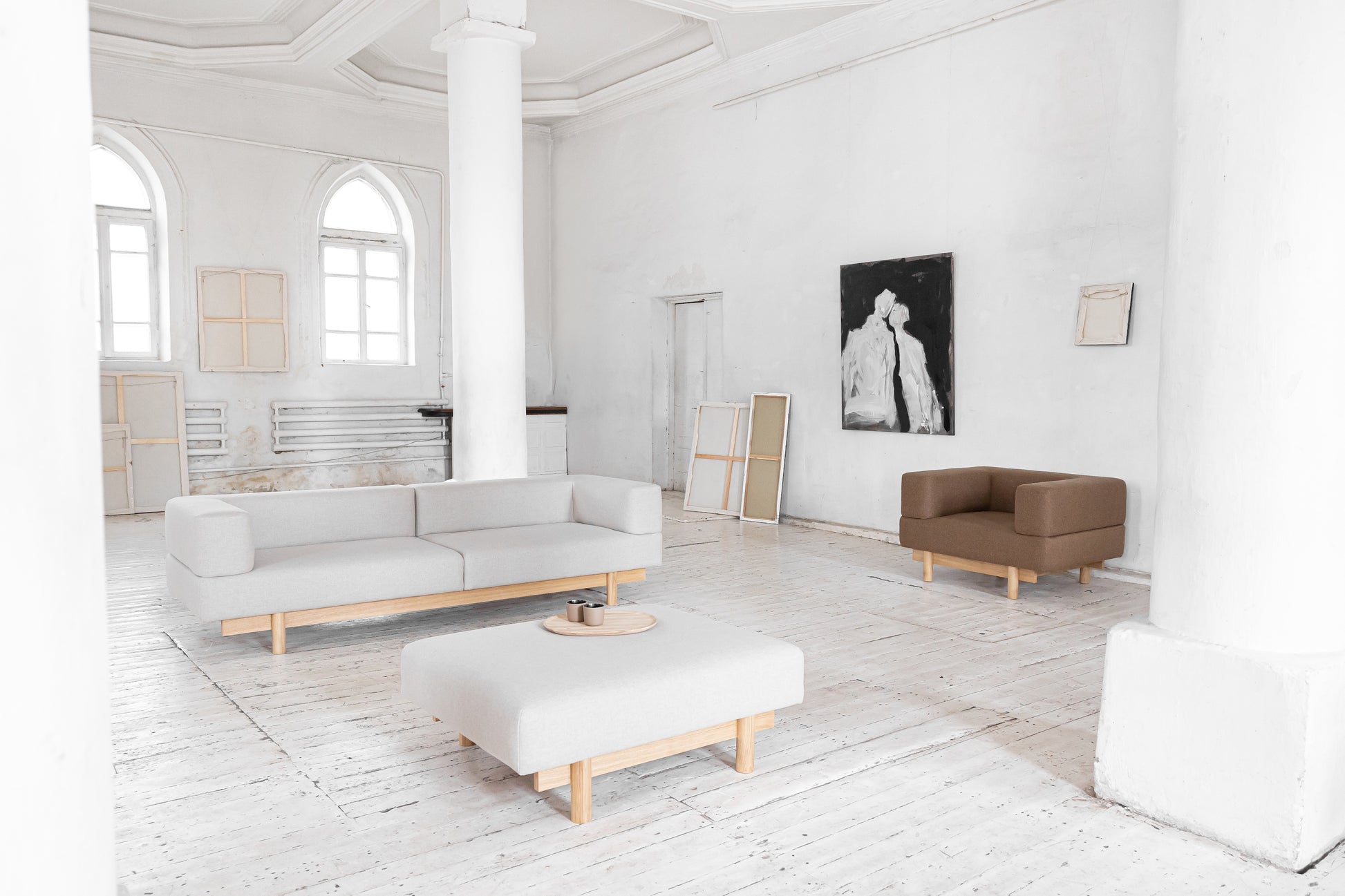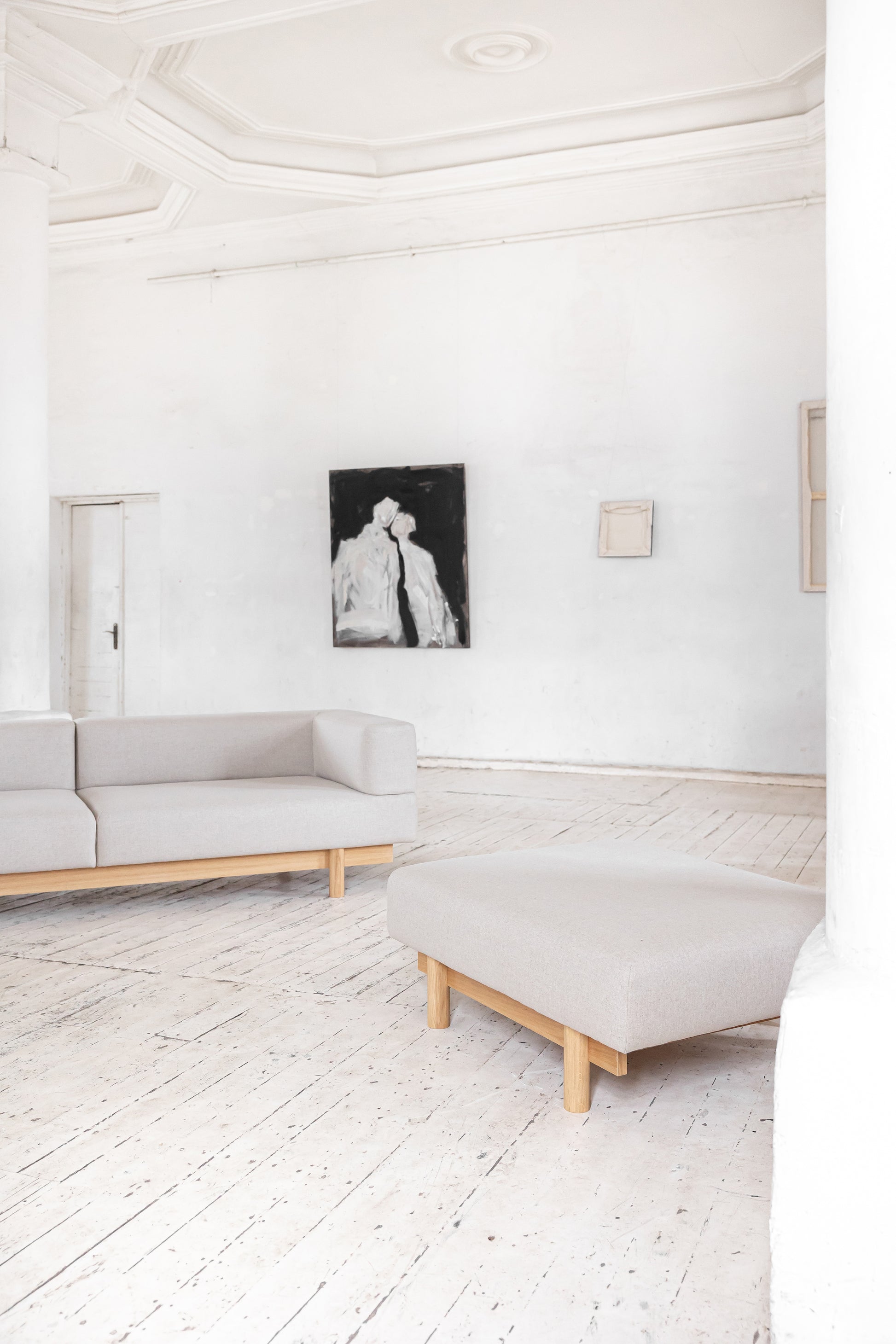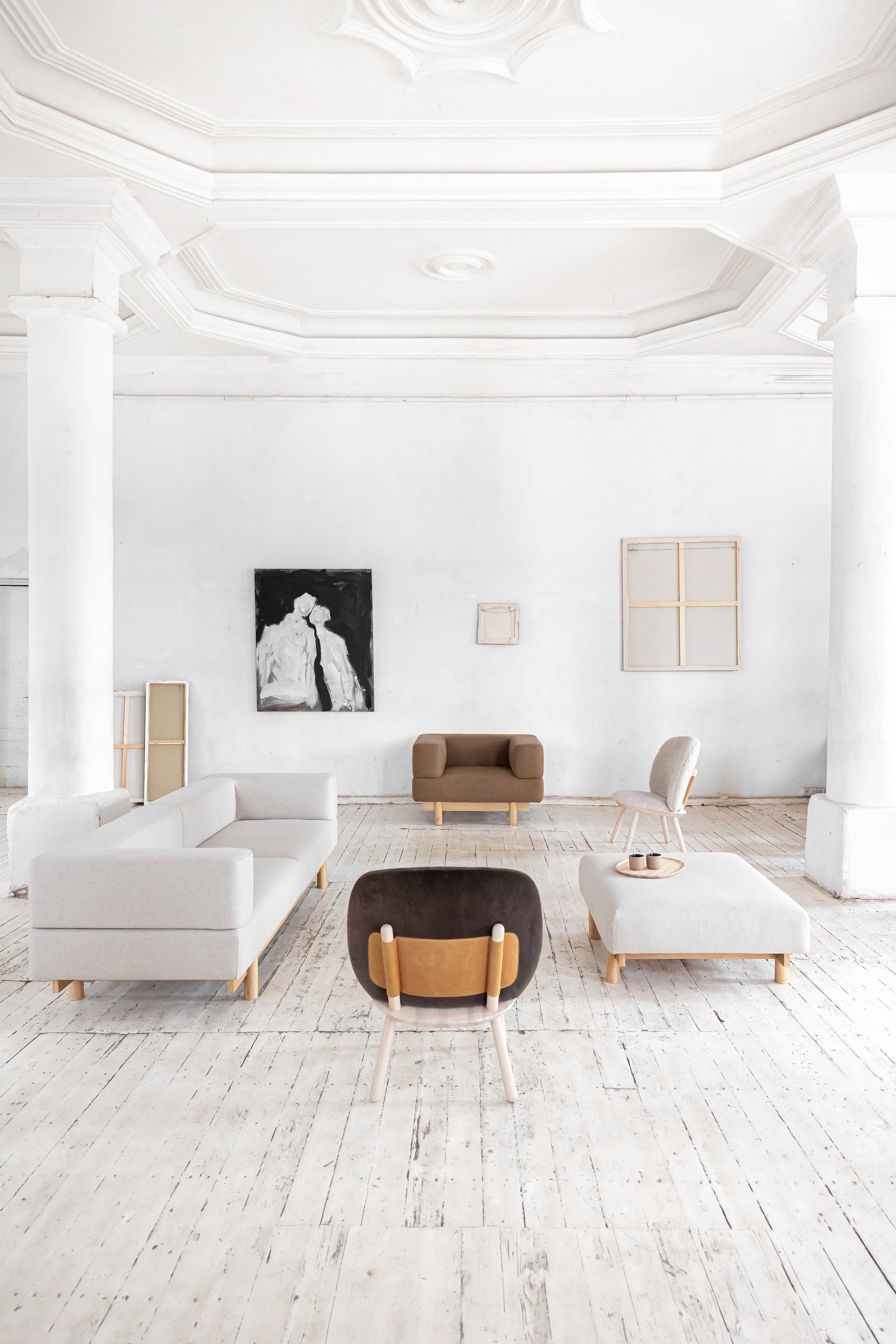 Introducing the Alchemist Pouf made of Recycled Wool - Audejas Floris. Meticulously crafted and designed with clean lines, this eye-catching piece is composed of an oak-veneered frame and soft, sculpted pillows.