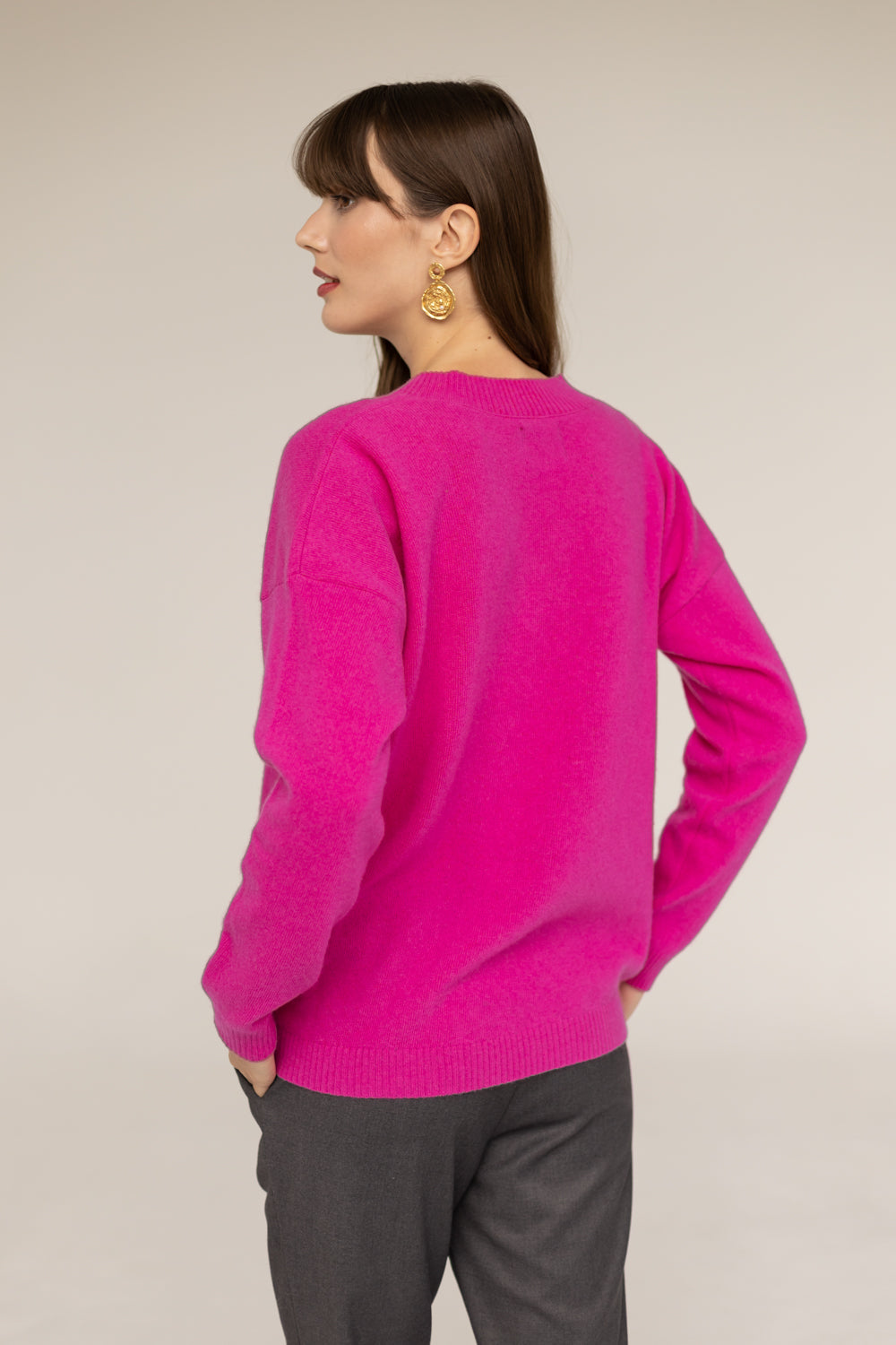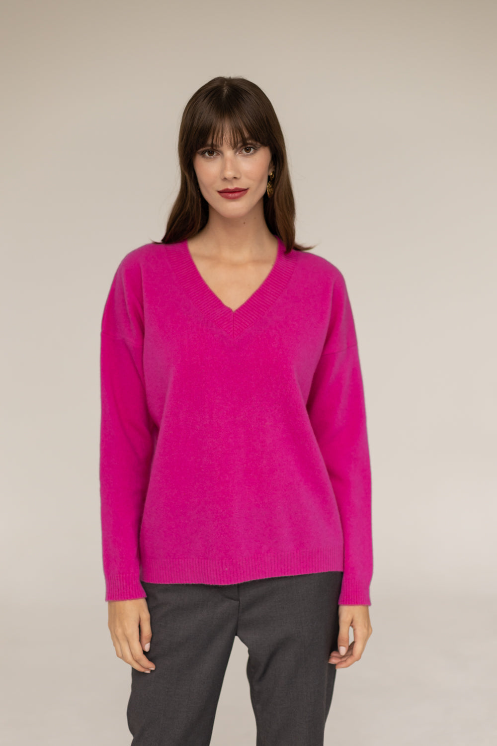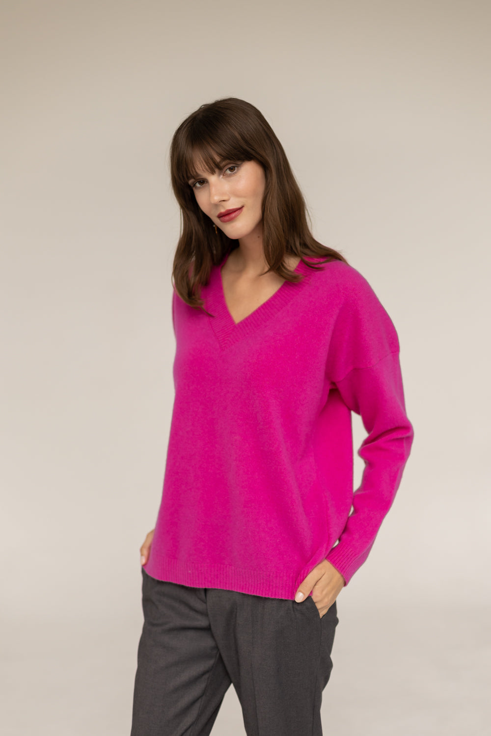 SOMEFANCYNAME.COM brings you a Cashmere Wool Sweater - Fuchsia. This lightweight sweater is locally made of extremely soft Cashmere yarn and Merino Wool. It features a classic timeless cut, loose fit, and kimono sleeves, a slightly dropped shoulder for freedom of movement.
