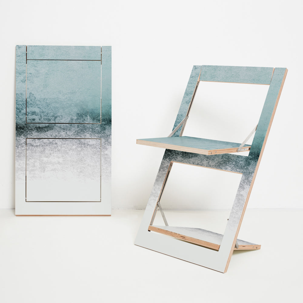 FLÄPPS is a mere 20 mm flat and is available in black, white, and art-printed versions. The beautiful art prints make it a fashionable decorative object even when folded. Easy to open and easy to close with a single snap. A chair to stow, print, and adore.
