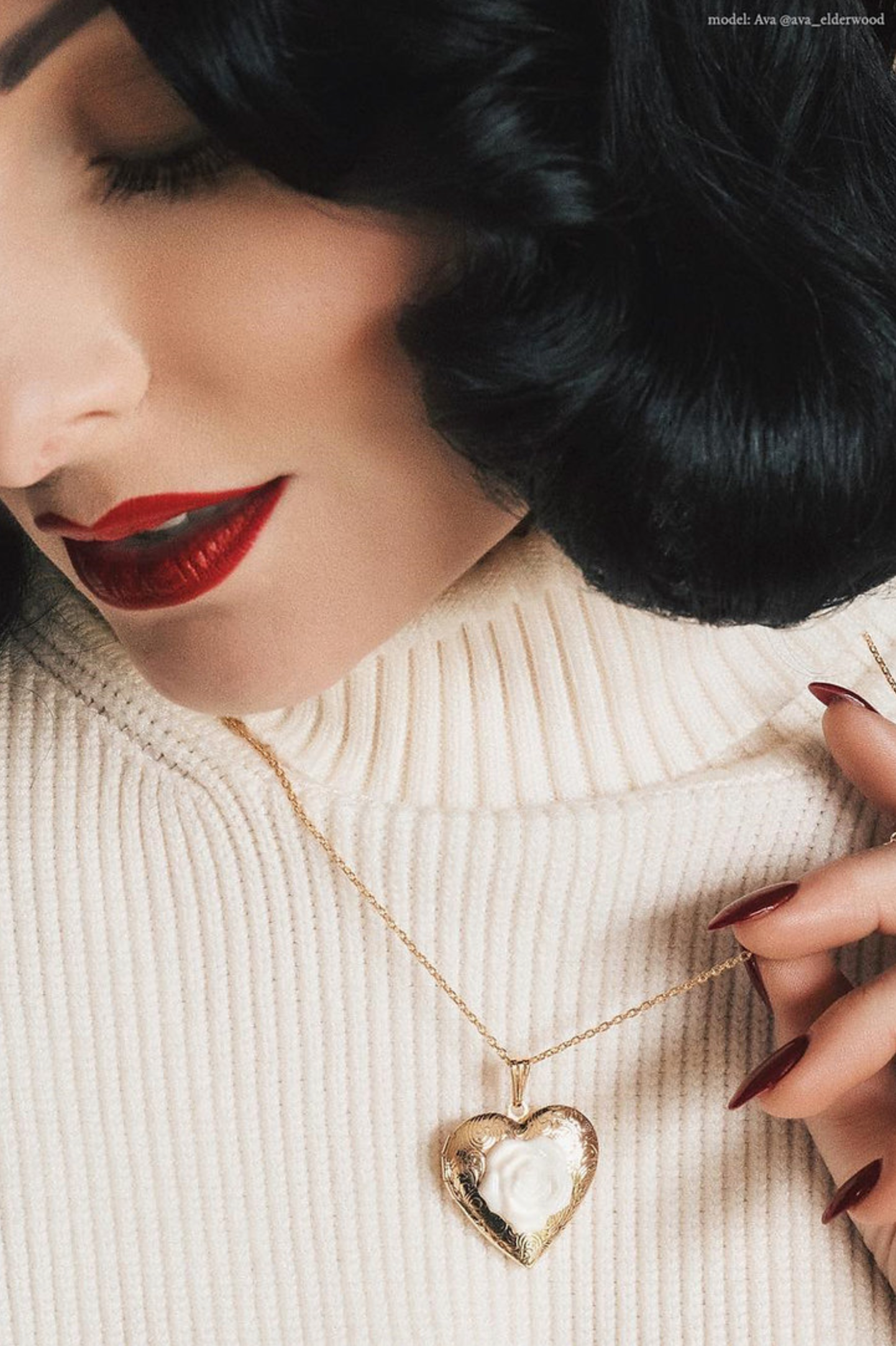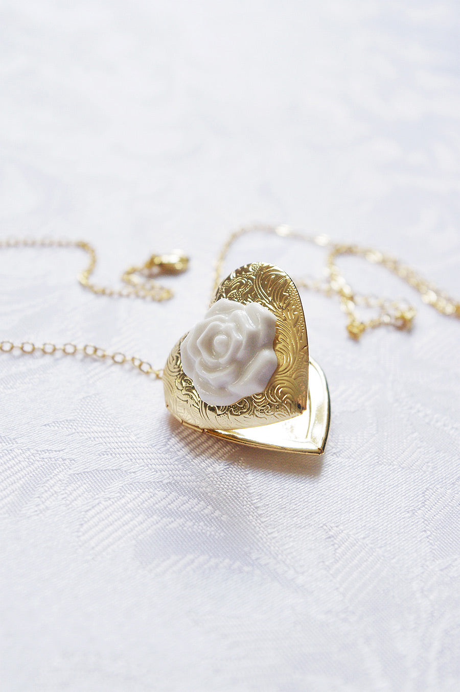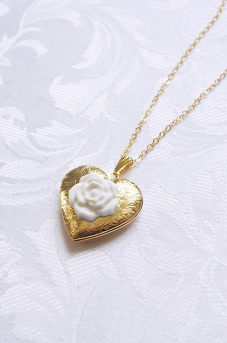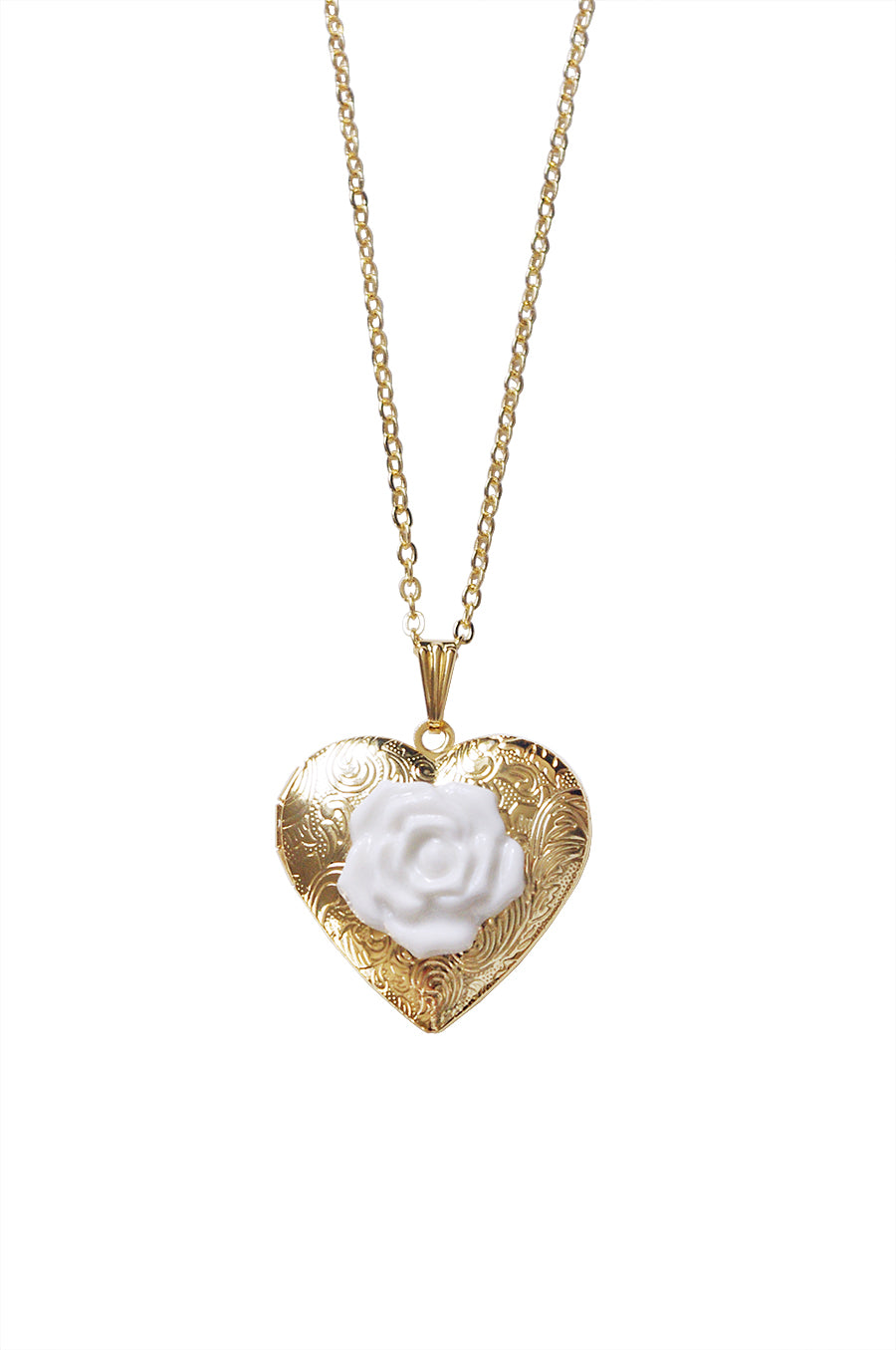 Roses and hearts are the most classic symbols of love and romance. This necklace features a floral patterned heart-shaped locket with white porcelain rose on top.