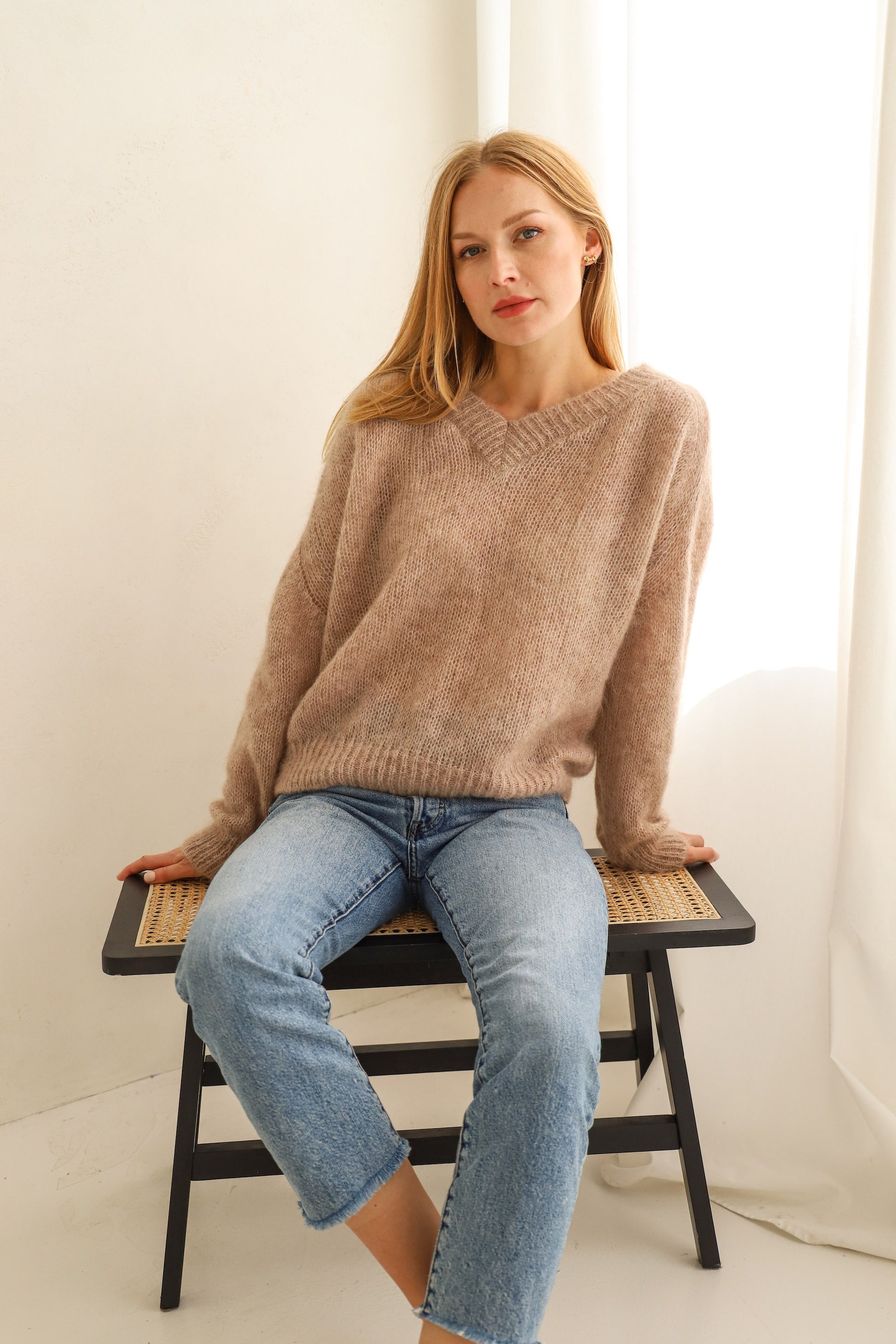 SOMEFANCYNAME.COM brings you a Mohair Wool Sweater - Beige. This lightweight sweater is locally made of kid mohair and superfine alpaca yarn with a loose slightly transparent weave. It features a loose oversized cut, a slightly dropped shoulder for freedom of movement, and a v-neckline.