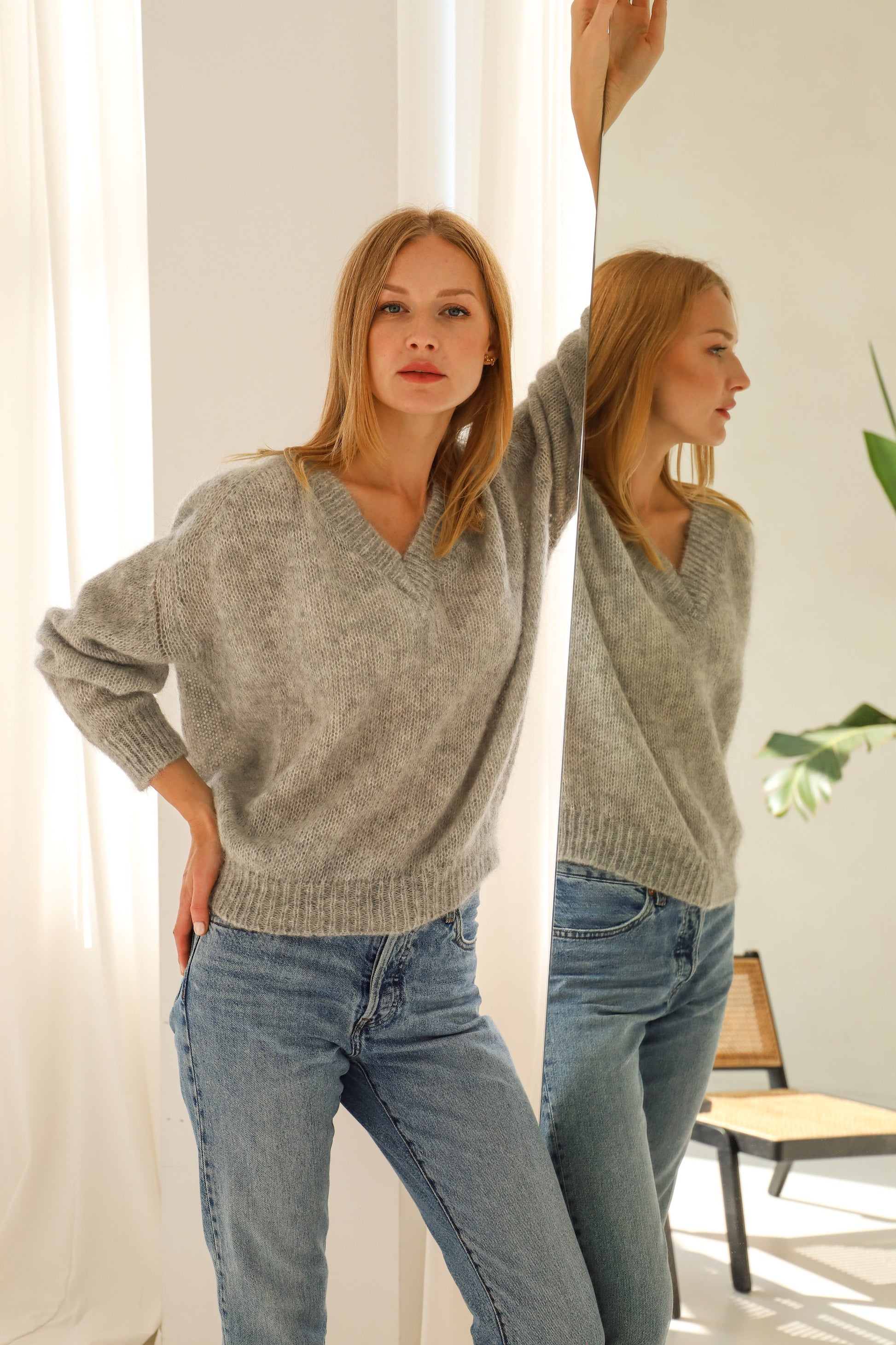 SOMEFANCYNAME.COM brings you a Mohair Wool Sweater - Grey. This lightweight sweater is locally made of kid mohair and superfine alpaca yarn with a loose slightly transparent weave. It features a loose oversized cut, a slightly dropped shoulder for freedom of movement, and a v-neckline.