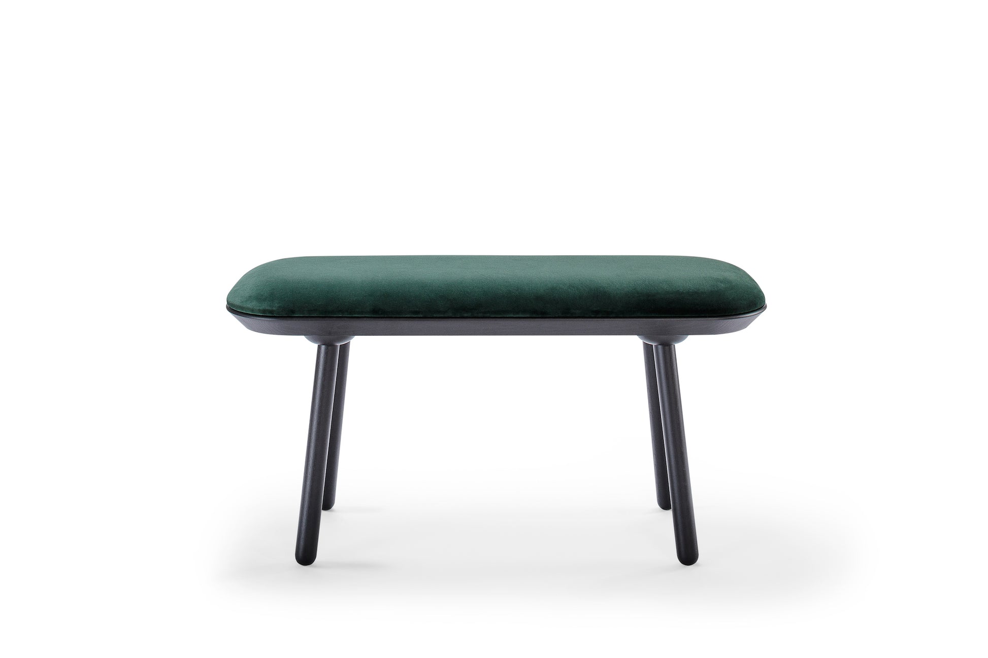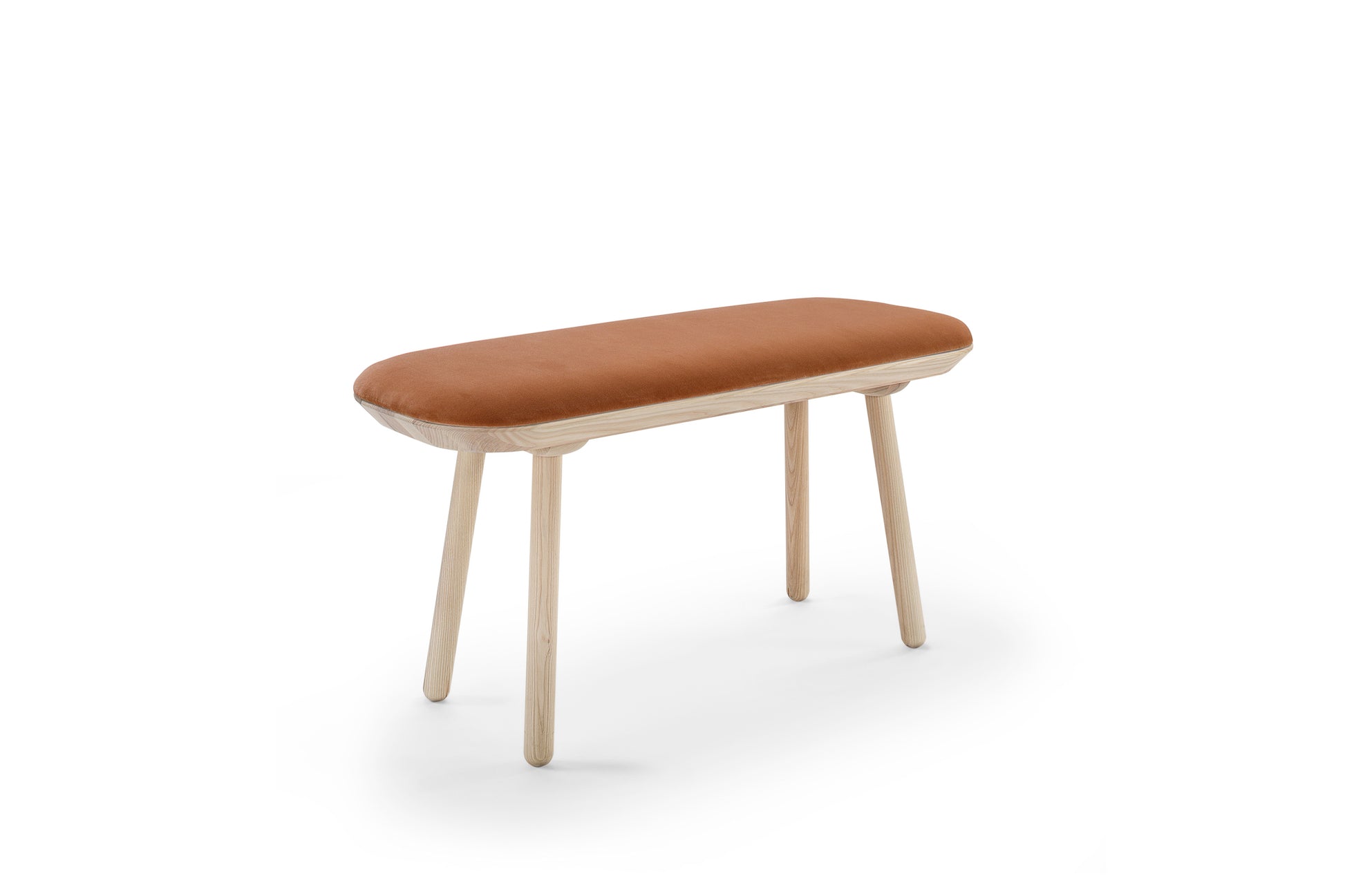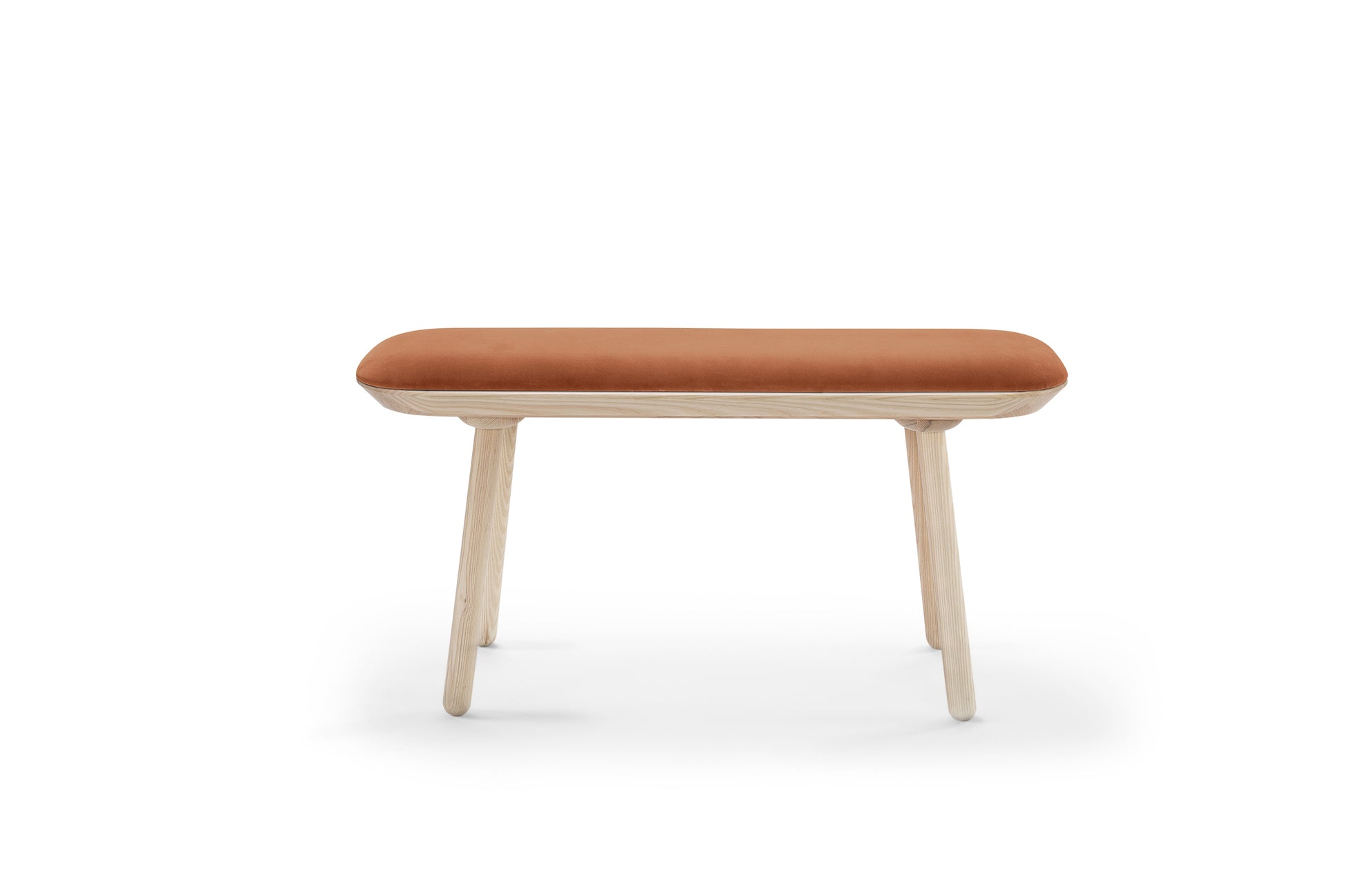 Made from solid ash wood, the Naïve Bench Velour is as strong as it is visually gracious. The item can be made in two sizes 100cm and 140cm, also with or without the padding that comes in the eight colors of the Naïve Low Chair. If unpadded, the bench seat is either black or oiled ash wood.