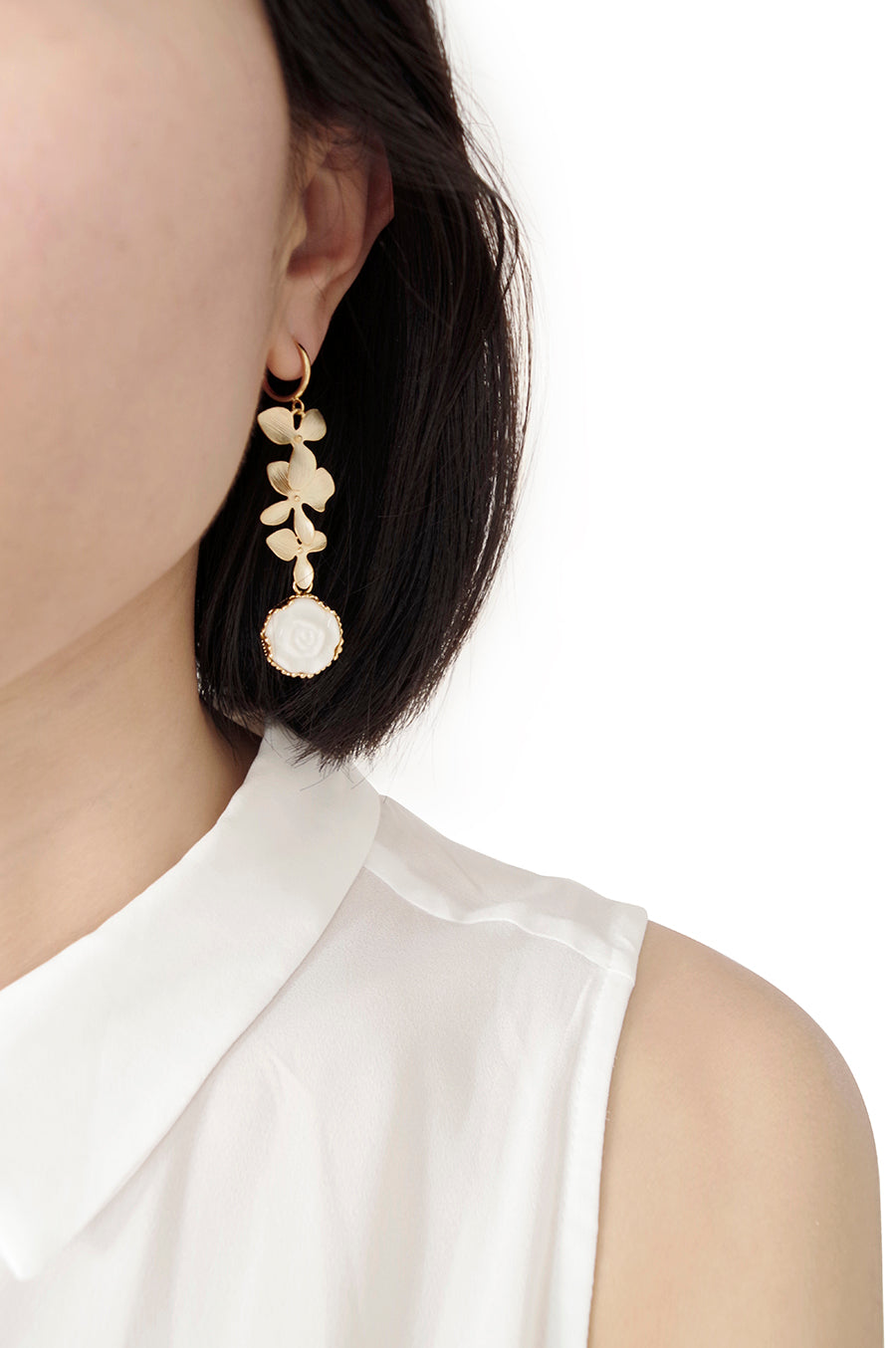 Porcelain Moonlight Rose And Triple Leaves Clip-On Earrings