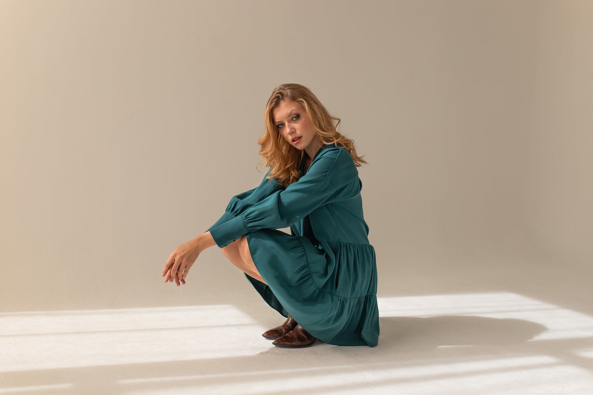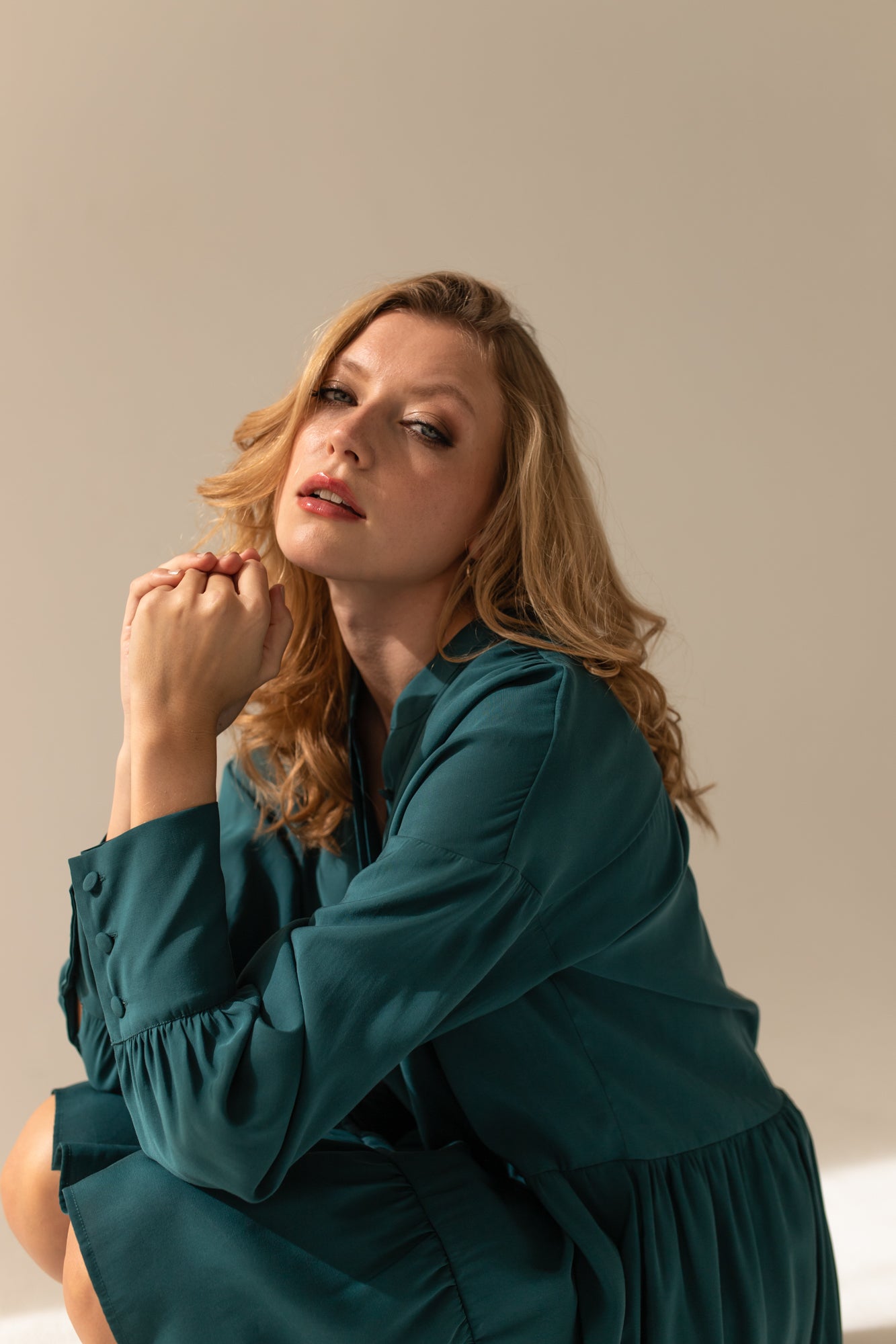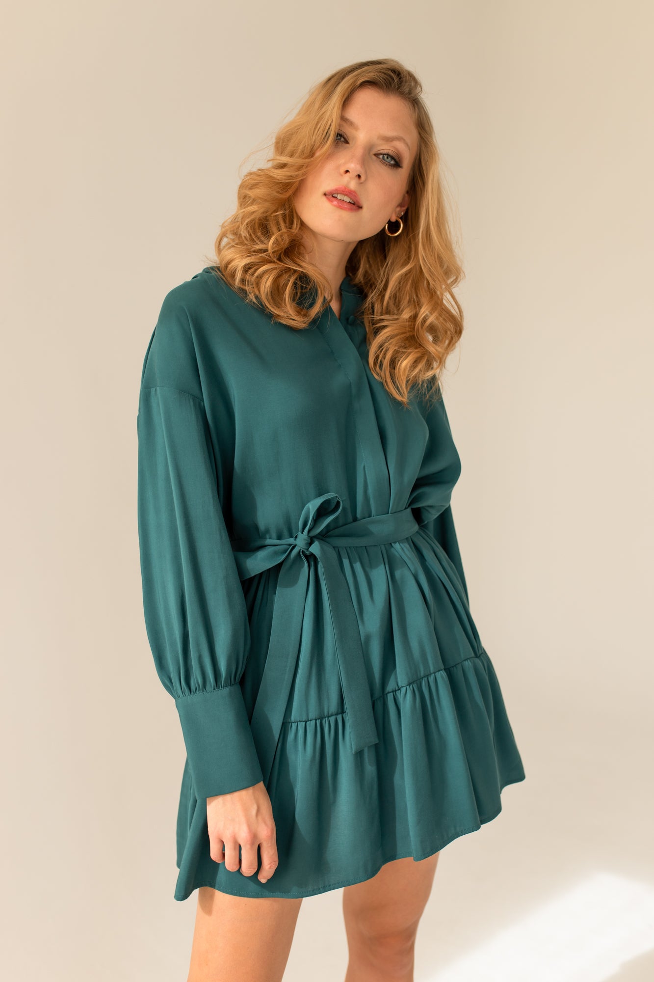 SOMEFANCYNAME.COM brings you this locally-made Anais Frills Dress - Green. It features a loose cut, frills, cut-off shirt top fastened with buttons and a stand-up collar, slightly dropped shoulder, and sleeves with longer cuffs fastened with 3 buttons.