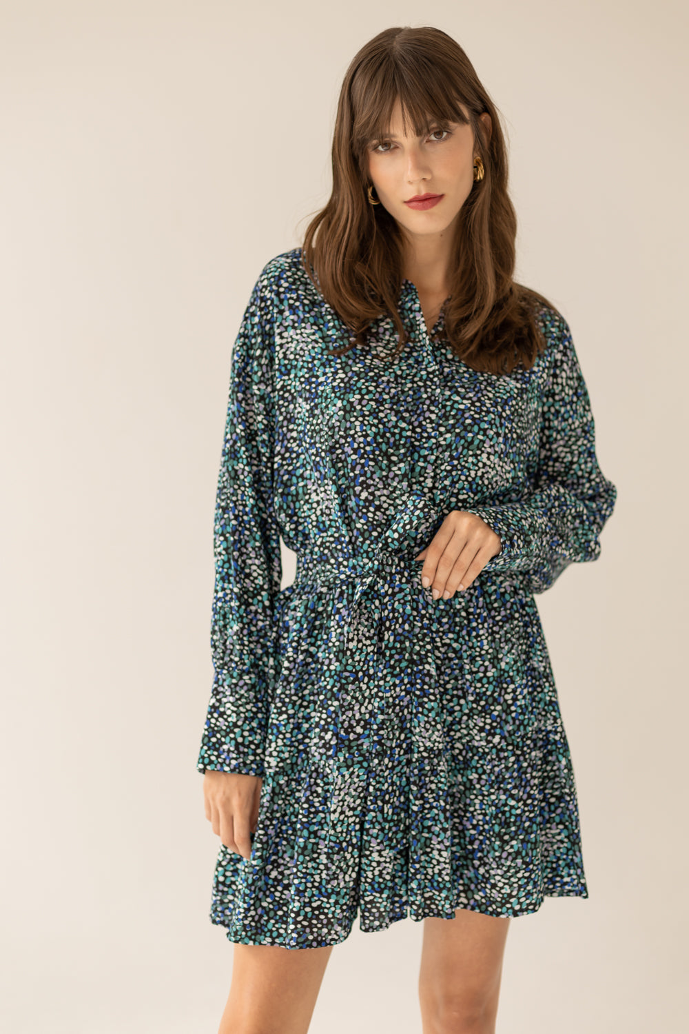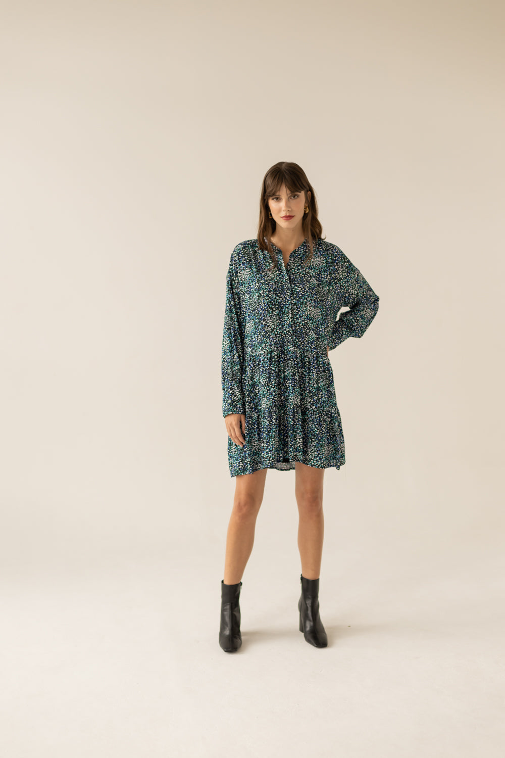This dress is locally crafted with a loose fit, delicate frills, and a cut-off shirt top secured with fabric-covered buttons. Its stand-up collar and slightly dropped shoulders feature elongated cuffs secured by 3 buttons. Wear it freely or belt it for a personalized silhouette. The lightweight viscose fabric in stone grey is soft and supple, and lined with viscose for a luxurious finish.