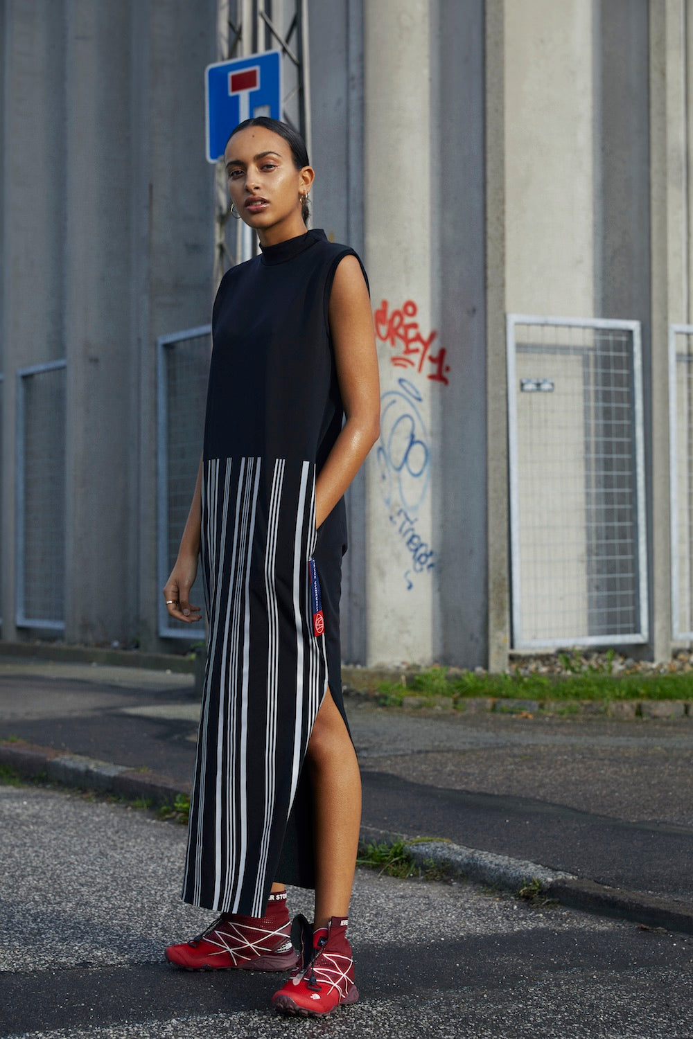 This Lærke Andersen sport-inspired dress for strong independent women. It features a stand collar, high slits and supersized logo label in the side seam. The allover reflective stripe print panel adds a graphic statement to the dress.