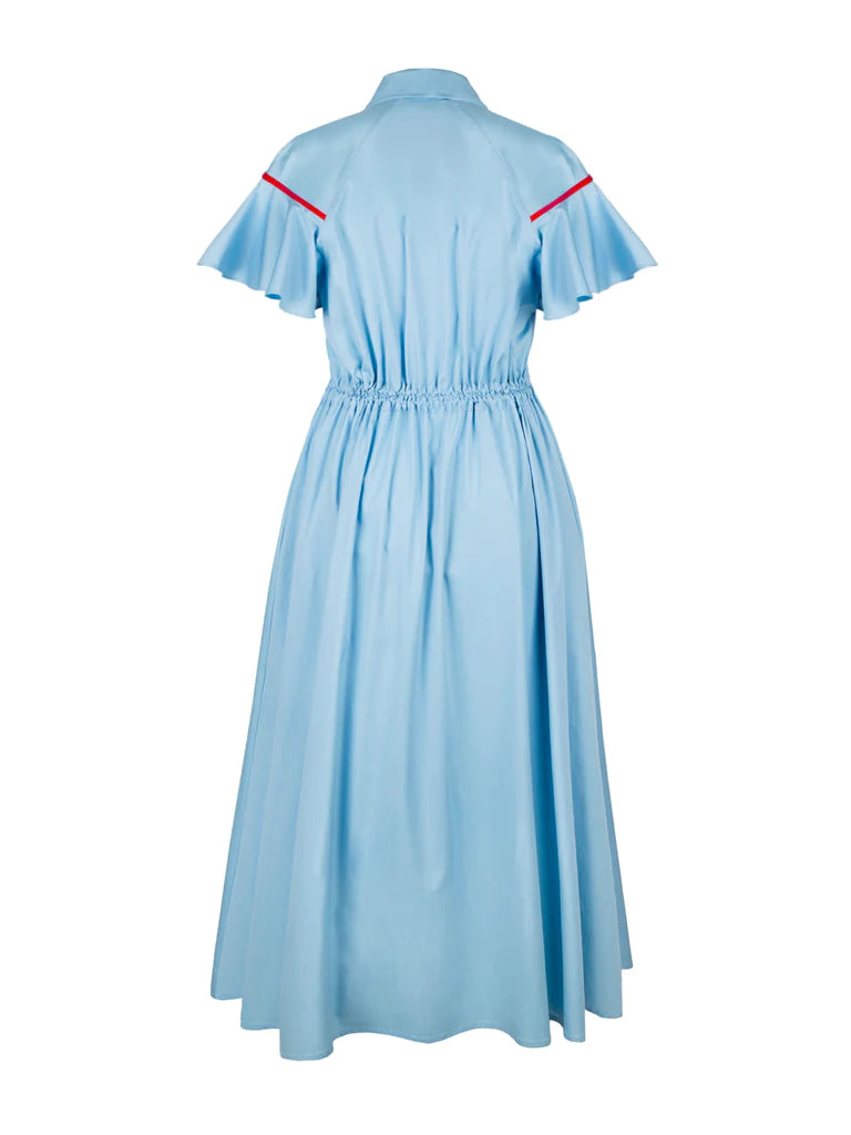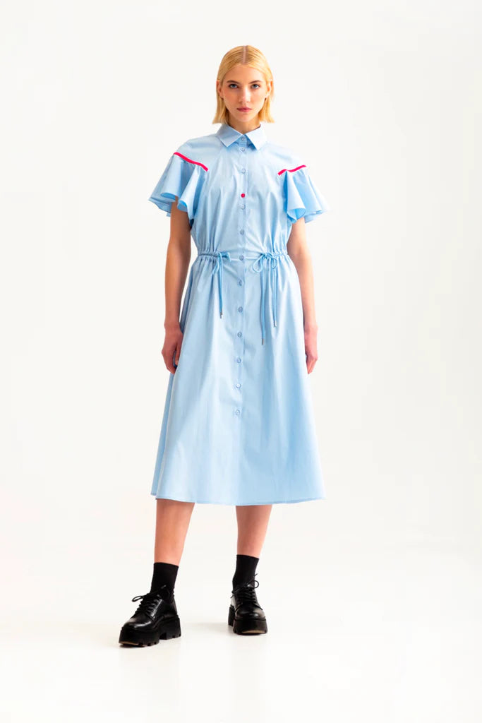 SOMEFANCYNAME.COM brings you a Bell Sleeve Shirt Dress - Light Blue. Crafted from cool and crisp cotton poplin, this midi-length A-line shirtdress features bell sleeves and neon orange contrasting details. It is designed with an adjustable waist and side pockets for maximum comfort and includes a signature one-button chest feature in a different color.