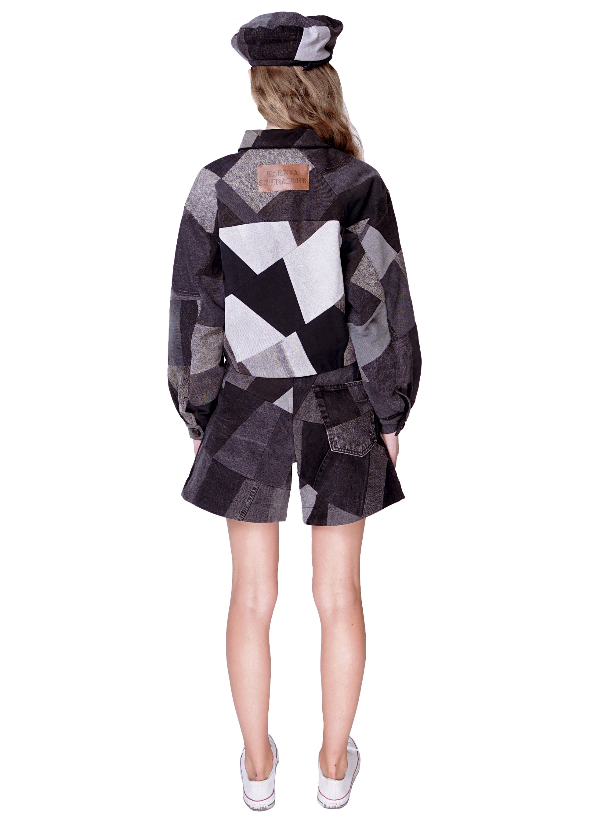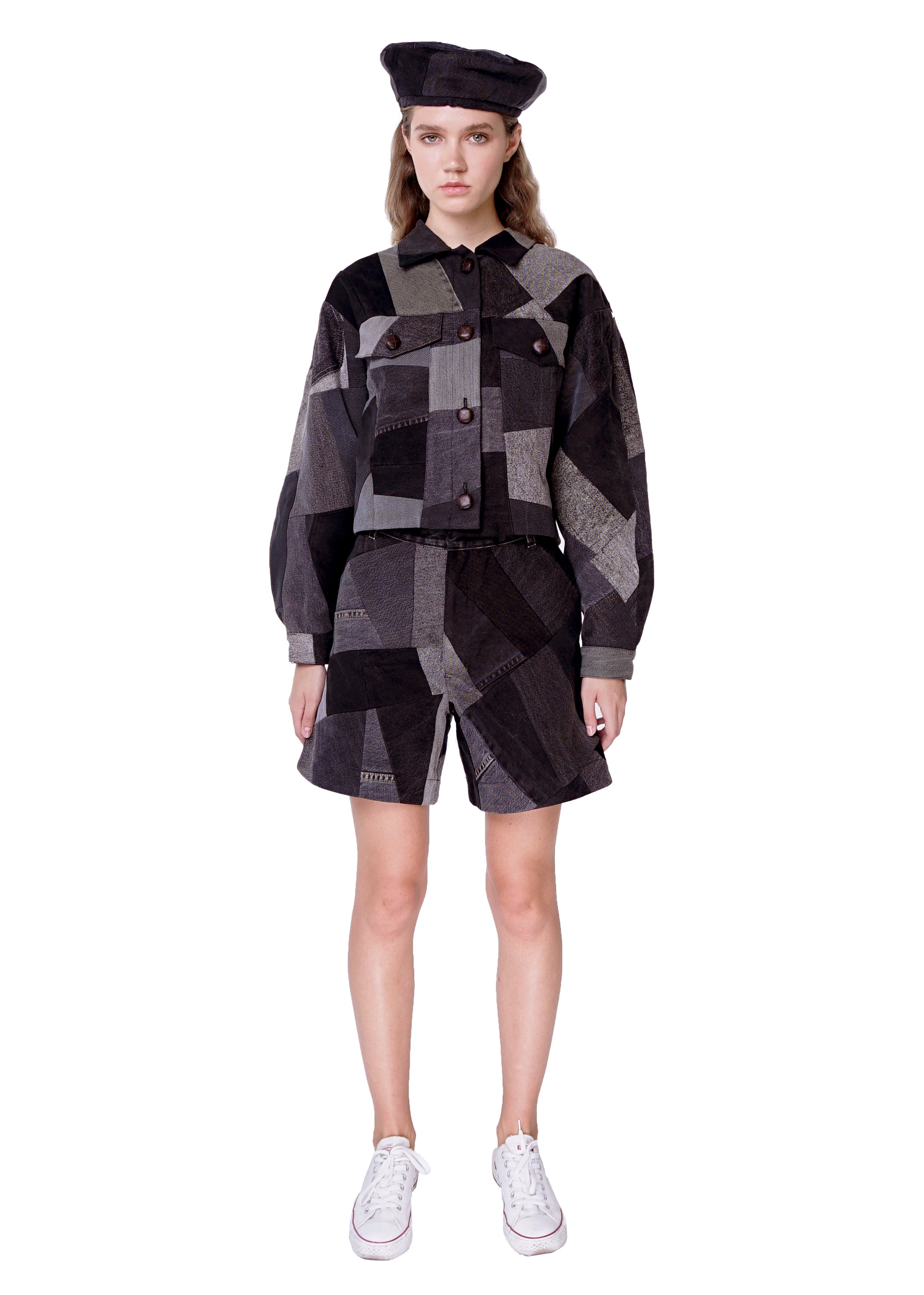 This upcycled black patchwork jacket is made of discarded denim fabric samples.