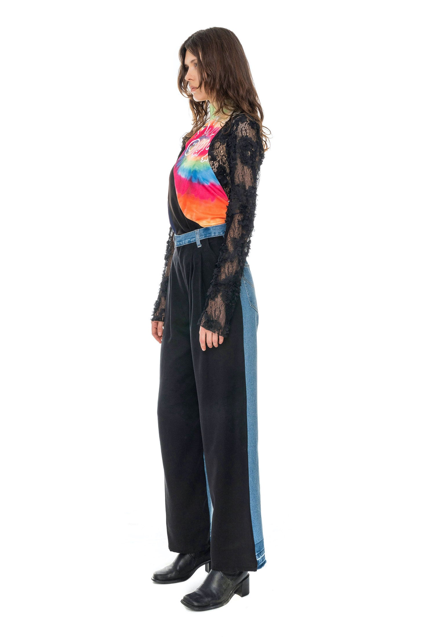 This Reworked Blue Wide Jeans With Black Cotton Front Part is one of a kind. It features highwaisted fit and is made of 100% upcycled second-hand denim.