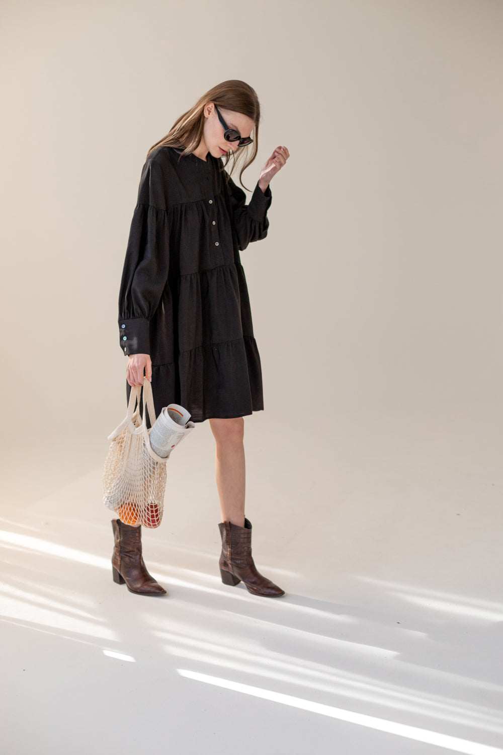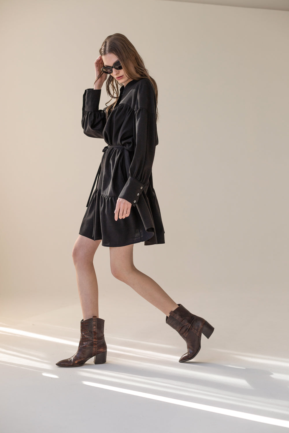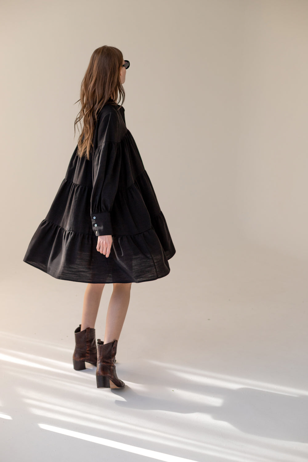 SOMEFANCYNAME.COM brings you a locally-produced Claire Black Dress. It features a loose-fit, short A-line shape with slightly gathered ruffles. The dress has a shirt top with a stand-up collar, fastened with buttons, and slightly puffed sleeves with a longer cuff with three buttons.