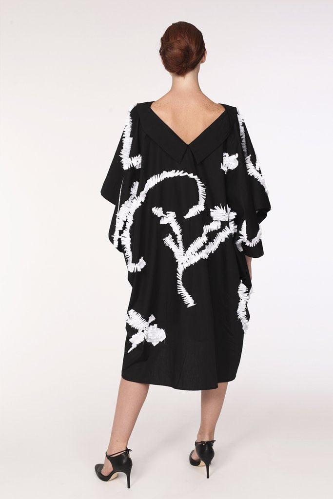 An over-silhouette caftan with folded collar in 100% Italian cotton is featured with flower collage embroidery, narrow kimono sleeves, folded square neck and side slits.