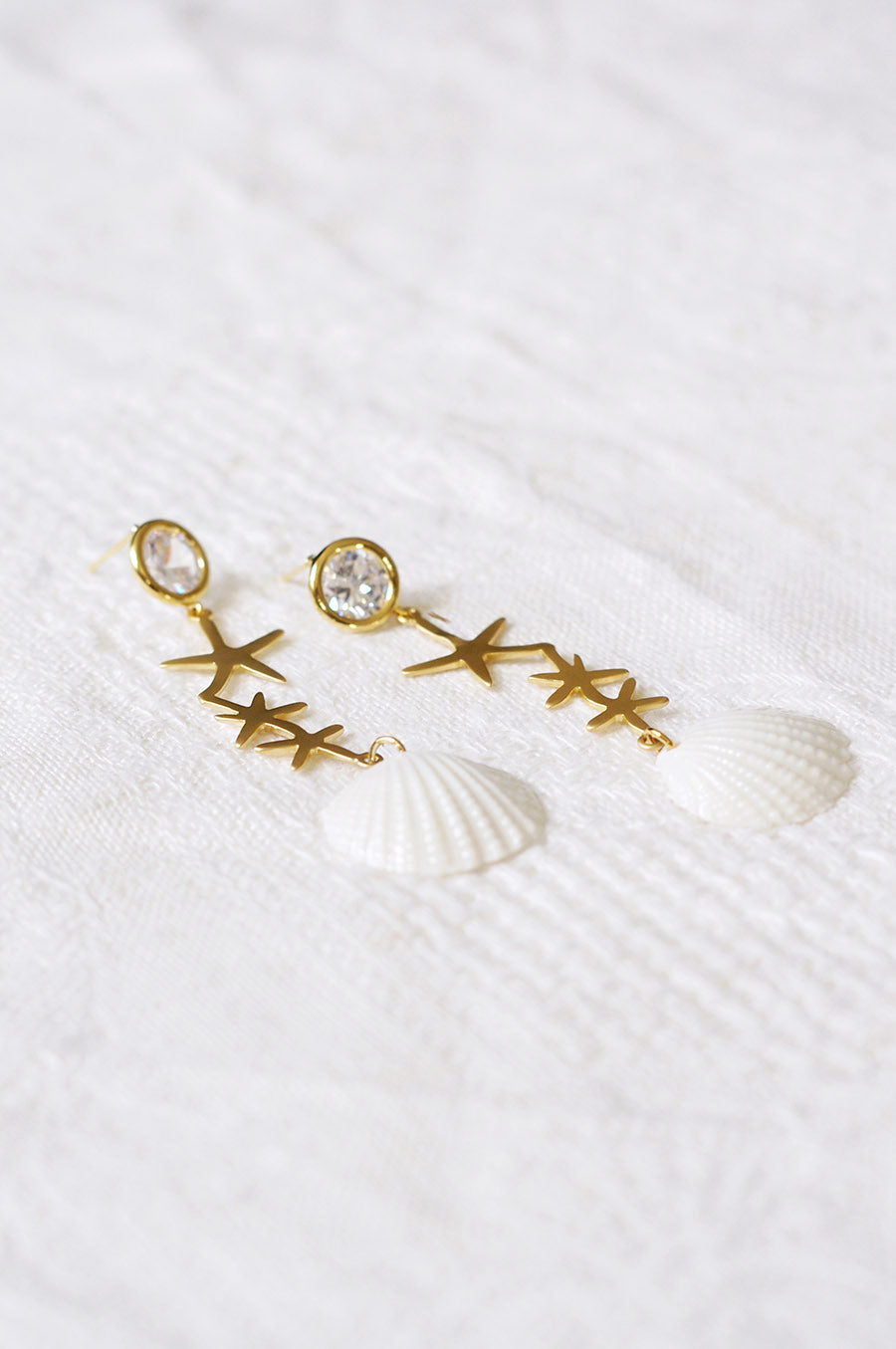 It’s a story inspired by the moonlight ocean. White porcelain shells, golden stars and clear stones compose these unique and delicate earrings.