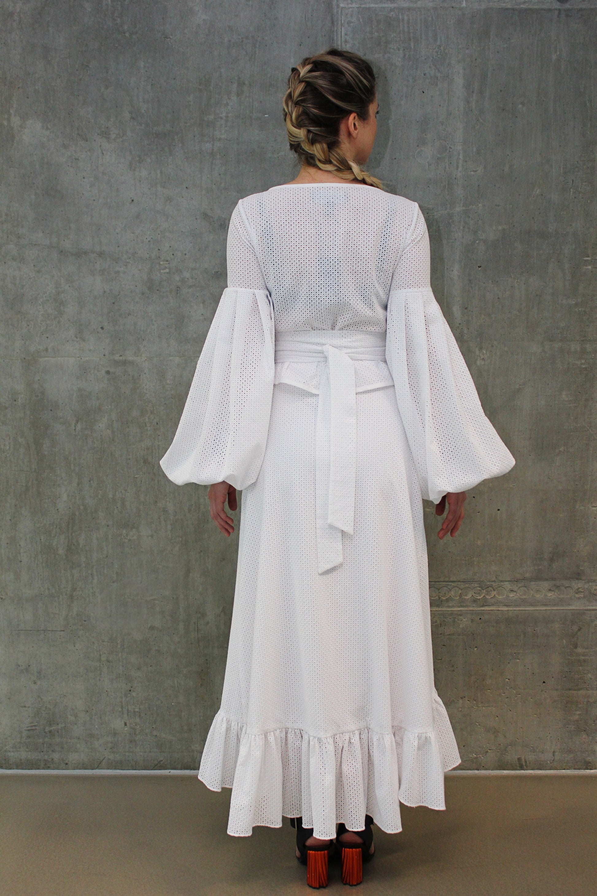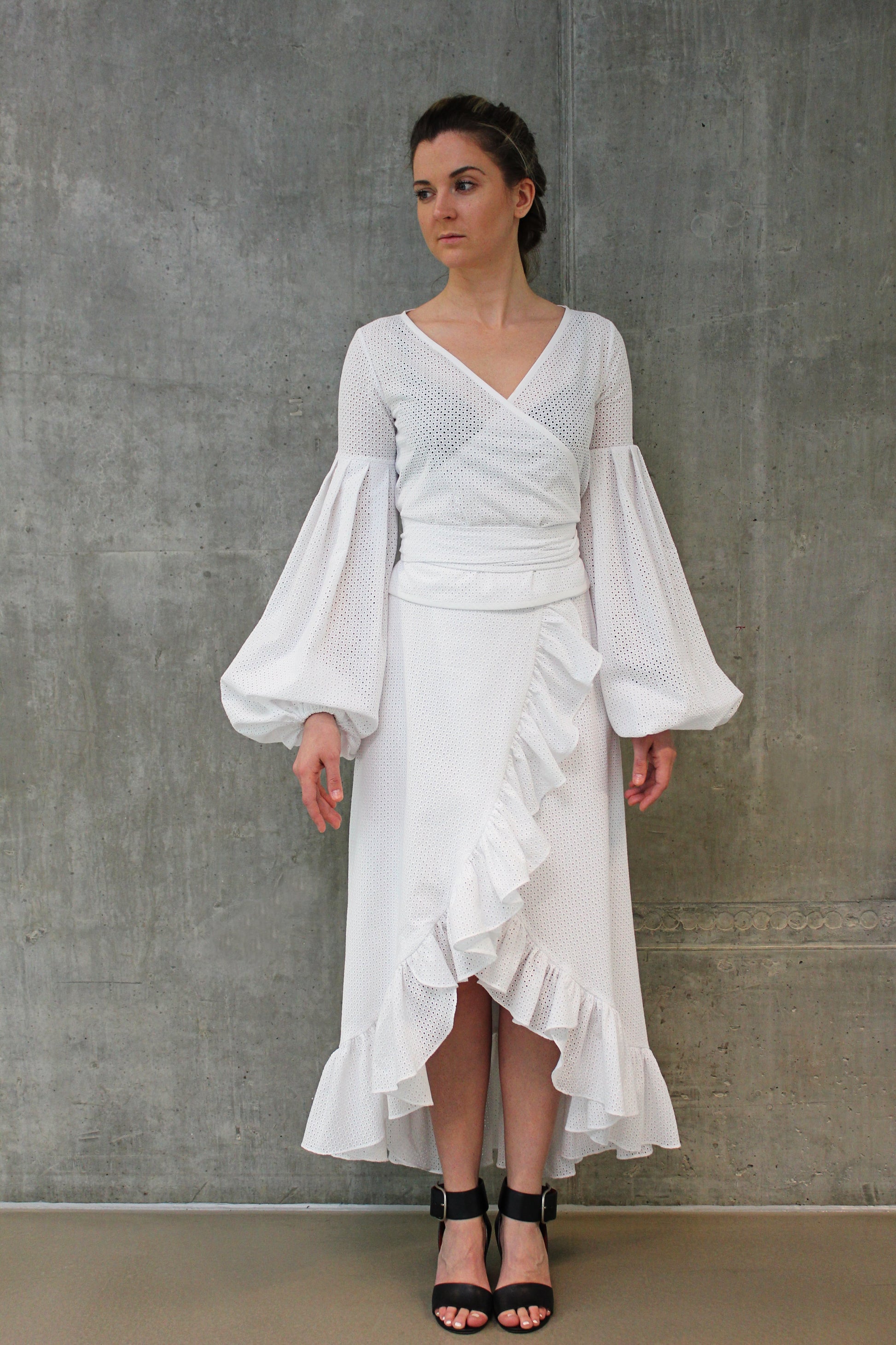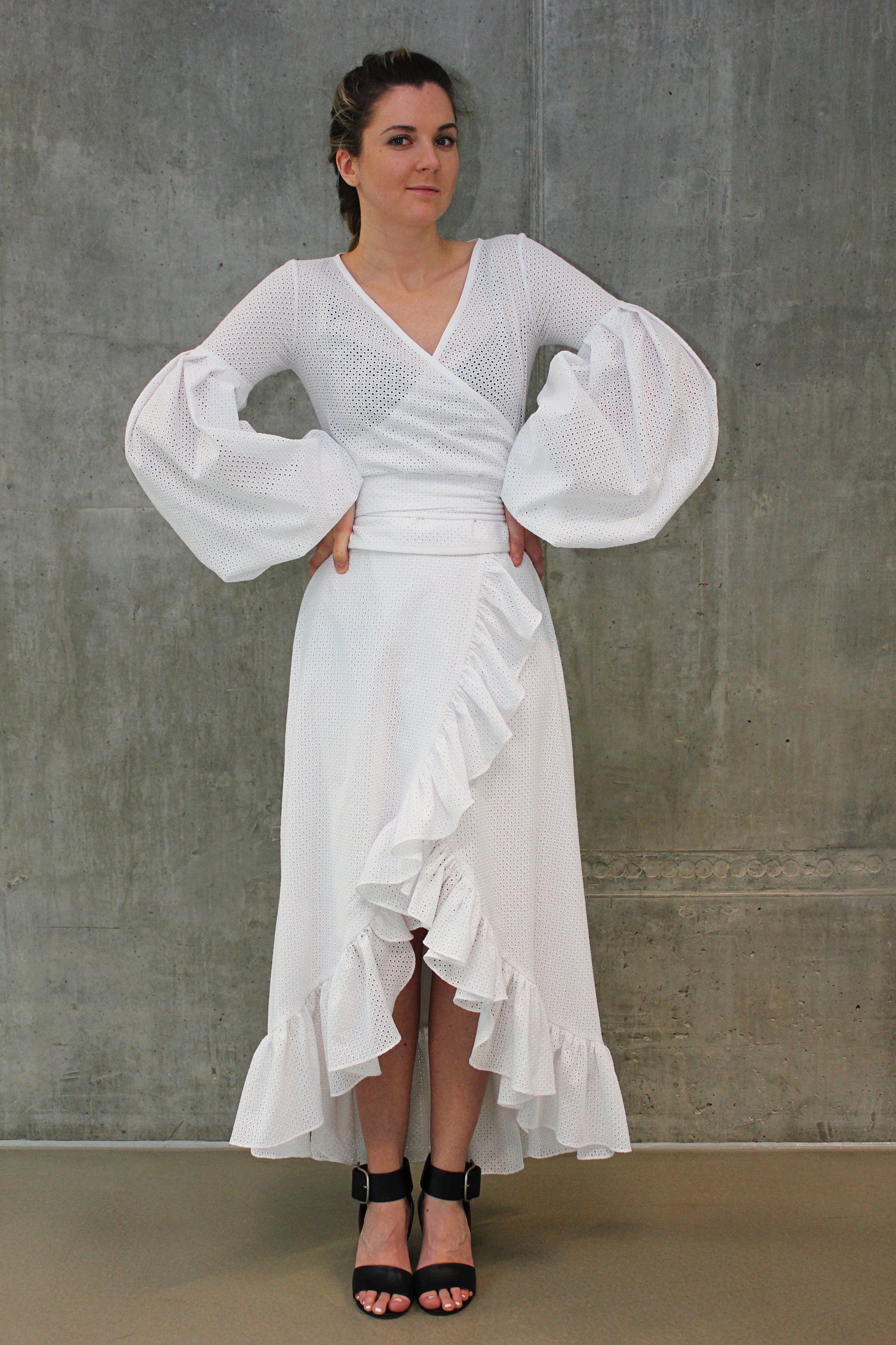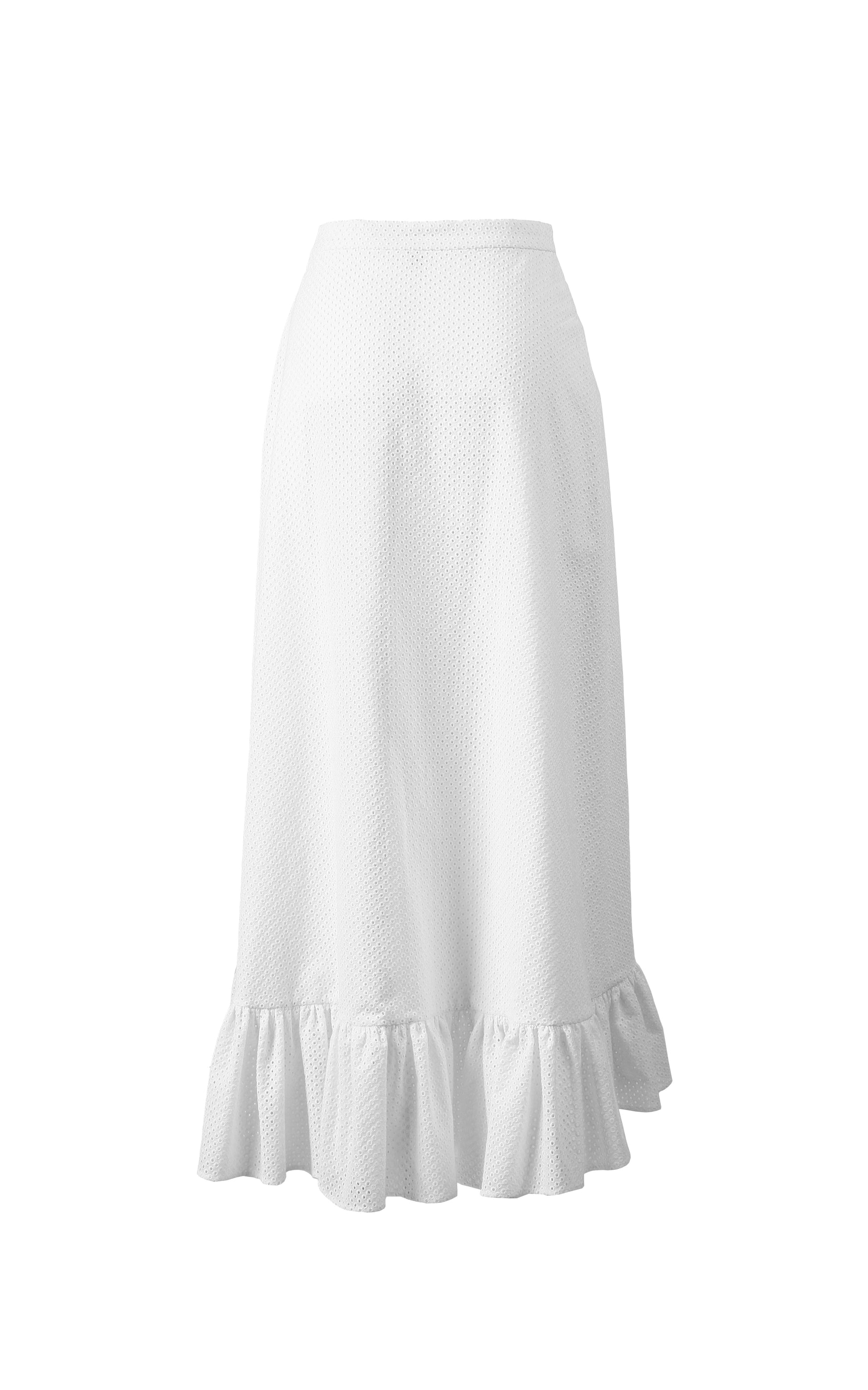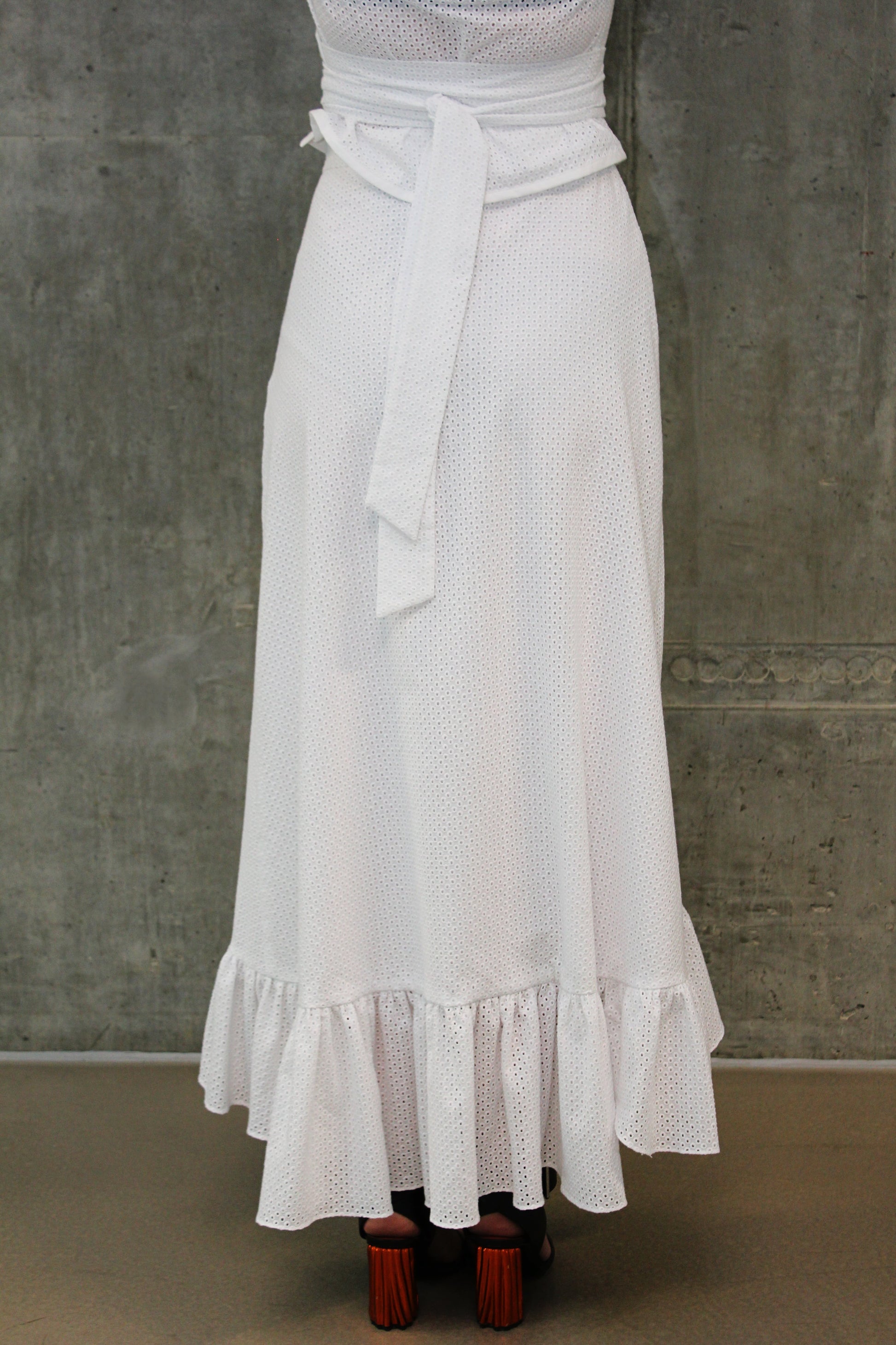 Prepare for Summer in this ANOUKI white beaut dot-cut-out-lace skirt. It has a wrapped skirt design to create an open front slit in a midi length.