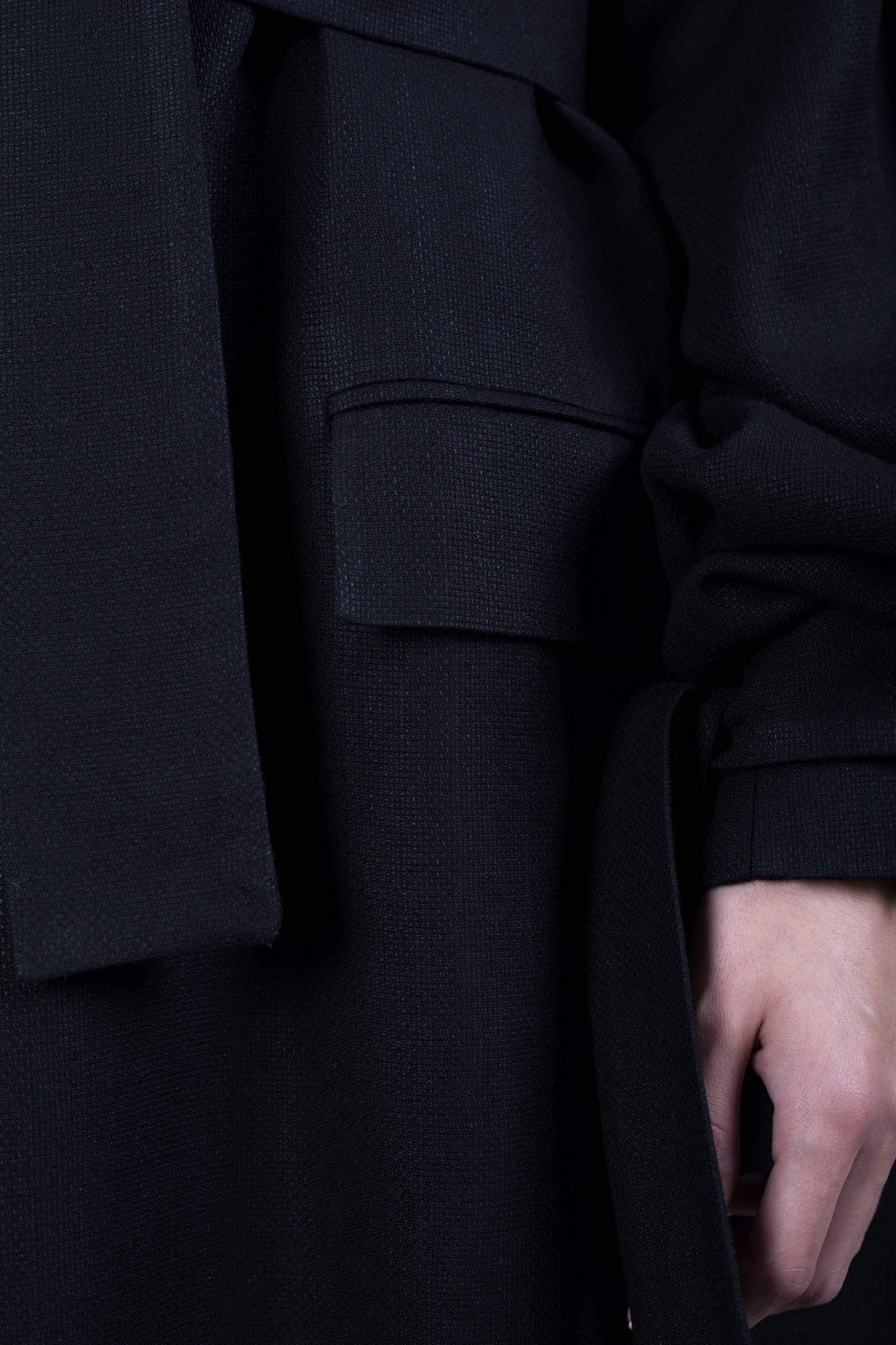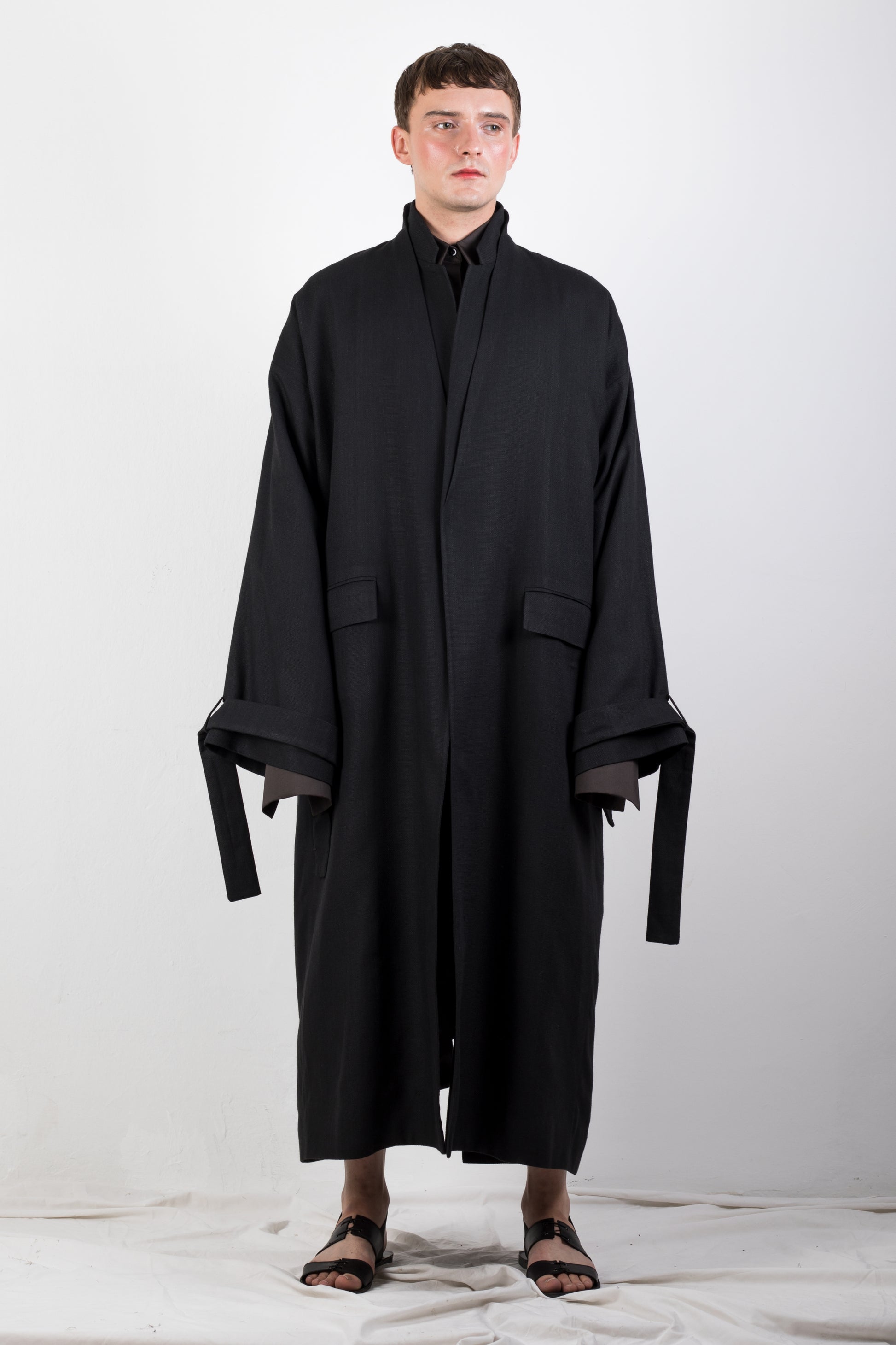 This handmade Double Collar Flax Coat features a boxy silhouette and elongated style. It is constructed from 100% Turkish flax. The vest features two welt pockets, one internal pocket, a back centre seam vent and front snap button closure. Features one large belt and two sleeve belts.