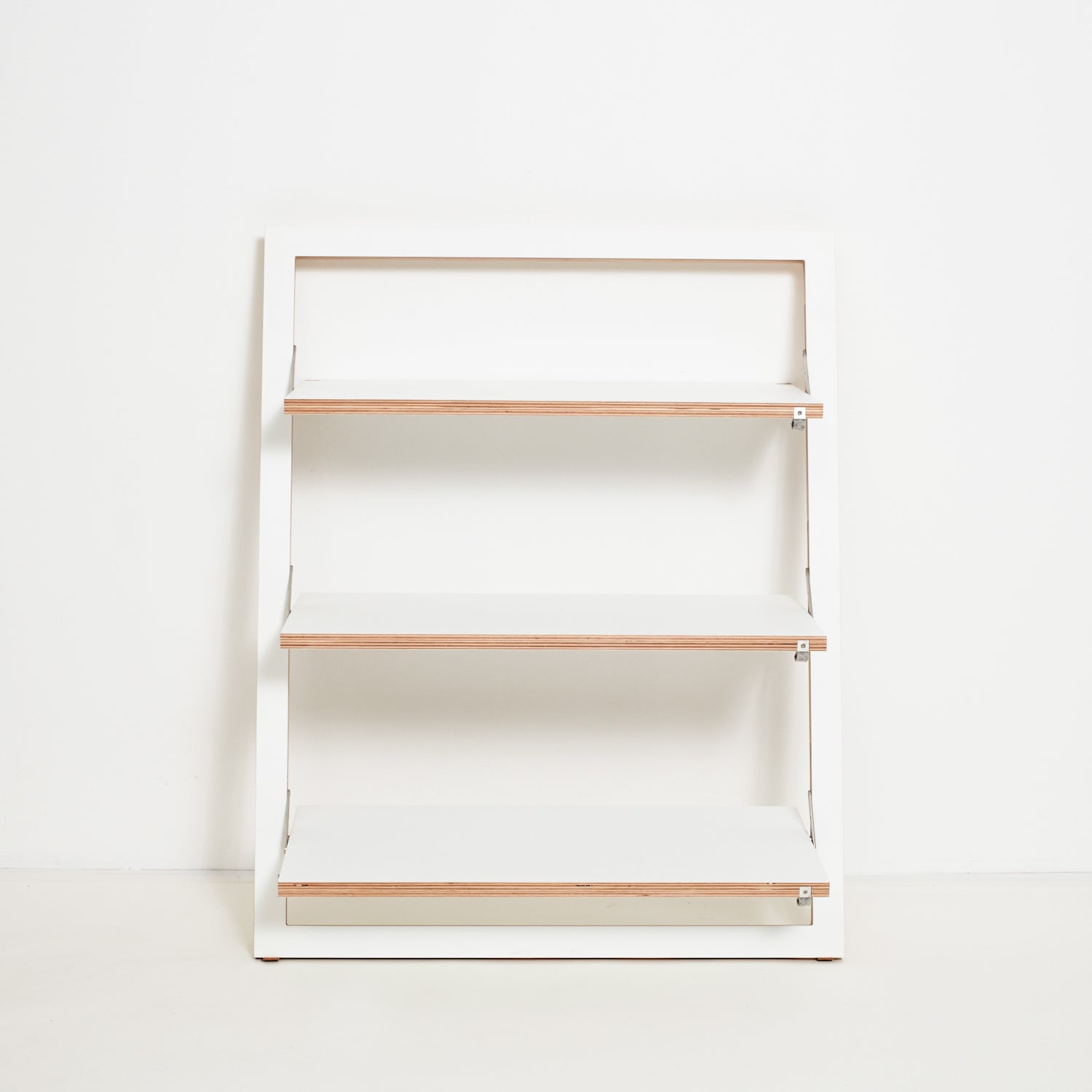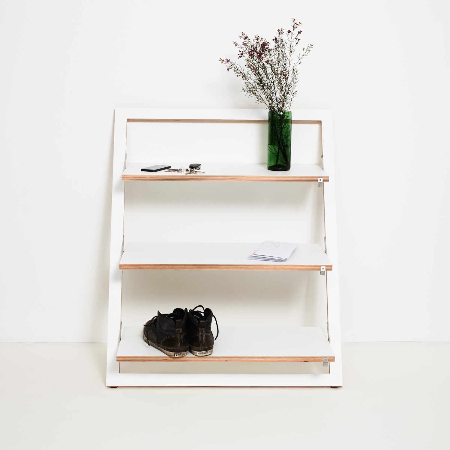 Flattened, almost invisible, and fitting in every niche! Opened up as a hall shelf, shoe shelf, key rack, bookshelf, or for everything together.