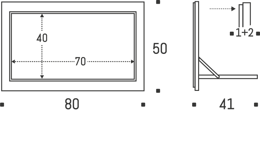 Closed: 80 x 50 x 2 cm + 1 cm wall mount