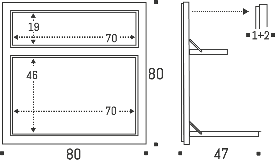 Closed: 80 x 80 x 2 cm + 1 cm wall mount