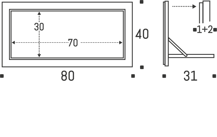Closed: 80 x 40 x 2 cm + 1 cm wall mount