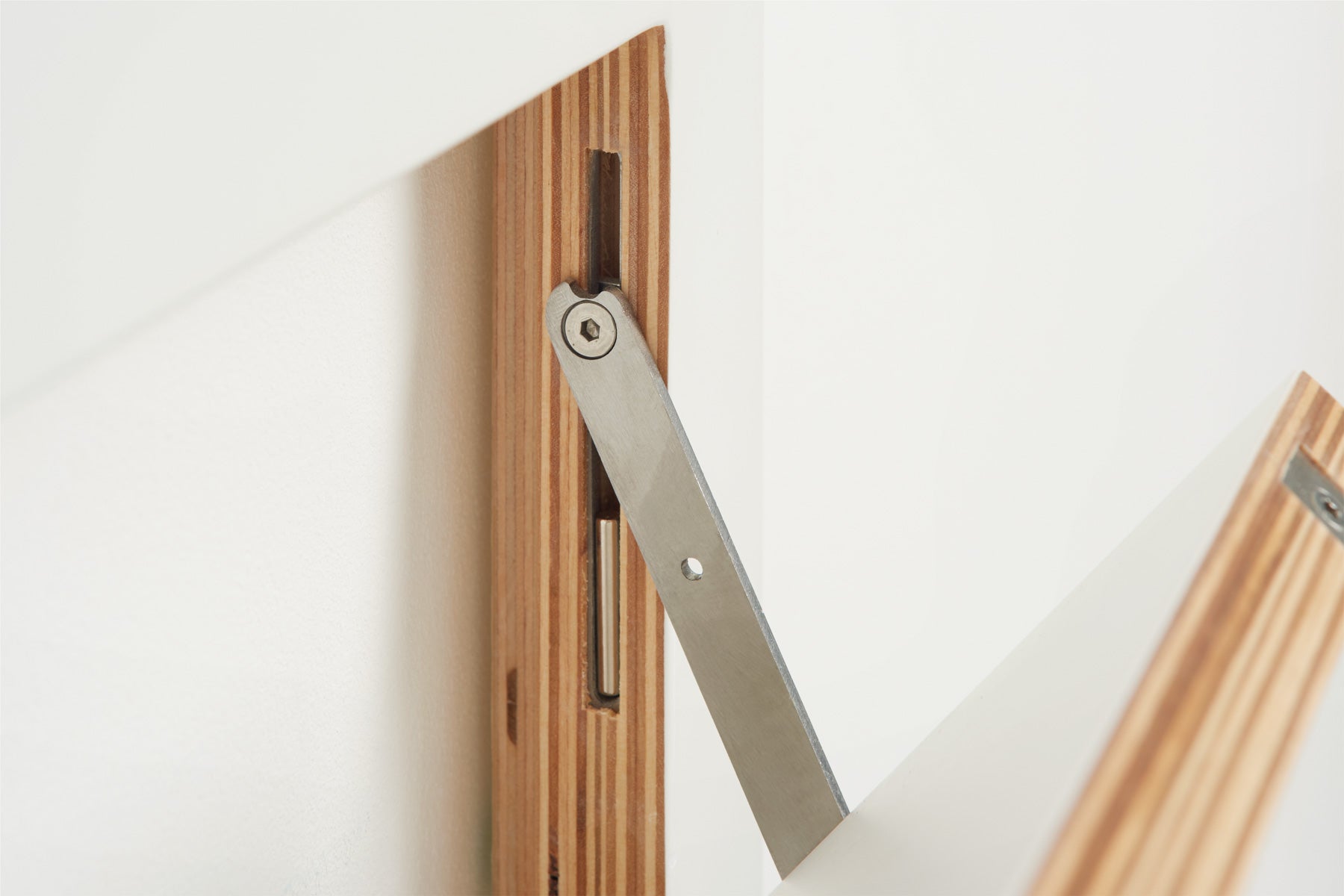 By inserting small magnetic pins into the guide rails of the hinges, the racks open only 45 degrees, allowing for convenient storage of shoes and other items that can be stored at an angle.