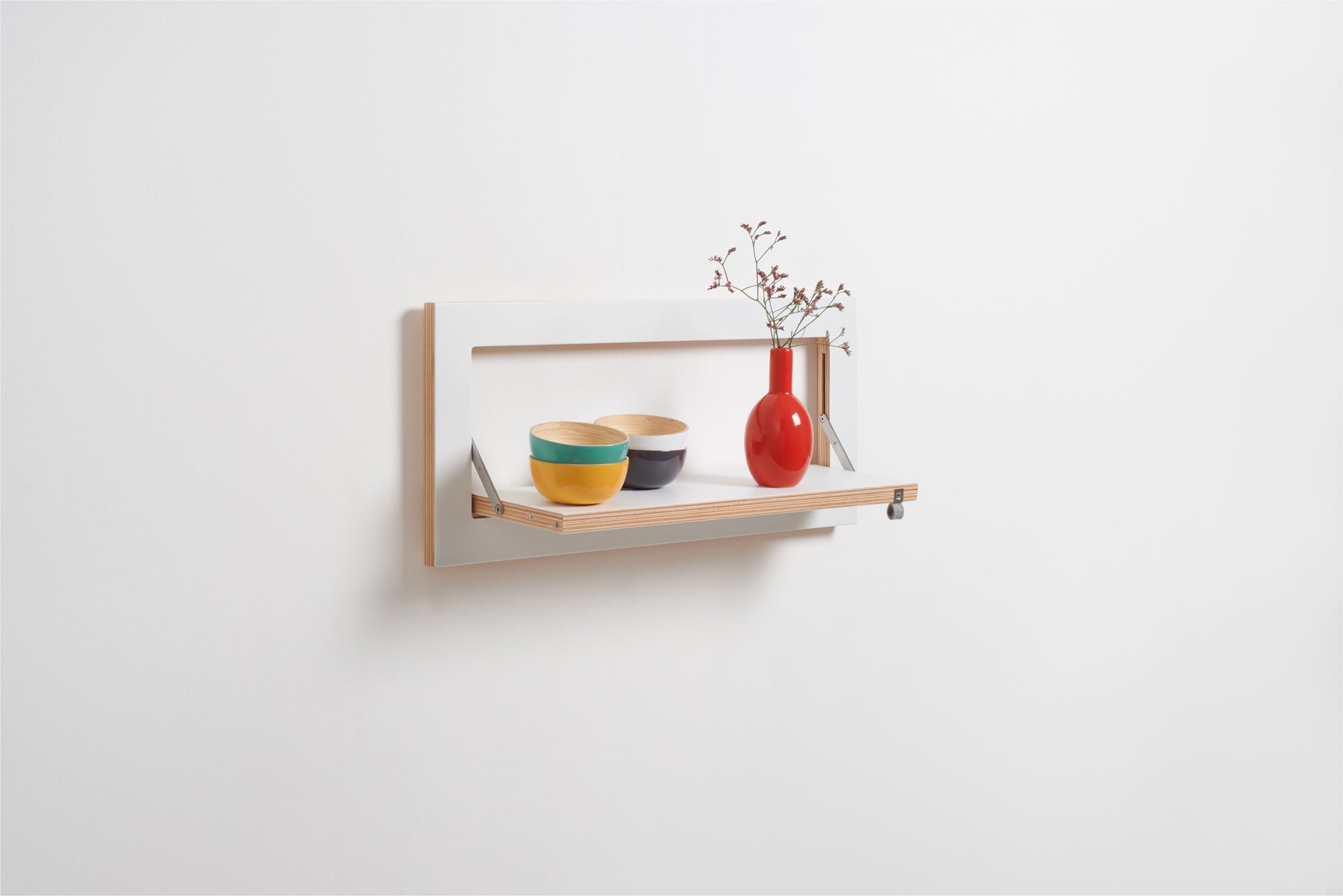 Practical and flexible storage space in a minimal area for shoes, purses, and keys, Fläpps shoe racks come in white and black colors and offer that little bit of variety in narrow hallways. The wall-mounted shoe racks remain flexible even with the add-on and can be folded away or transformed into a wall shelf as needed.