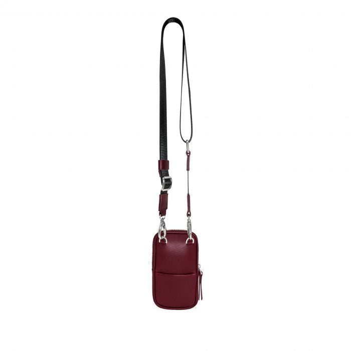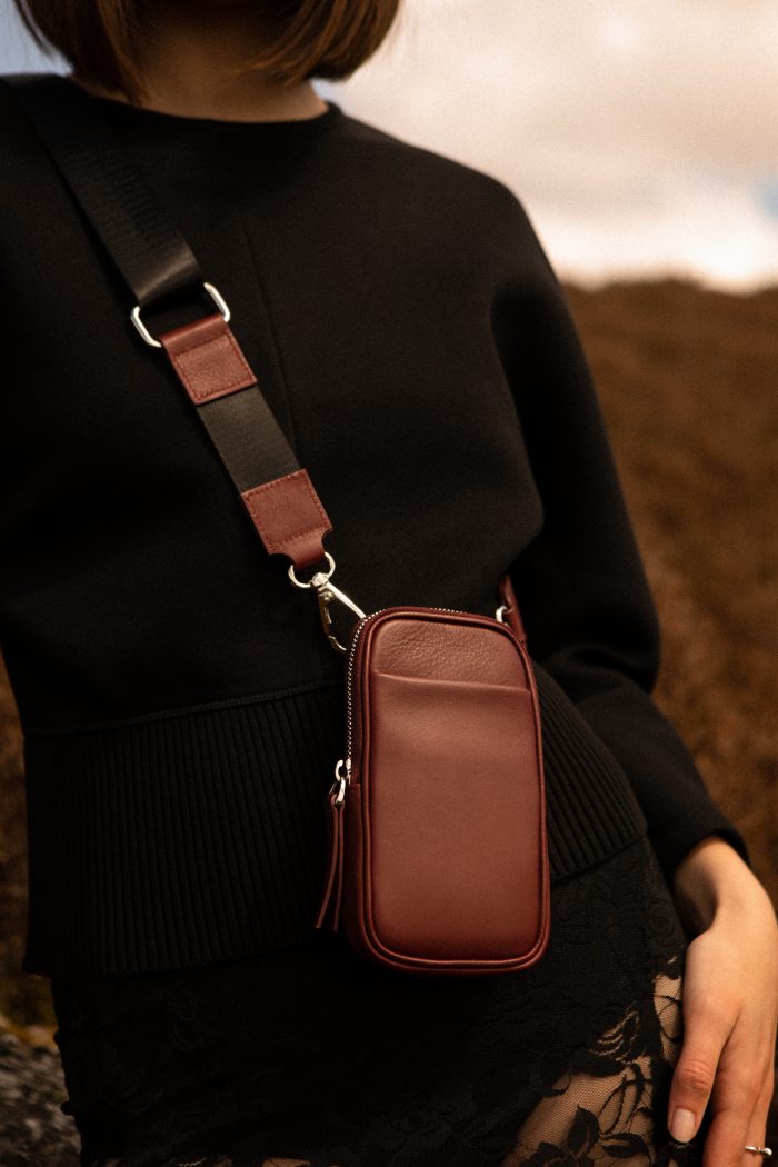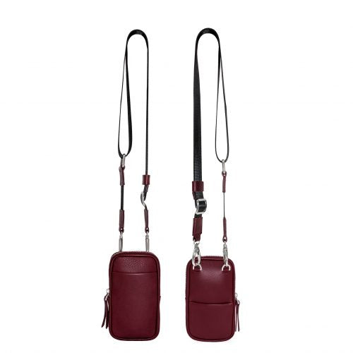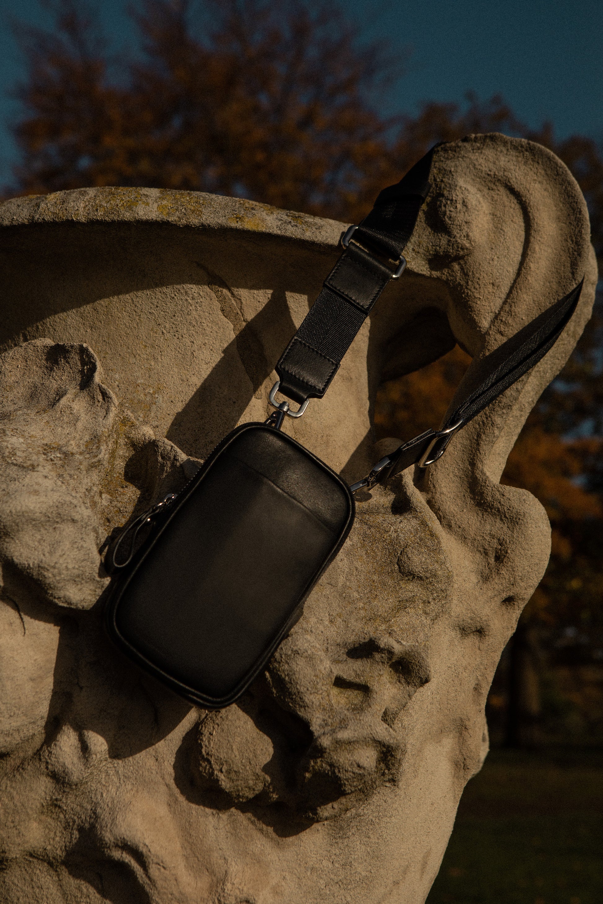 Our functional leather phone pouch is ideal for anyone who wants to travel lightweight with the bare essentials. It is made from reclaimed full-grain Italian leather and Econyl ® regenerated herringbone interior. It features detachable, extendable straps and two slip pockets for comfort and convenience, to front and back, perfect for small essentials such as your phone, small wallet, and keys.