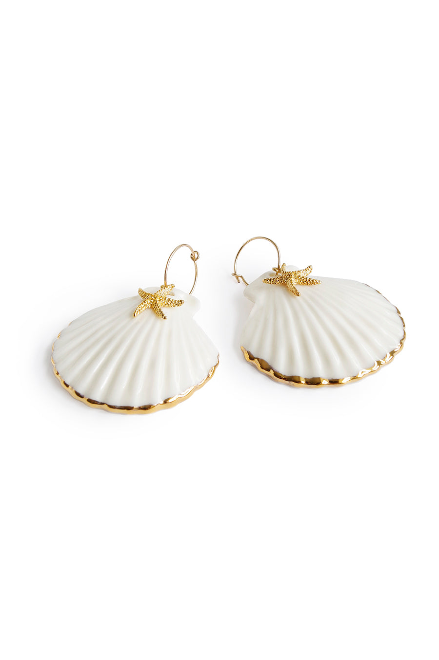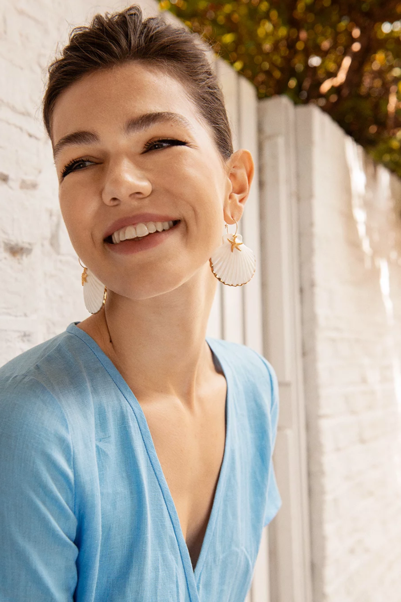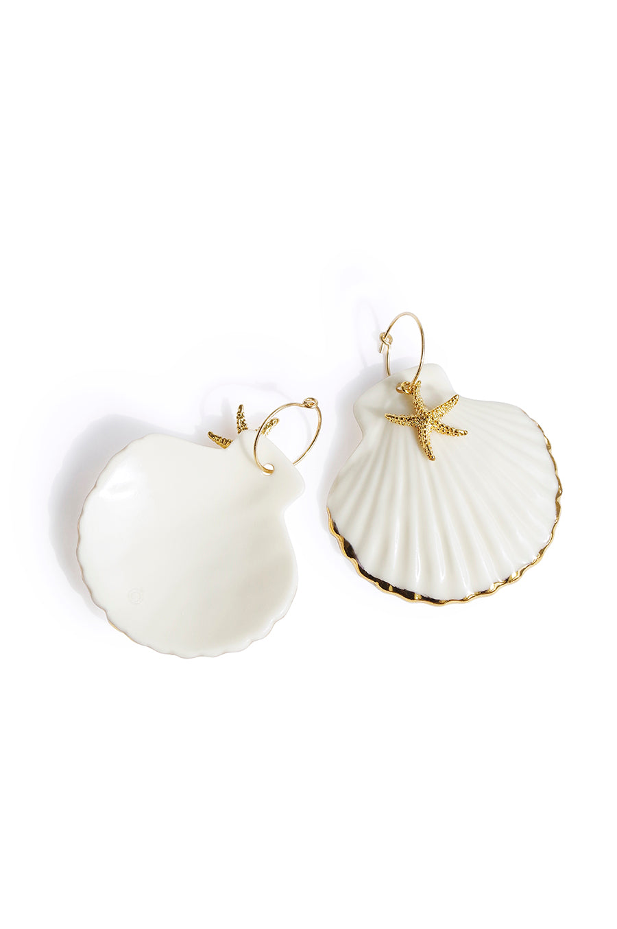 Add a touch of seaside charm to your seasonal wardrobe with our sustainably made shell earrings. Each porcelain shell is molded and handcrafted from a real clamshell, ensuring that no two earrings are exactly alike. The delicate shell edges are hand-painted with gold lustre, adding a touch of elegance to these playful earrings.