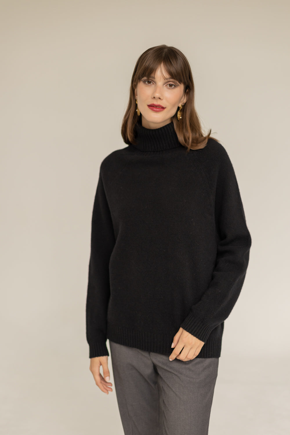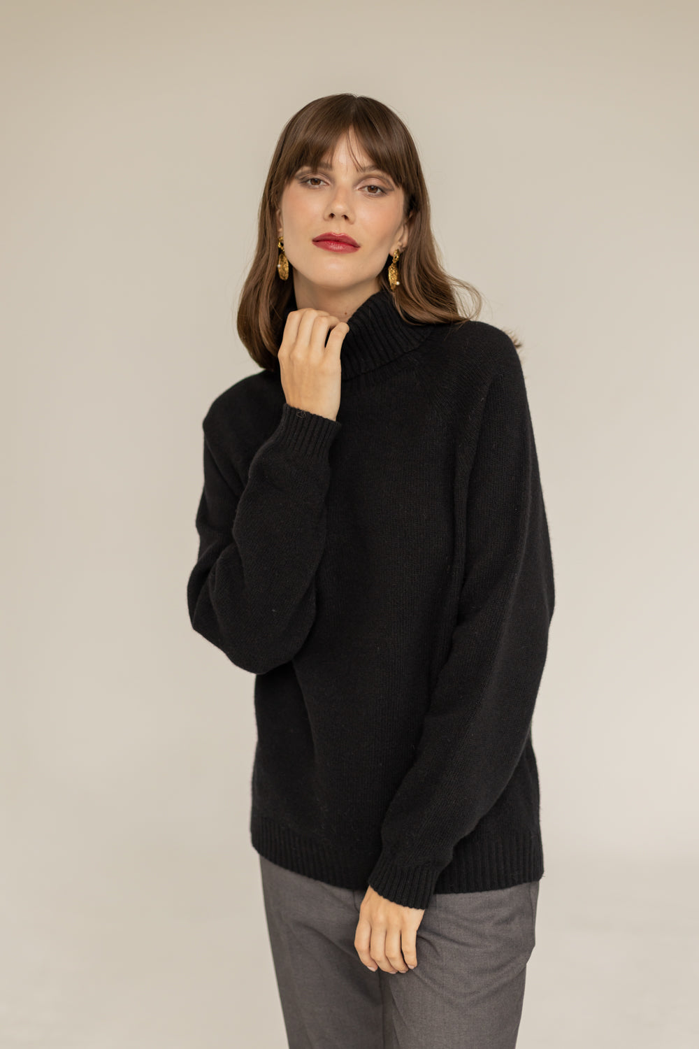 SOMEFANCYNAME.COM presents the Golf Cashmere Wool Turtleneck - Black. This luxurious sweater is locally crafted using ultra-soft Cashmere yarn and Merino Wool. Its classic silhouette and loose fit provide comfort without sacrificing style. The design features a cozy turtleneck, slightly dropped shoulders, and kimono sleeves; perfect for adding warmth while avoiding the need for a scarf.
