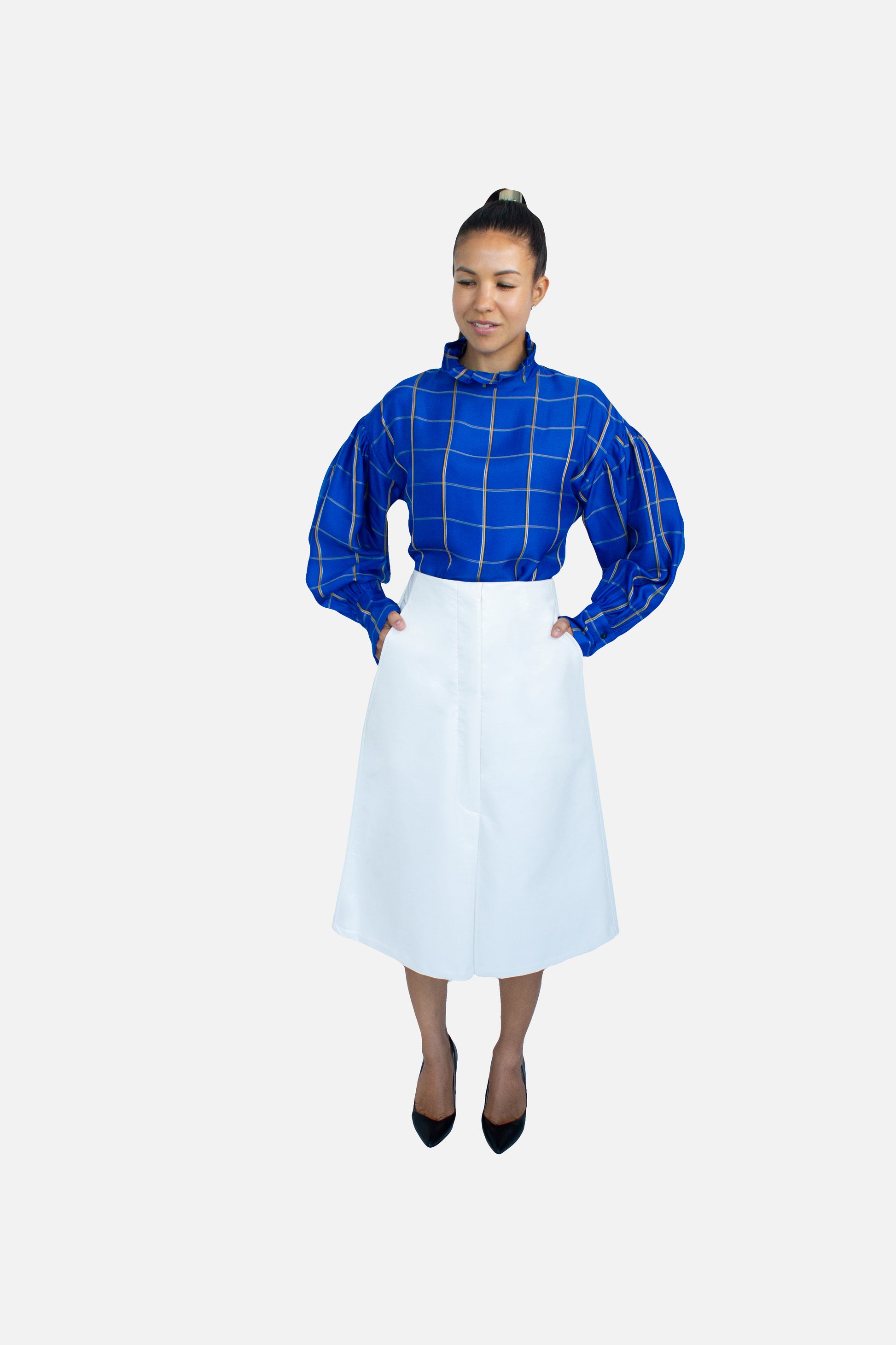 White midi skirt from TELA featuring a high rise, rear patch pockets and side slit pockets