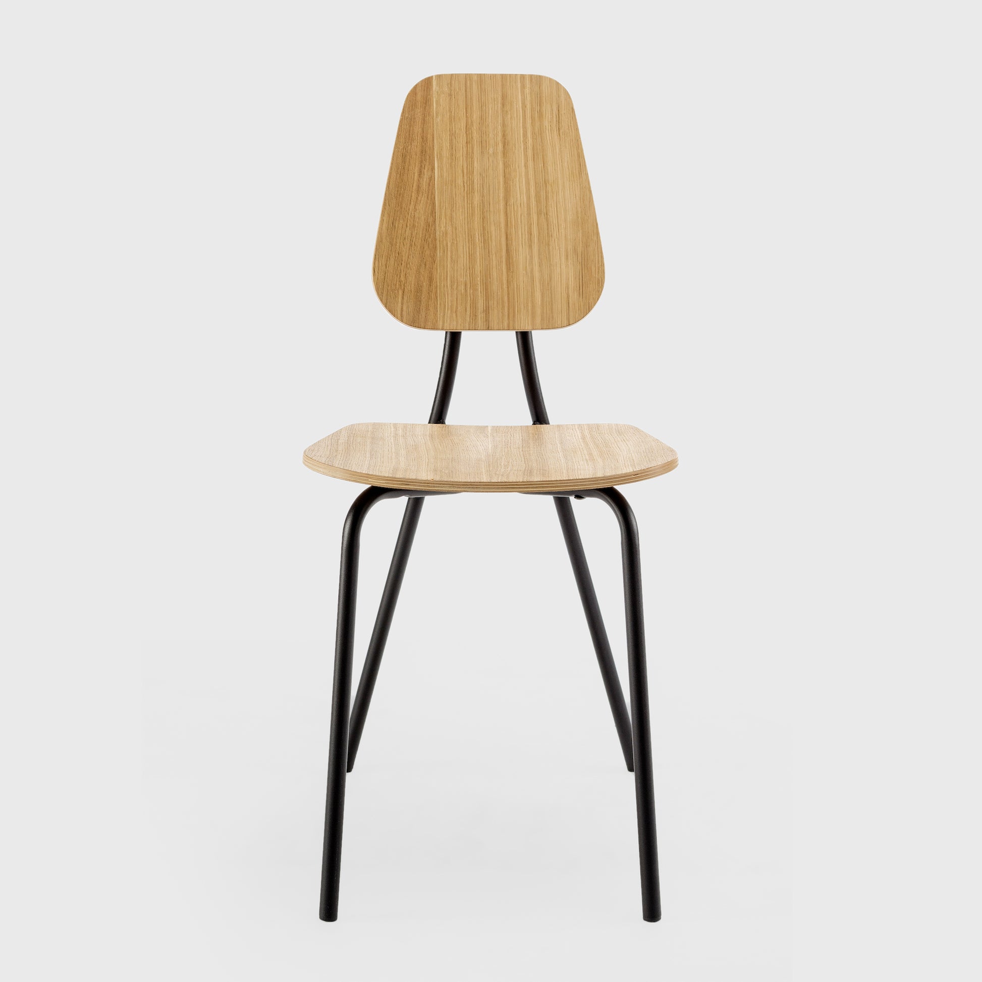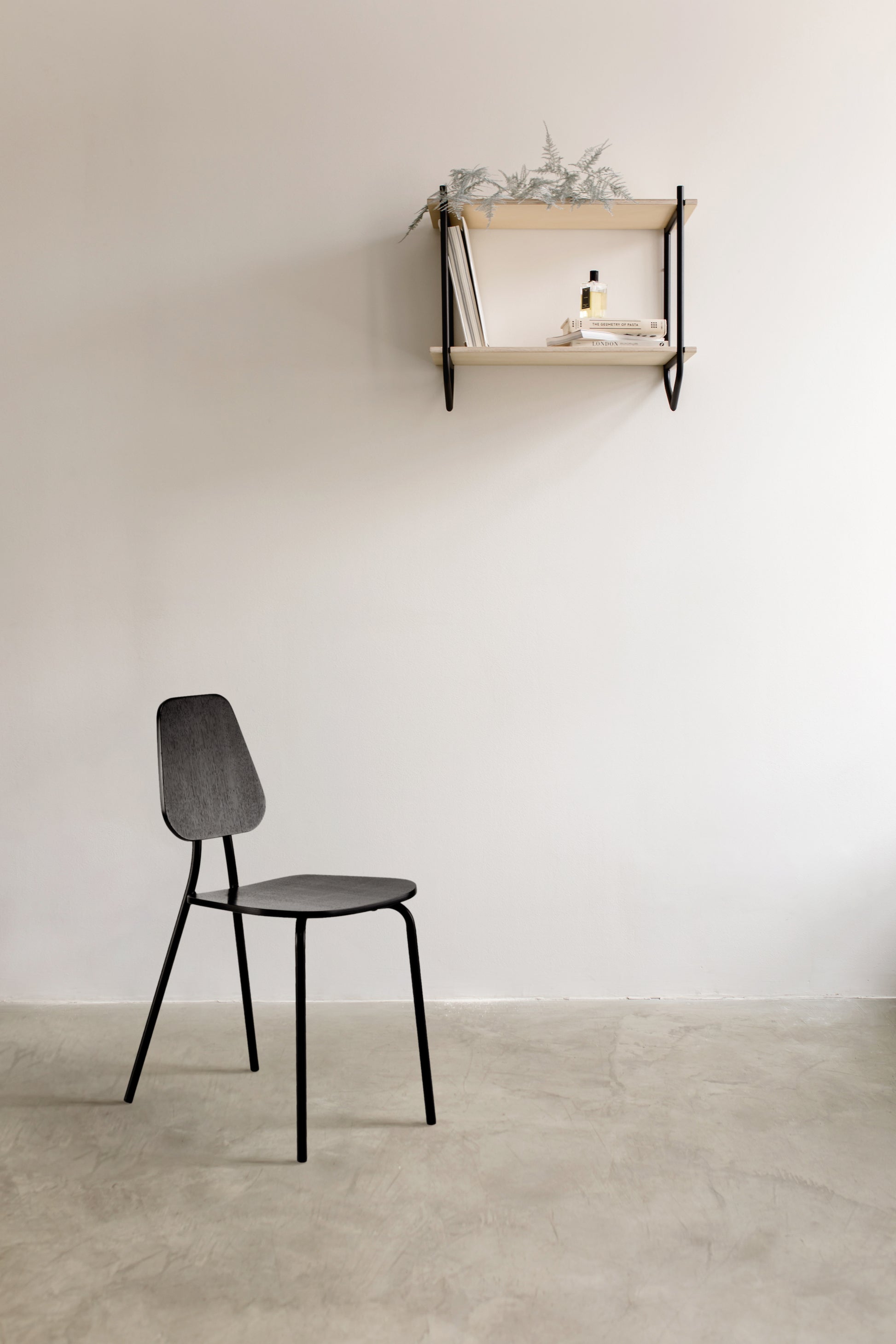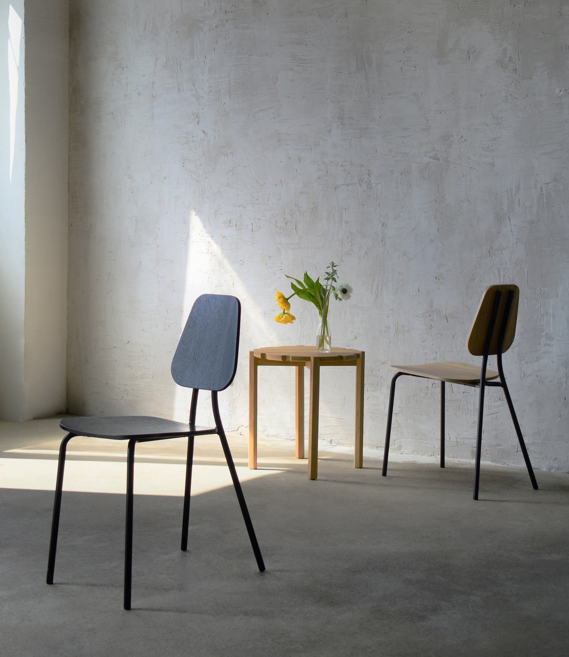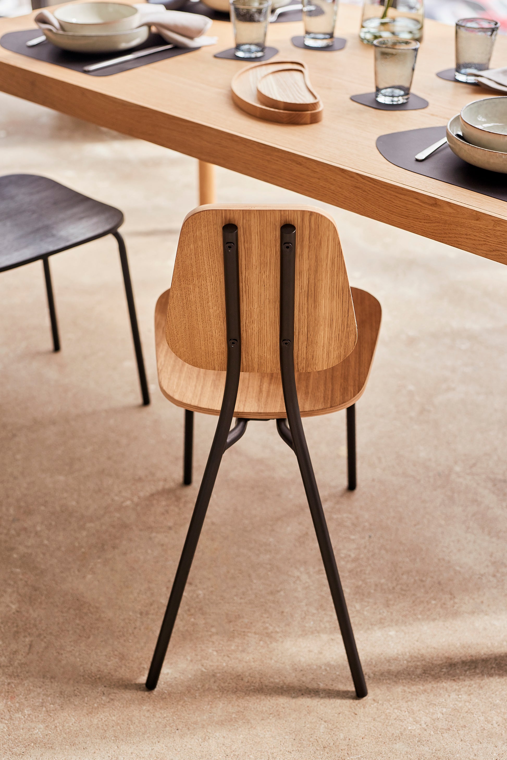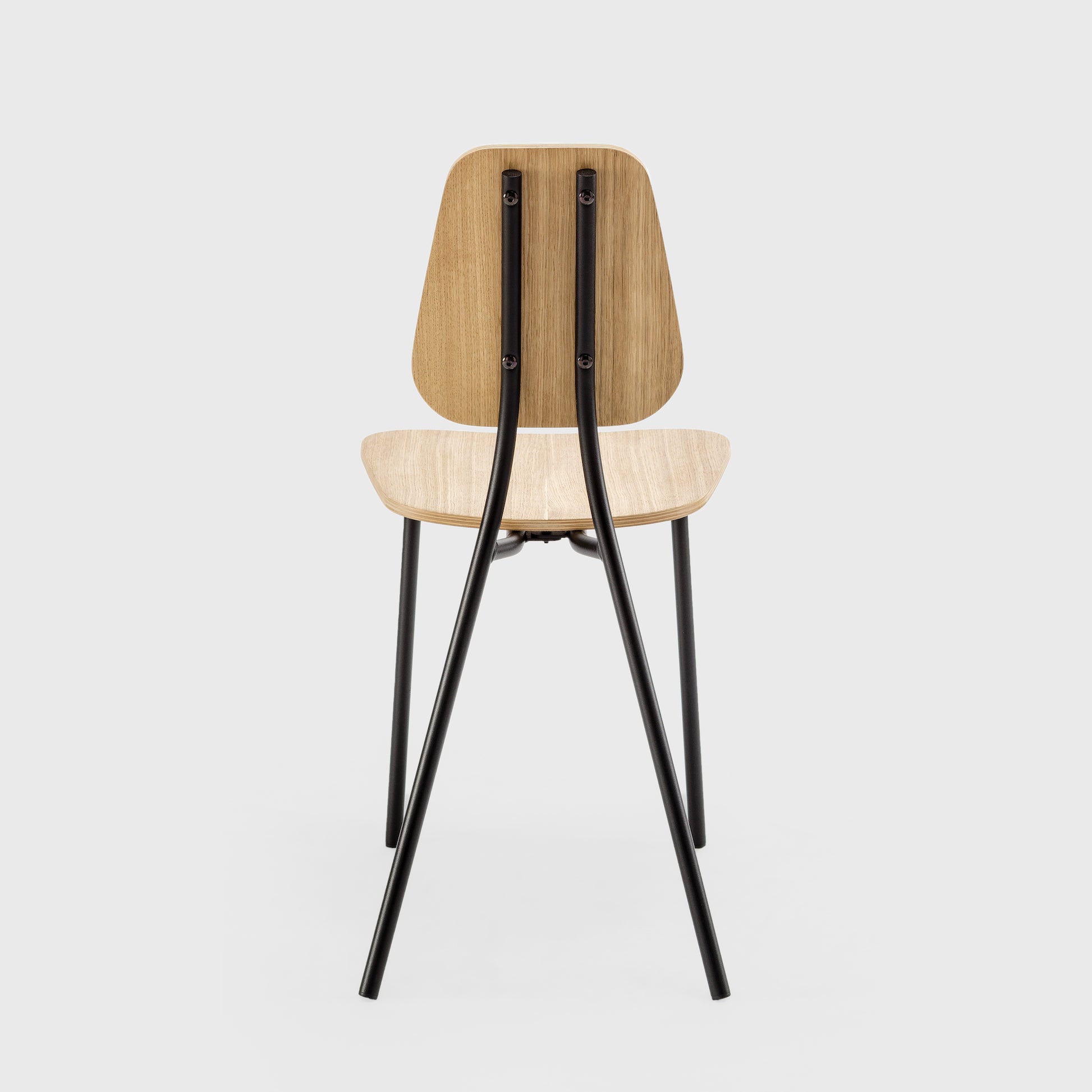 Hoya chair consists of a black metal frame and veneered plywood backrest and seat, available in two finishes — natural oil and black. Compact Hoya chairs are also stackable and come in a flat pack, this way being sustainable in terms of transportation and packaging.
